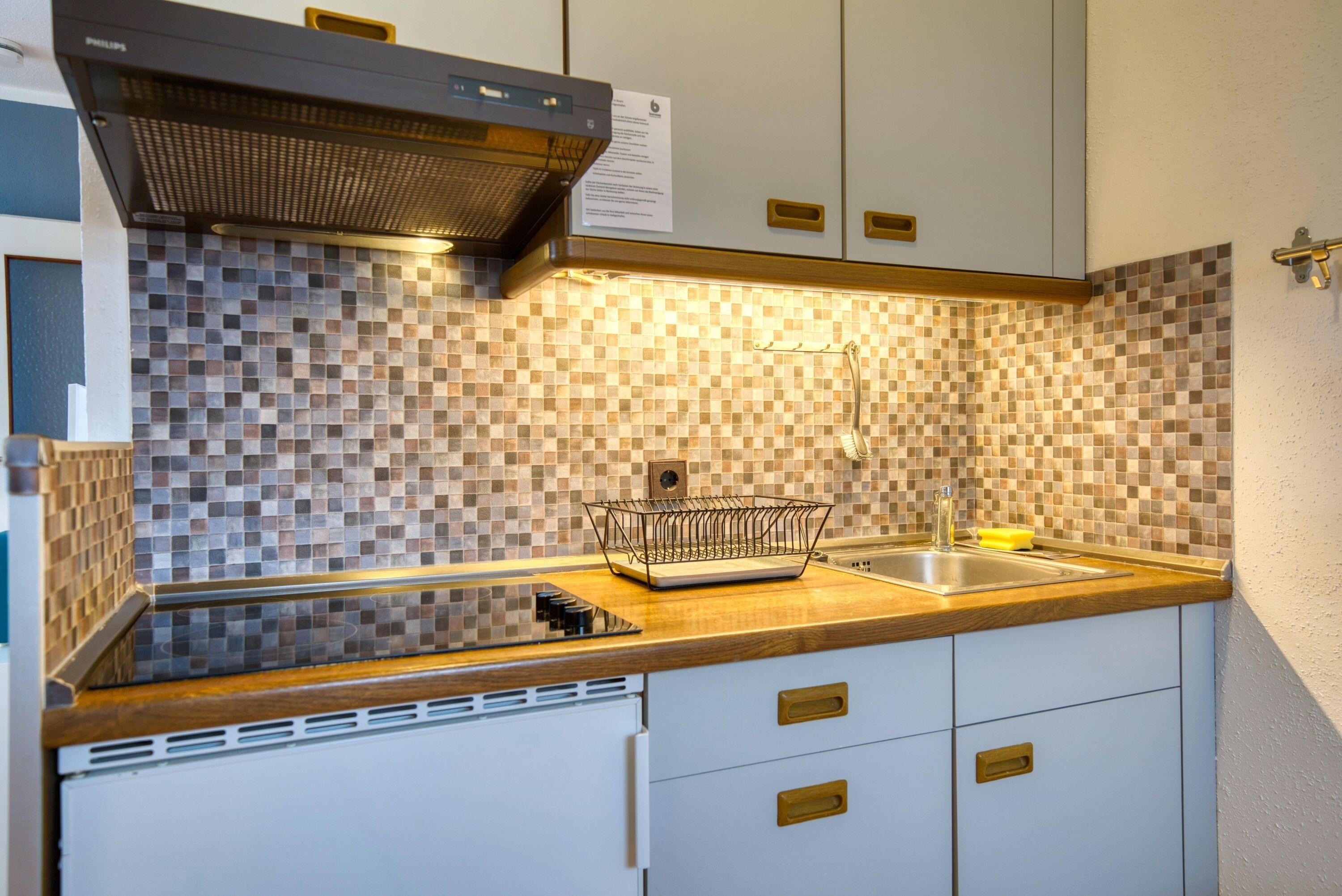 Die Küche ist ausgestattet mit 3-Platten-Cerankochfeld, Kühlschrank mit Gefrierfach und den wichtigsten Küchenutensilien. Das Badezimmer bietet Duschkabine und WC.
