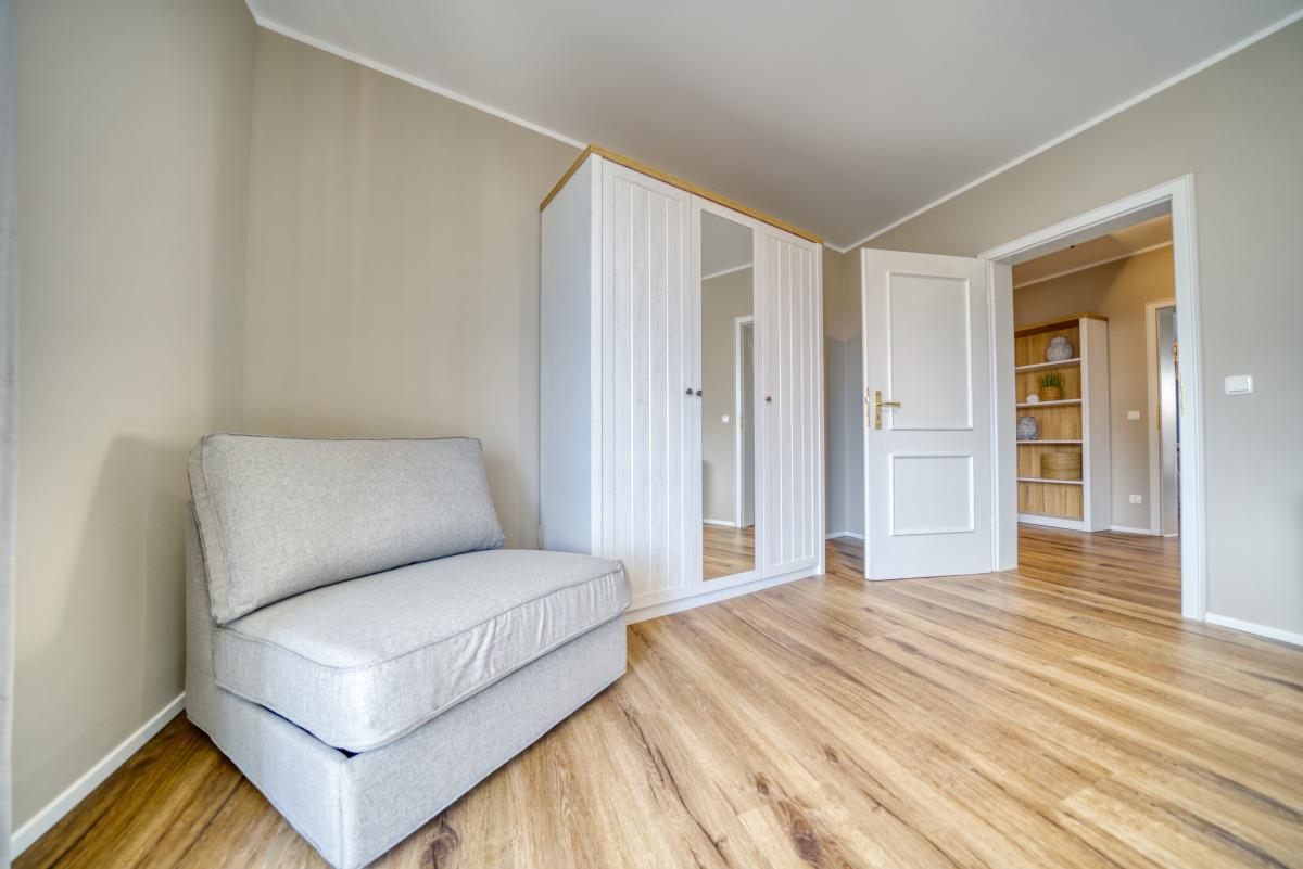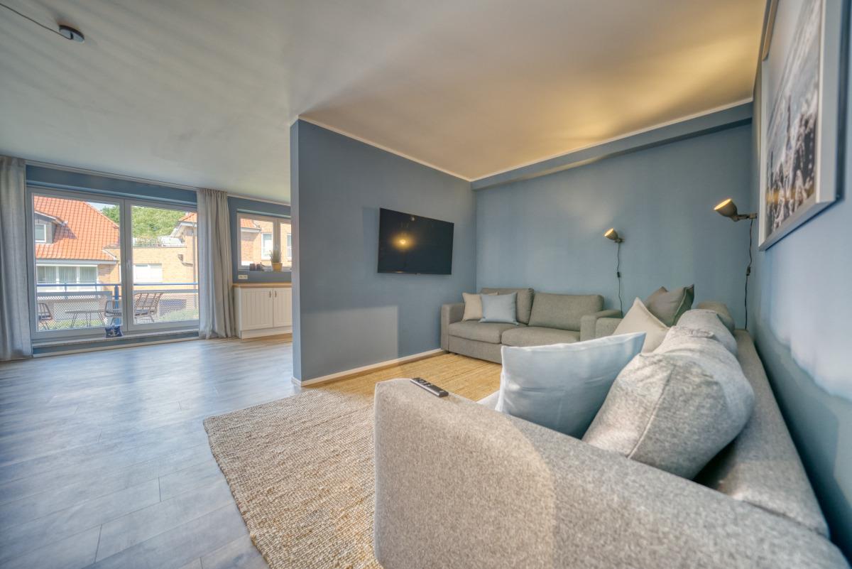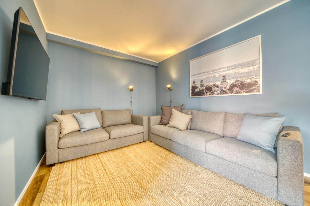 Ausstattung: Zwei Balkone (einer mit Markise), Wohnzimmer mit Sofaecke, Esstisch, 55-Zoll-Smart-TV, Küche mit Backofen, Herd, Geschirrspüler, Retro-Kühlschrank, Kaffeemaschine, Toaster, Wasserkocher. Zwei Schlafzimmer mit TV und Kleiderschrank, Bad mit Regendusche, separates WC. Waschmaschine mit Trocknerfunktion.