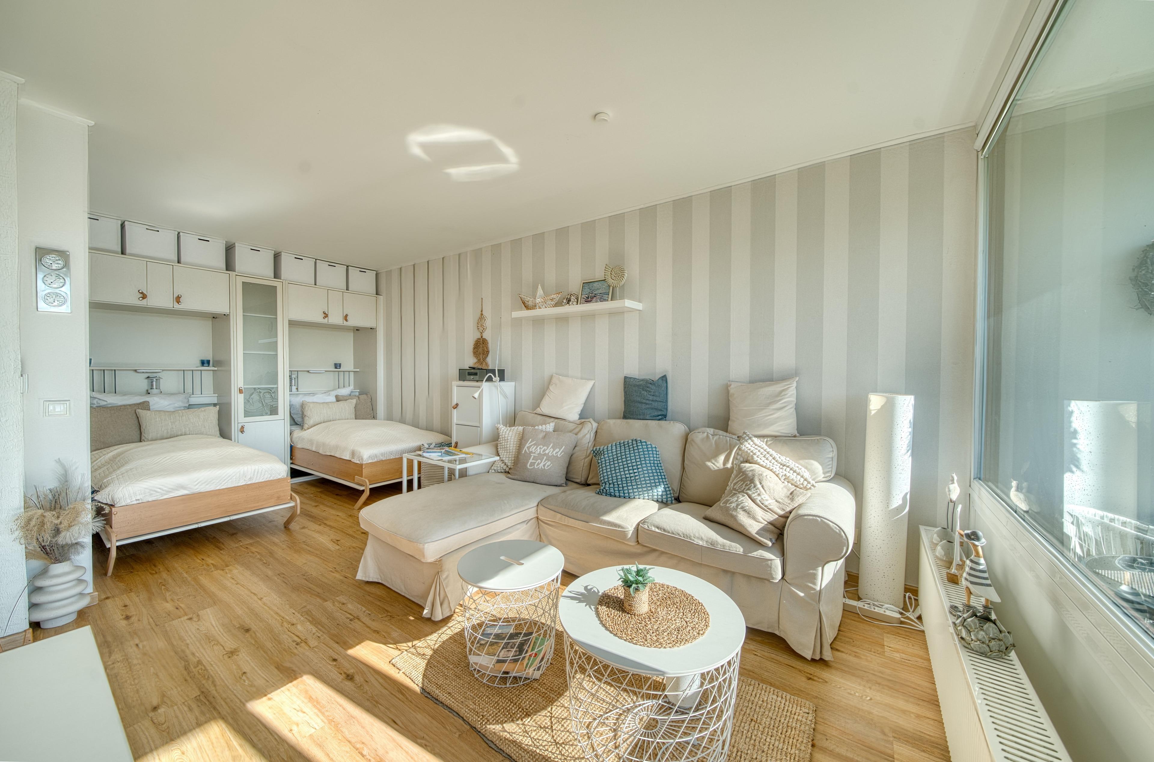 Wohn-/Schlafbereich mit Couch und zwei Schrankbetten