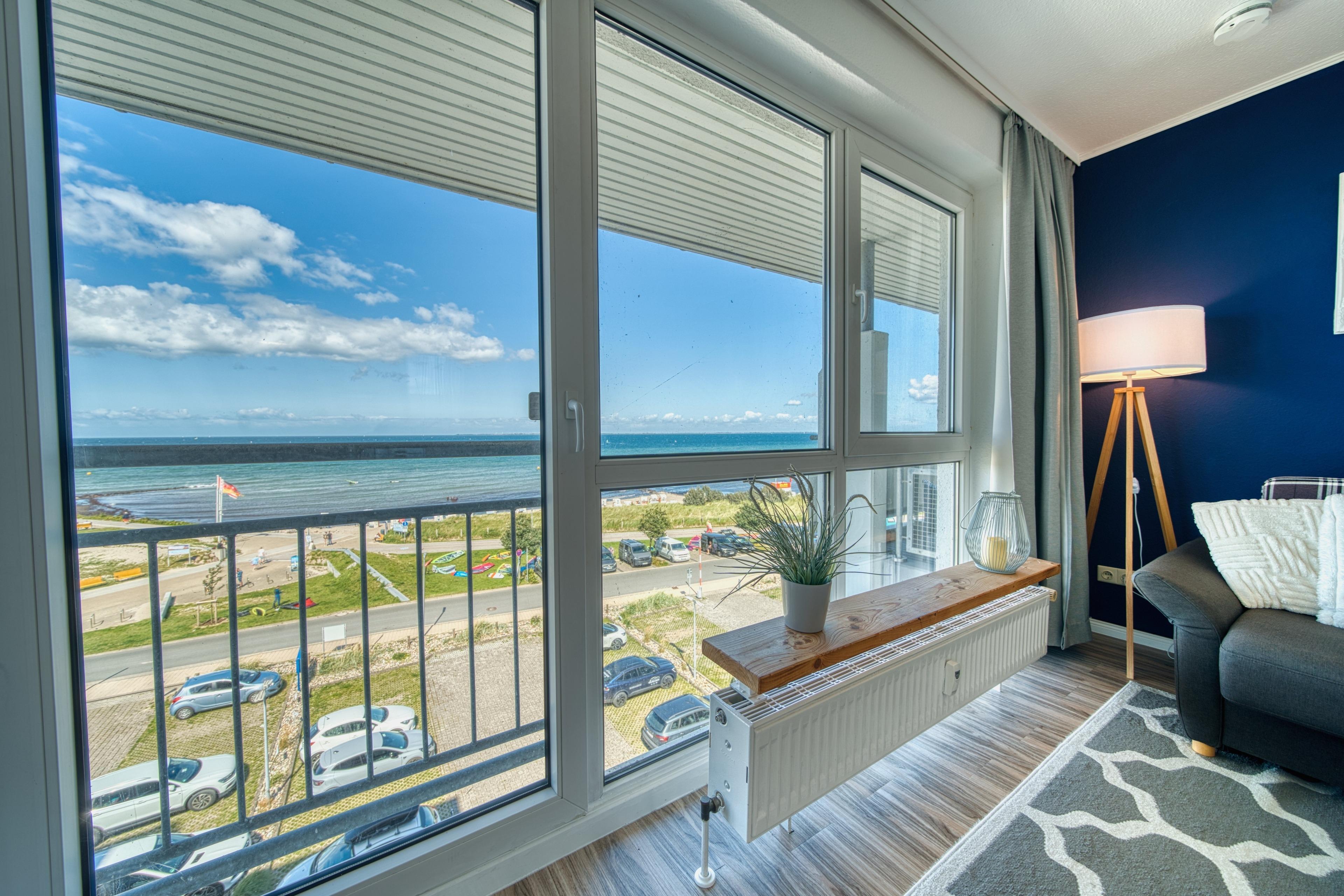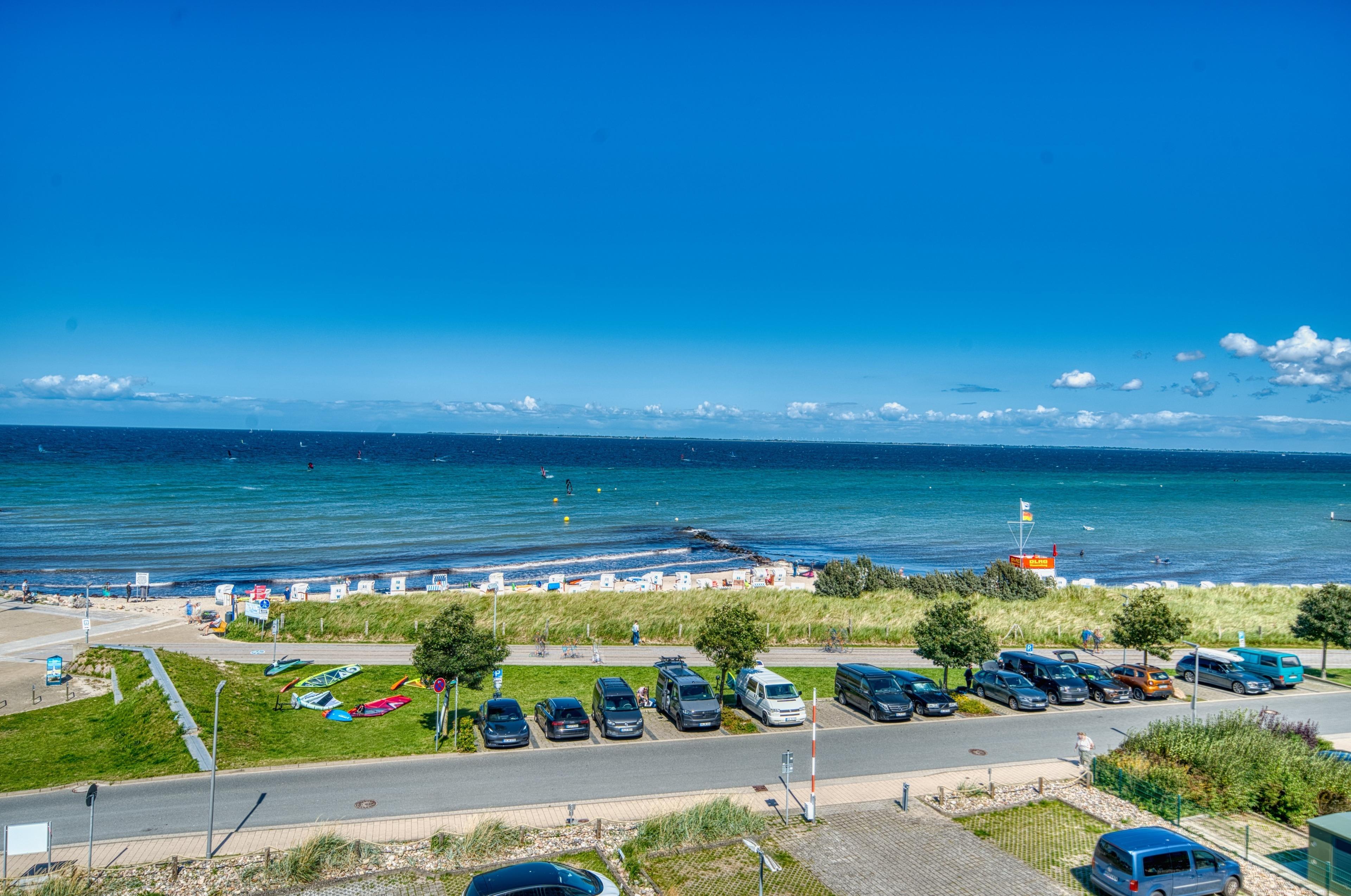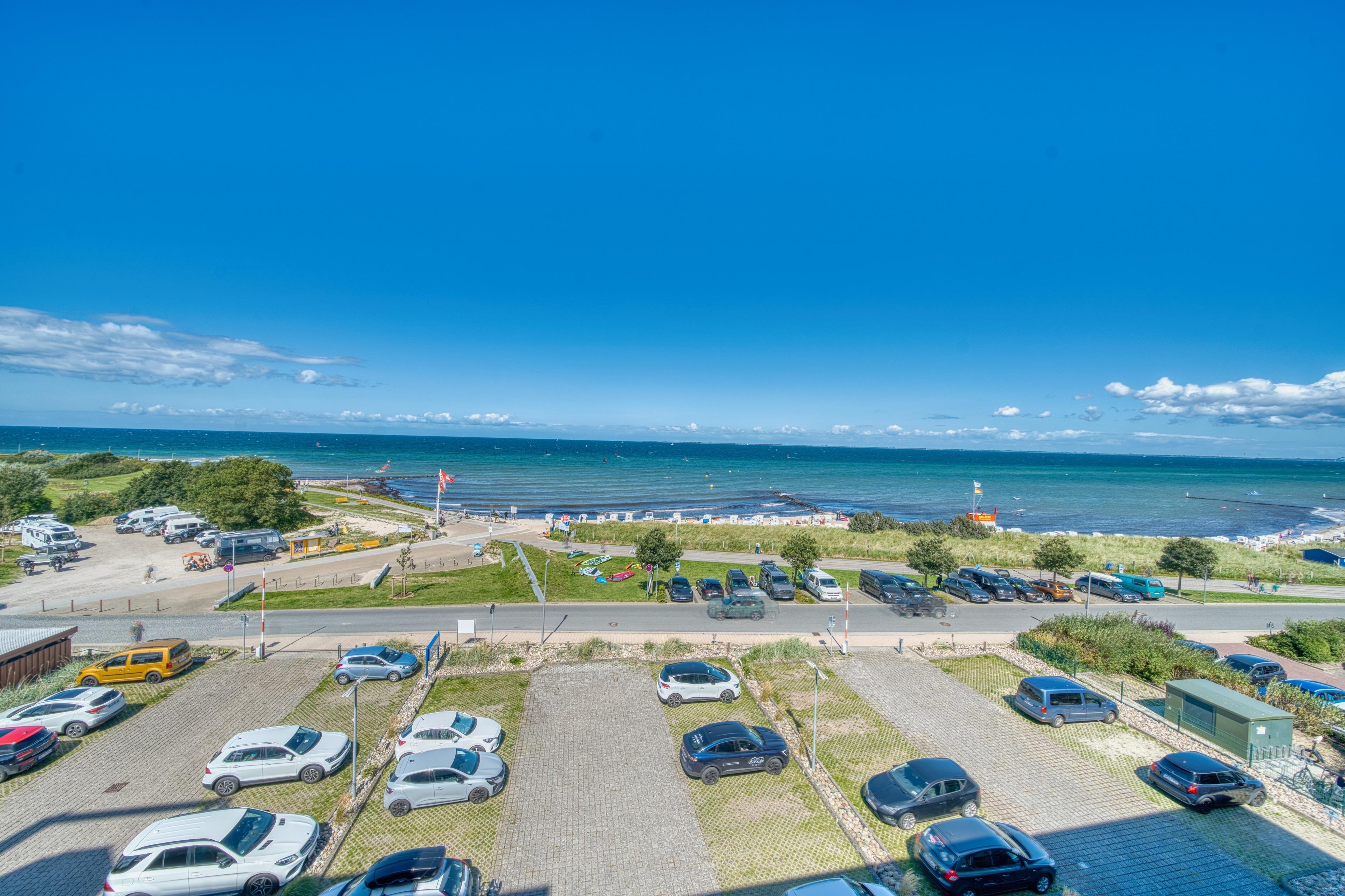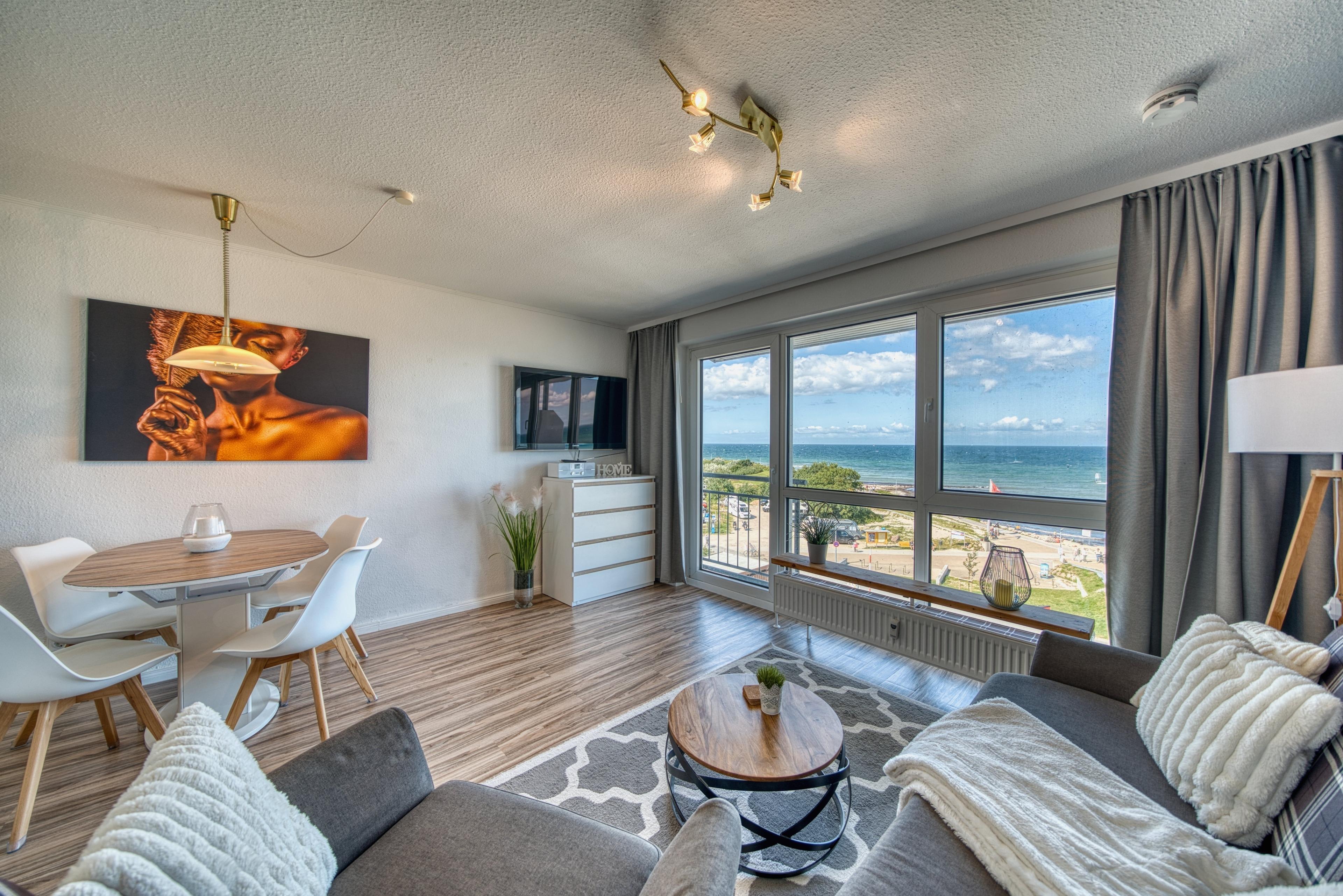 Helle 56?m² Penthouse-Wohnung mit Panoramablick auf Ostsee und Strand. Wohnbereich mit Couch, TV, WLAN, Essbereich; Schlafzimmer mit Doppelbett, zusätzlich Doppelschlafcouch im Wohnbereich. Offene, voll ausgestattete Küche mit Geschirrspüler, Cerankochfeld, Backofen und Mikrowelle. Bad mit Dusche, WC, Föhn. Zwei Außenbereiche: möblierter Nordbalkon mit Ostseeblick, Südterrasse mit Loungebereich. Fahrstuhl, eigener PKW-Stellplatz, Waschmaschine/Trockner im Haus (gegen Gebühr), Fahrradabstellplatz. Nichtraucher, keine Haustiere.