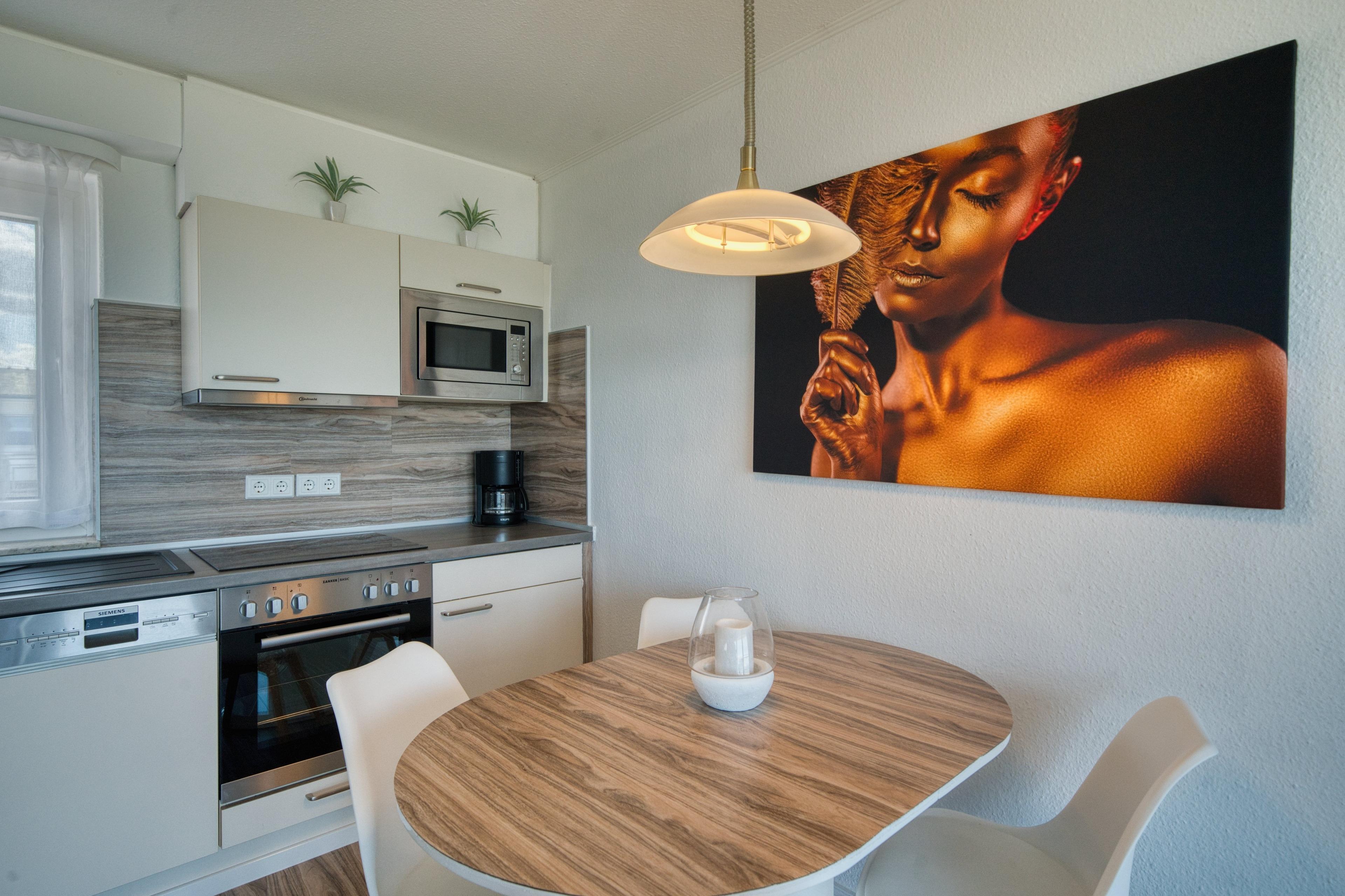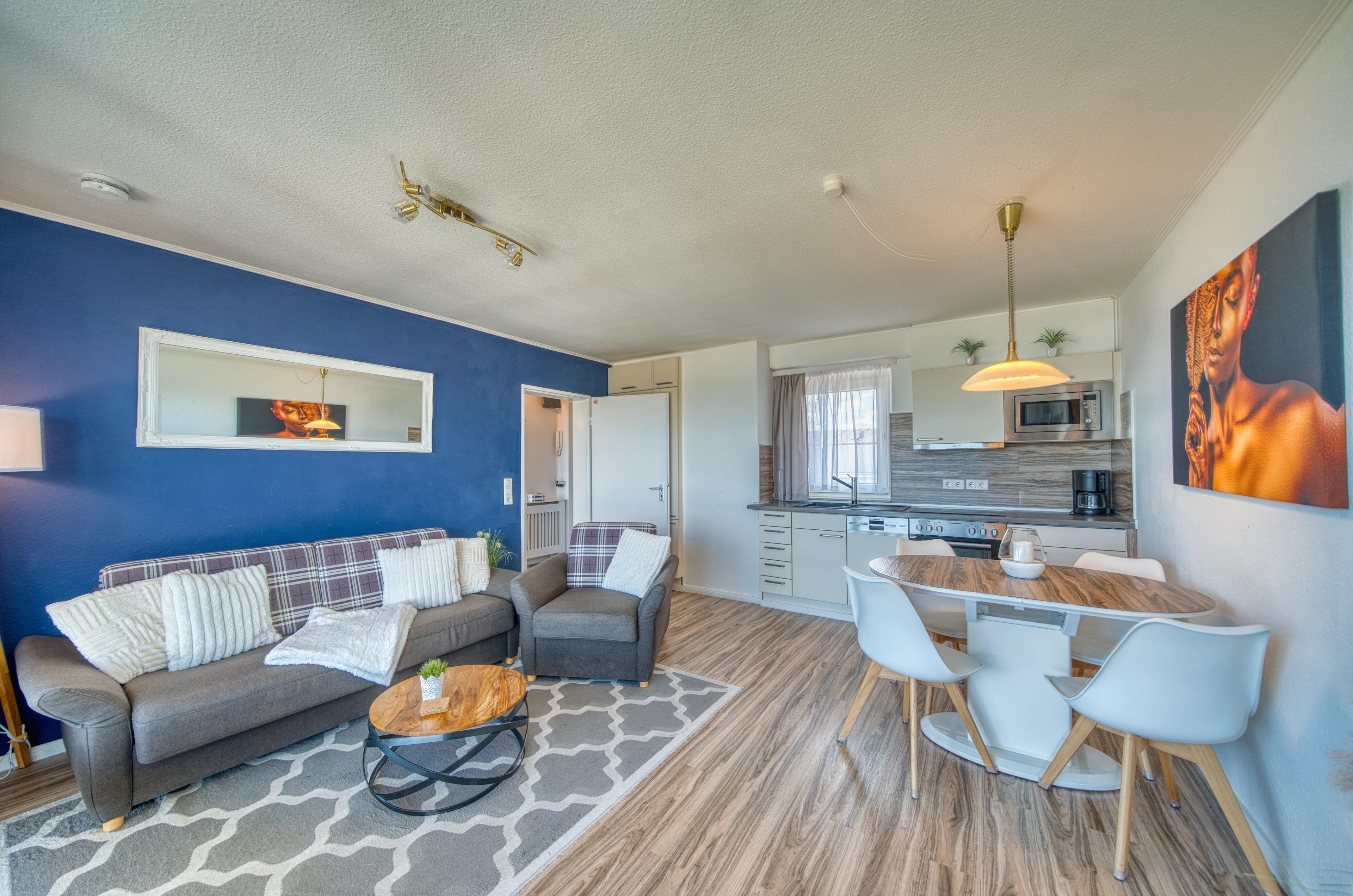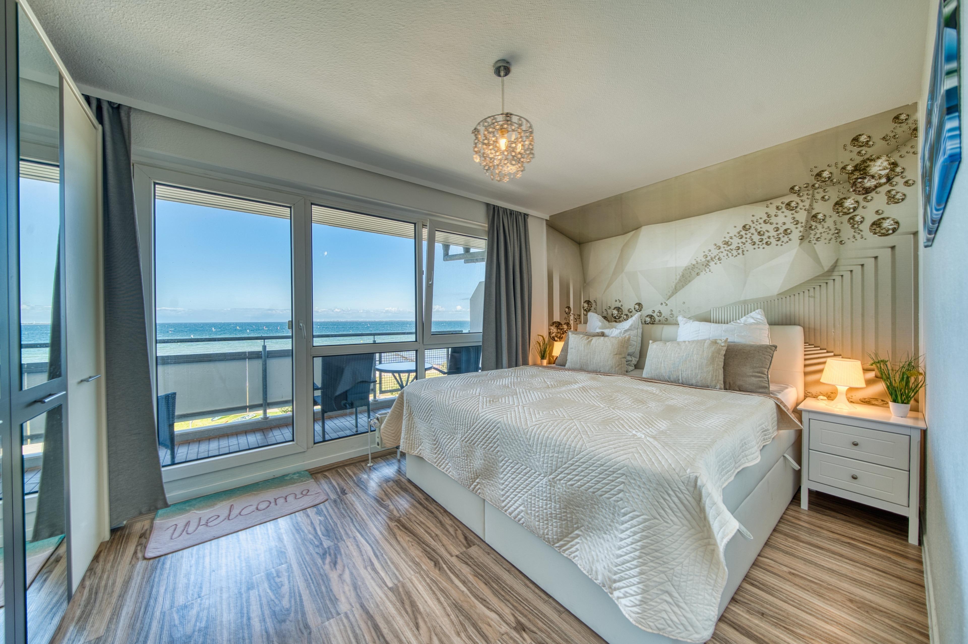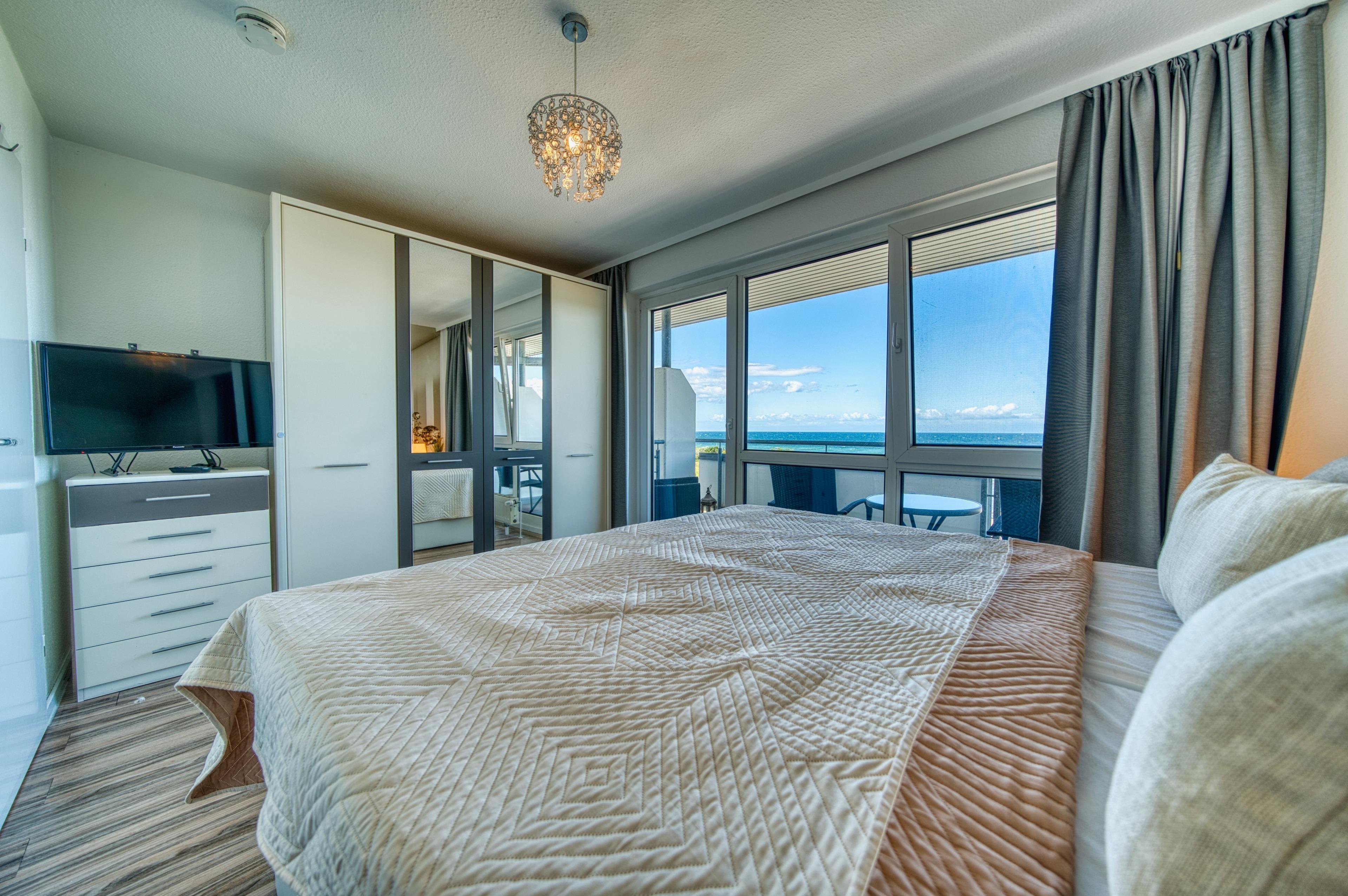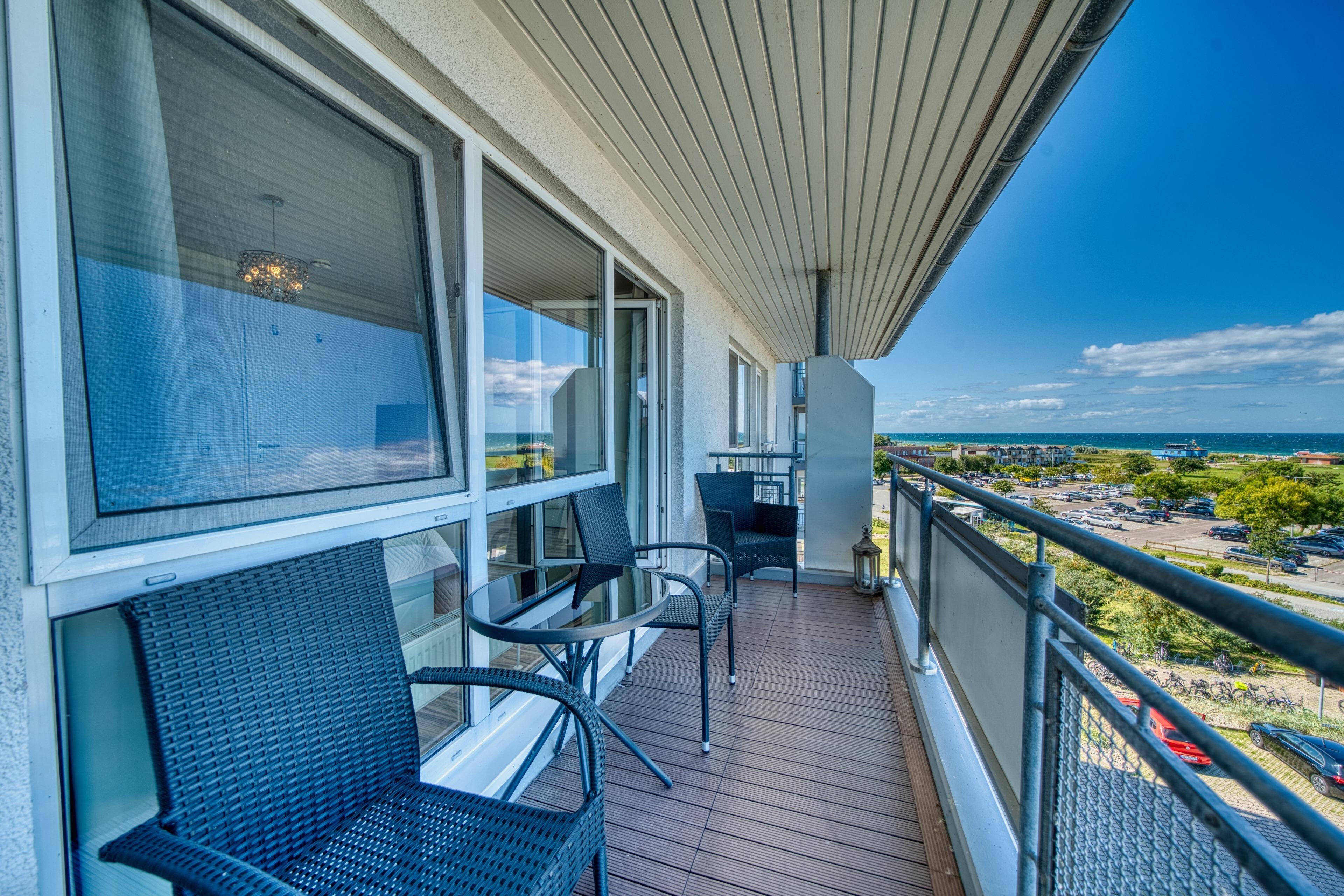 Helle 56?m² Penthouse-Wohnung mit Panoramablick auf Ostsee und Strand. Wohnbereich mit Couch, TV, WLAN, Essbereich; Schlafzimmer mit Doppelbett, zusätzlich Doppelschlafcouch im Wohnbereich. Offene, voll ausgestattete Küche mit Geschirrspüler, Cerankochfeld, Backofen und Mikrowelle. Bad mit Dusche, WC, Föhn. Zwei Außenbereiche: möblierter Nordbalkon mit Ostseeblick, Südterrasse mit Loungebereich. Fahrstuhl, eigener PKW-Stellplatz, Waschmaschine/Trockner im Haus (gegen Gebühr), Fahrradabstellplatz. Nichtraucher, keine Haustiere.