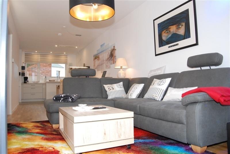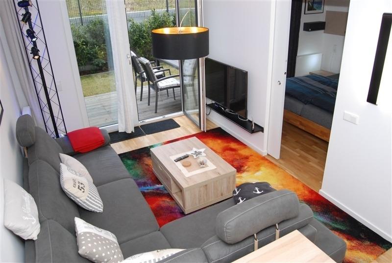 Ausstattung: Separates Schlafzimmer mit Doppelbett, Schlafcouch im Wohnzimmer, Smart TV, WLAN. Küche: Ceranherd, Backofen, Mikrowelle, Wasserkocher, Filterkaffeemaschine, Kühlschrank, Toaster.