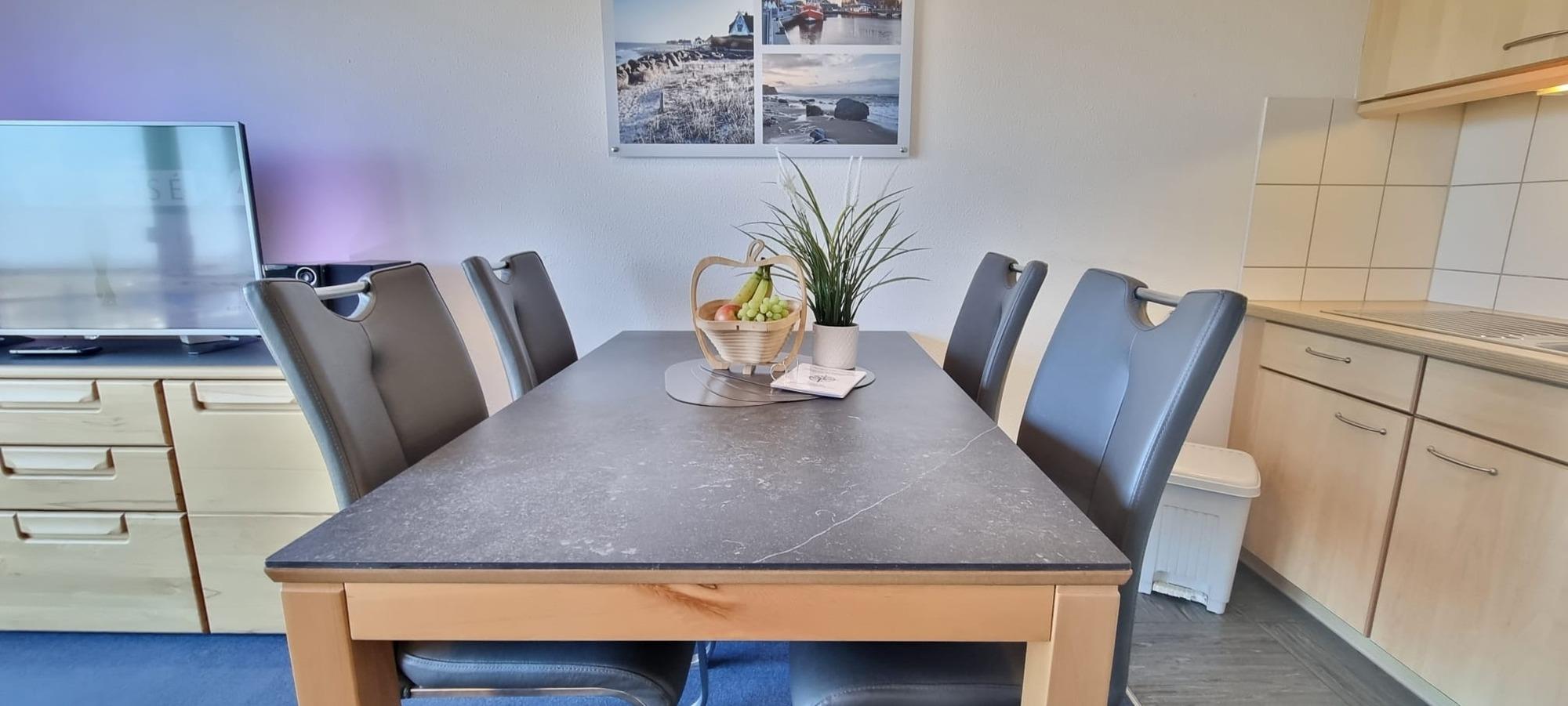 Die kombinierte Küchenzeile ist vollständig ausgestattet und ermöglicht eine unkomplizierte Selbstversorgung – von Frühstück über Snacks bis hin zu einem entspannten Abendessen in Ihrem Appartement. Genießen Sie Ihre Mahlzeiten im Wohnbereich oder lassen Sie die frische Meeresluft auf dem möblierten Westbalkon wirken. Dieser Balkon ist besonders reizvoll: hier können Sie die Abendsonne genießen, bei einem Glas Wein entspannen und die ruhige Atmosphäre sowie den schönen Ausblick über die Umgebung auf sich wirken lassen.