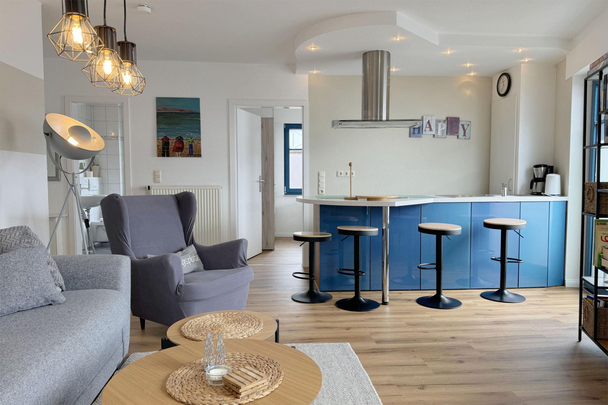 Der helle und freundlich gestaltete Wohnbereich bildet das Herzstück der Wohnung. Hier können Sie entspannte Stunden verbringen und den Urlaubstag in Ruhe ausklingen lassen. Direkt angeschlossen befindet sich der Wintergarten, der viel Tageslicht hereinlässt und zu gemütlichen Momenten bei jeder Wetterlage einlädt – ein schöner Ort für das Frühstück oder ein gutes Buch.