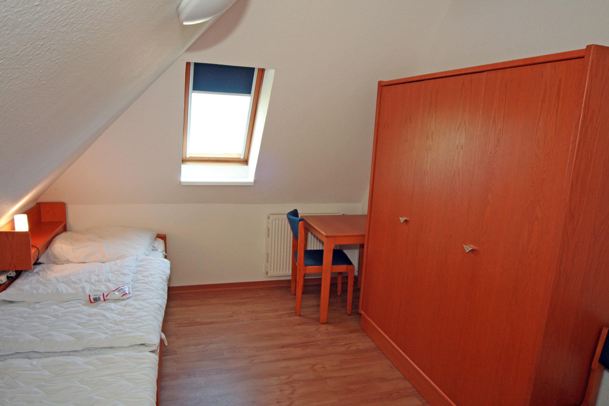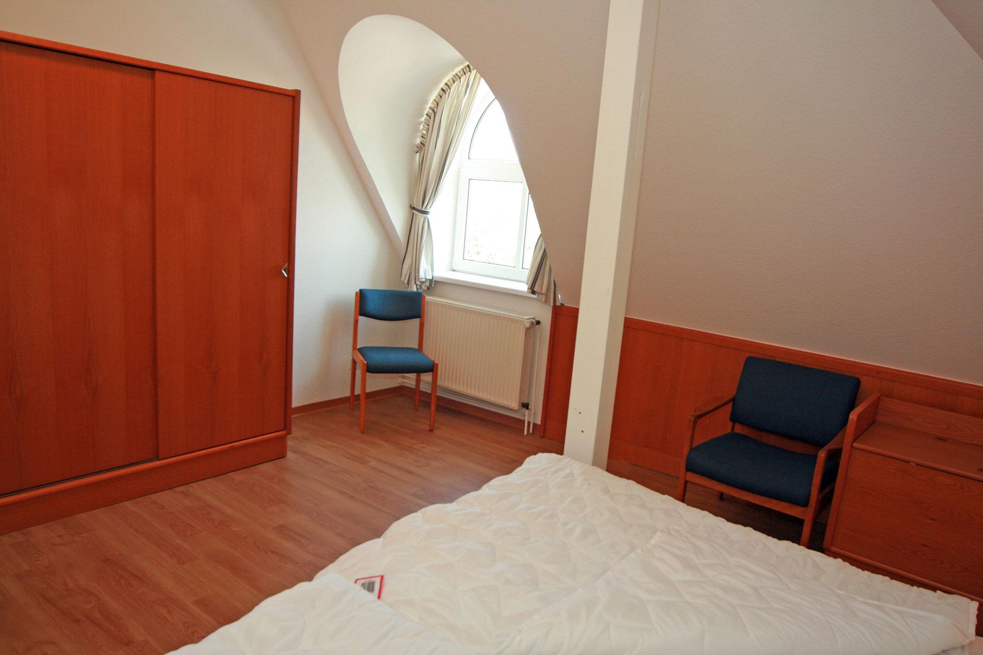 Über eine Wendeltreppe gelangen Sie vom Wohnbereich in den Schlafbereich. Das Apartment verfügt über zwei separate Schlafzimmer: eines ist mit einem komfortablen Doppelbett ausgestattet, das zweite bietet zwei Einzelbetten. In beiden Schlafzimmern stehen großzügige Kleiderschränke zur Verfügung. Von hier aus können Sie sogar einen kleinen Blick auf die Ostsee erhaschen – ein schönes Detail, das Urlaubsstimmung aufkommen lässt.