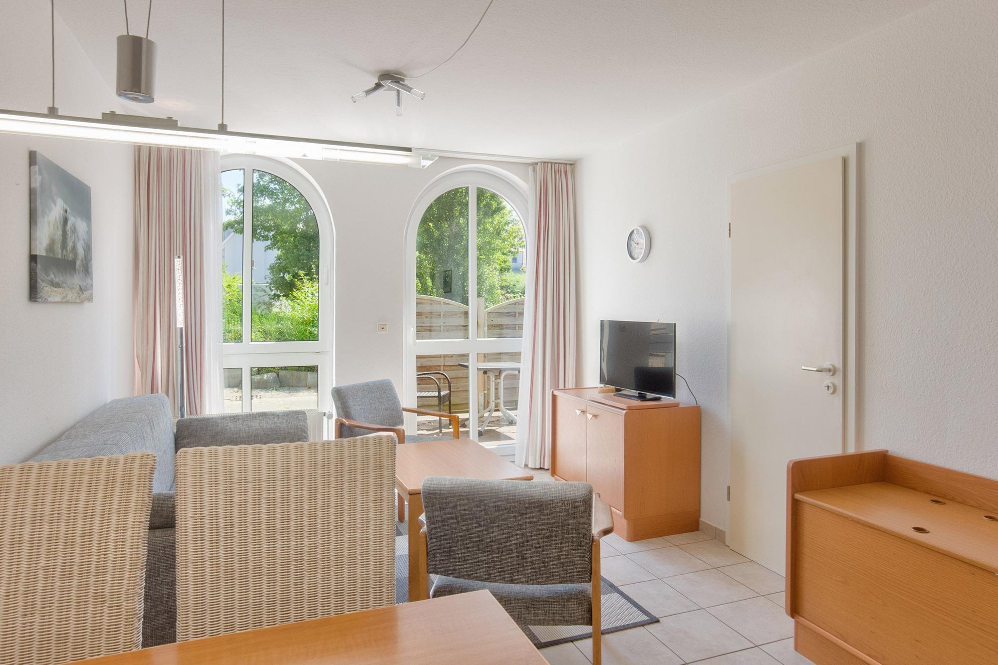 Das Apartment 3 im Erdgeschoss bietet auf etwa 40 Quadratmetern ausreichend Platz für bis zu vier Personen. Das Schlafzimmer ist mit zwei Einzelbetten und einem großen Kleiderschrank ausgestattet. Im Wohnbereich sorgt eine großzügige Schlafcouch für zwei weitere Personen für erholsame Nächte.