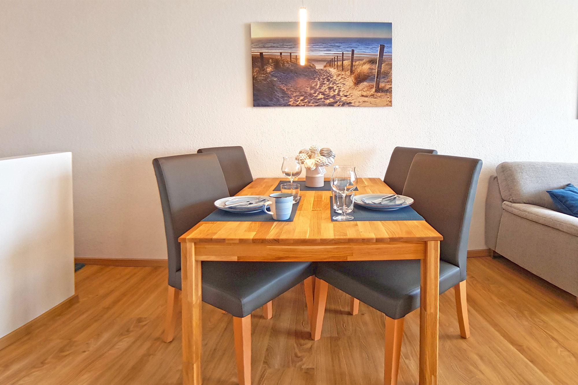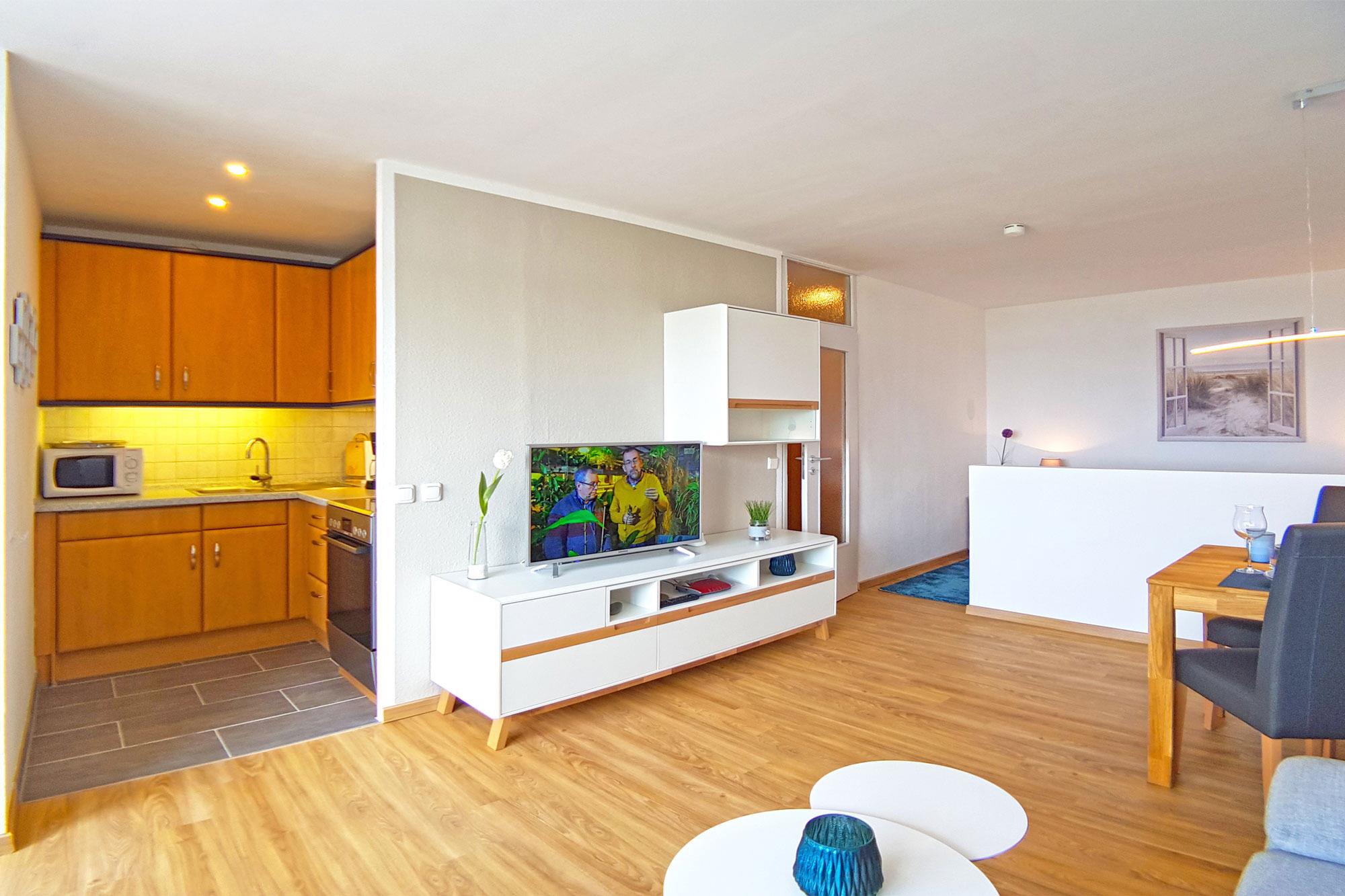 Nah am Wohnbereich ist die kleine, aber gut ausgestattete Küche (mit Backofen und Mikrowelle), mit allem Notwendigen versehen. Damit steht dem kulinarischen Genuss während Ihres Aufenthaltes nichts im Wege. Der Essbereich ist nur wenige Schritte entfernt und zentraler Treffpunkt für die Urlaubsplanung. Das Badezimmer bietet mit ebenerdiger Dusche, Handtuchwärmer, WC und Fön die Räumlichkeit um sich nach einem ereignisreichen Tag aufzufrischen.