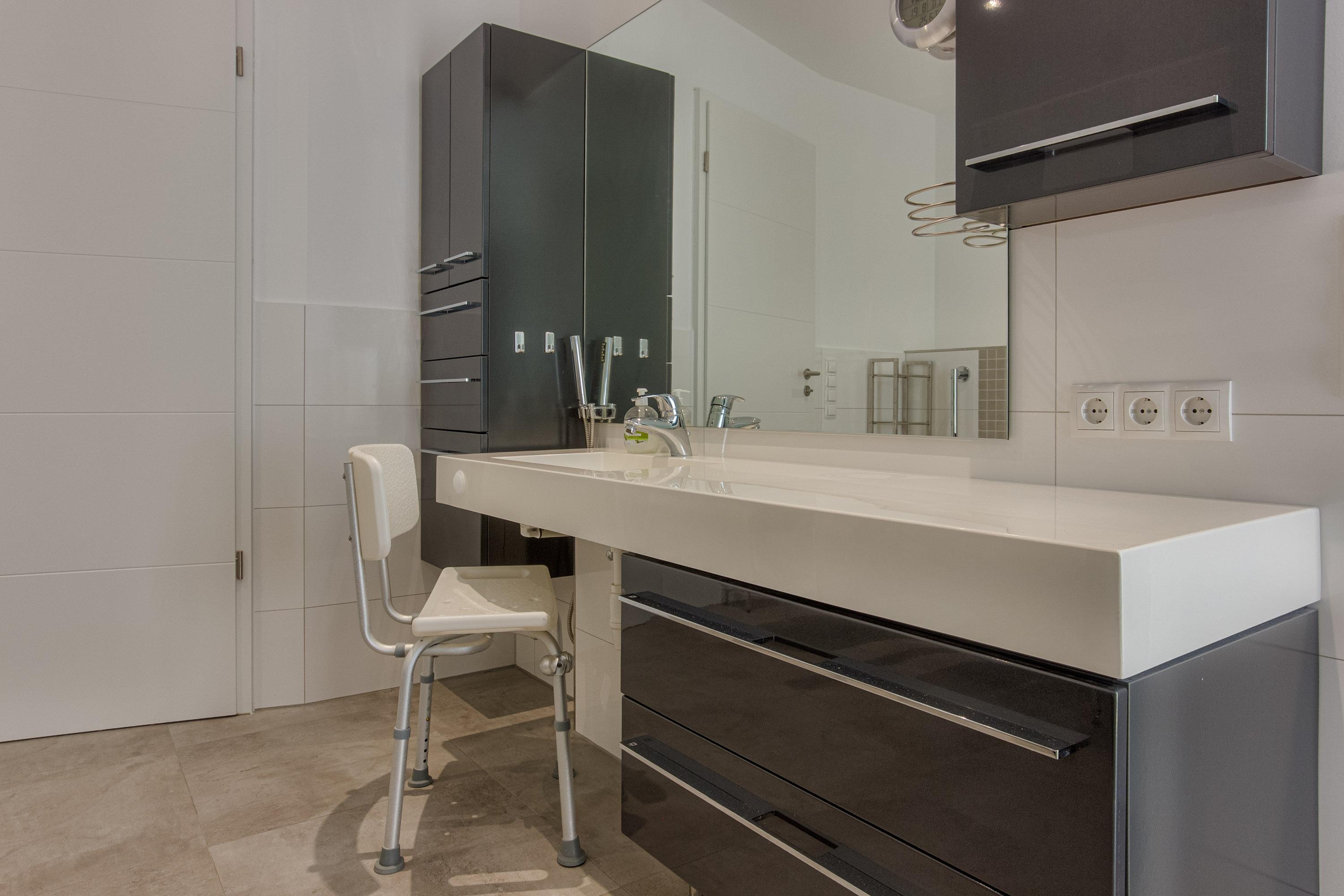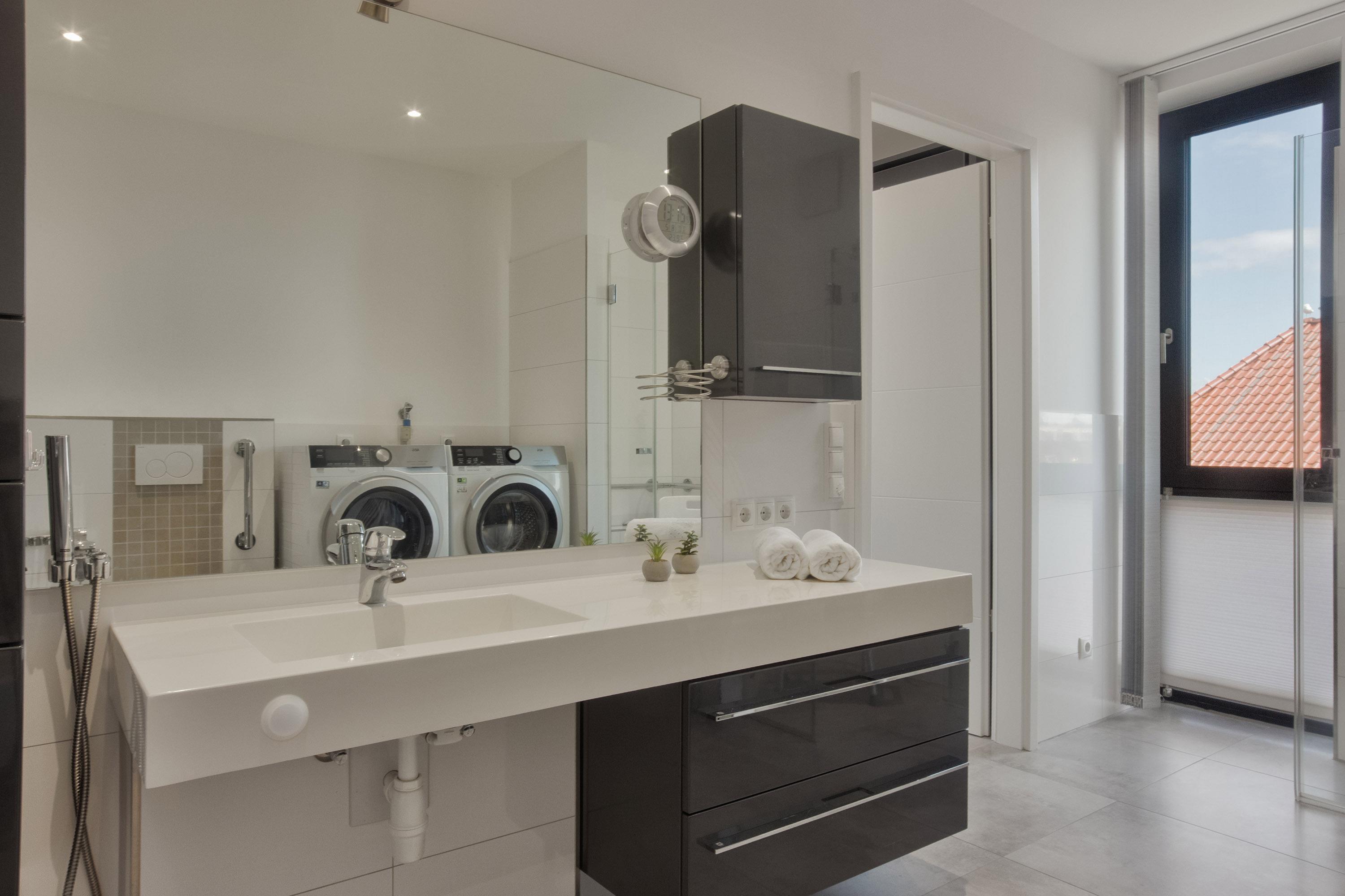 Das komfortable Badezimmer mit Tageslicht verfügt über eine barrierefreie, ebenerdige Dusche, WC und Bidet, beleuchtete Spiegel und Handtuchwärmer. Haltegriffe in der Dusche und beim WC, Duschhocker und ein unterfahrbarer Waschtisch sind praktische Helfer. Eine Waschmaschine und ein Trockner sind hier zudem zur bequemen Nutzung clever integriert. Zusätzlich gibt es in der Unterkunft ein separates Gäste-WC.