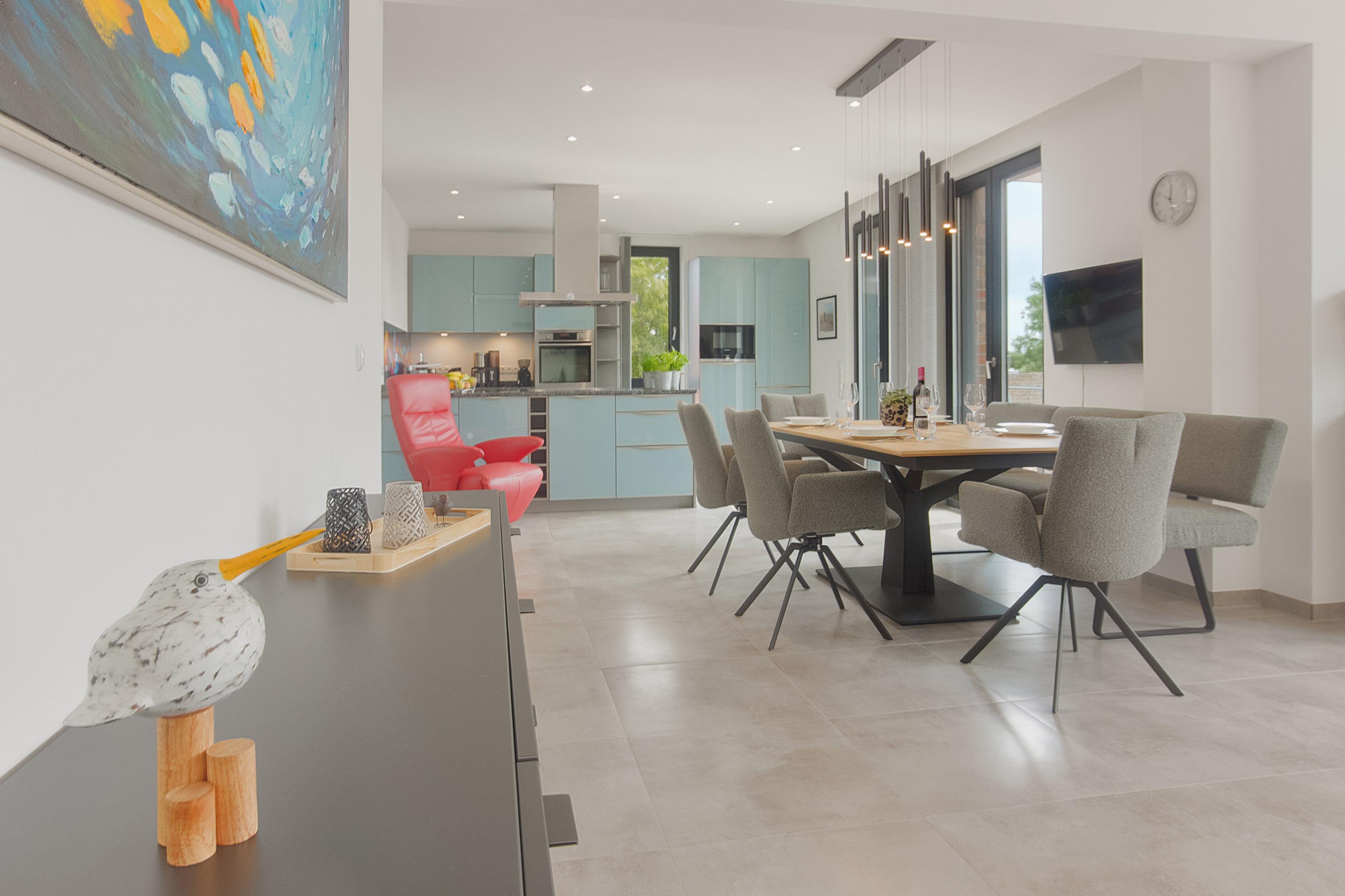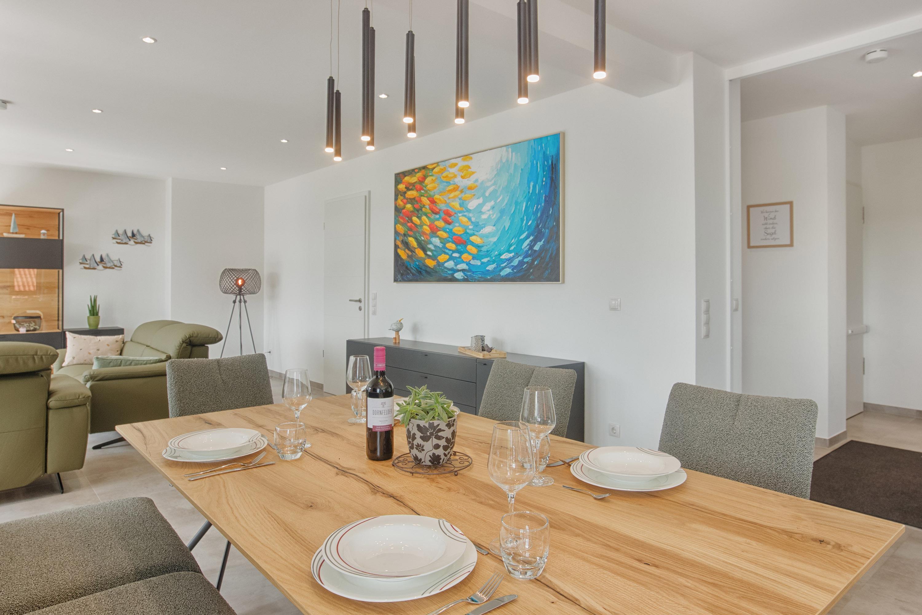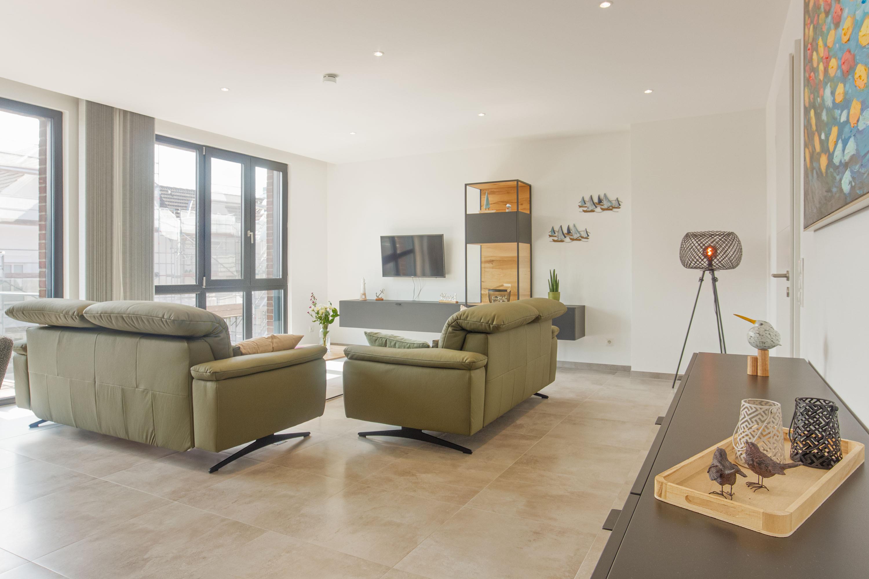 Im geschmackvoll eingerichteten Wohnbereich erwarten Sie zwei bequeme Couches (eine davon mit Schlaffunktion), ein Relax Sessel, Smart-TV, WLAN sowie Streaming-Möglichkeiten. Eine Auswahl an Büchern und Spielen rundet das Unterhaltungsangebot ab – Langeweile kommt hier garantiert nicht auf.