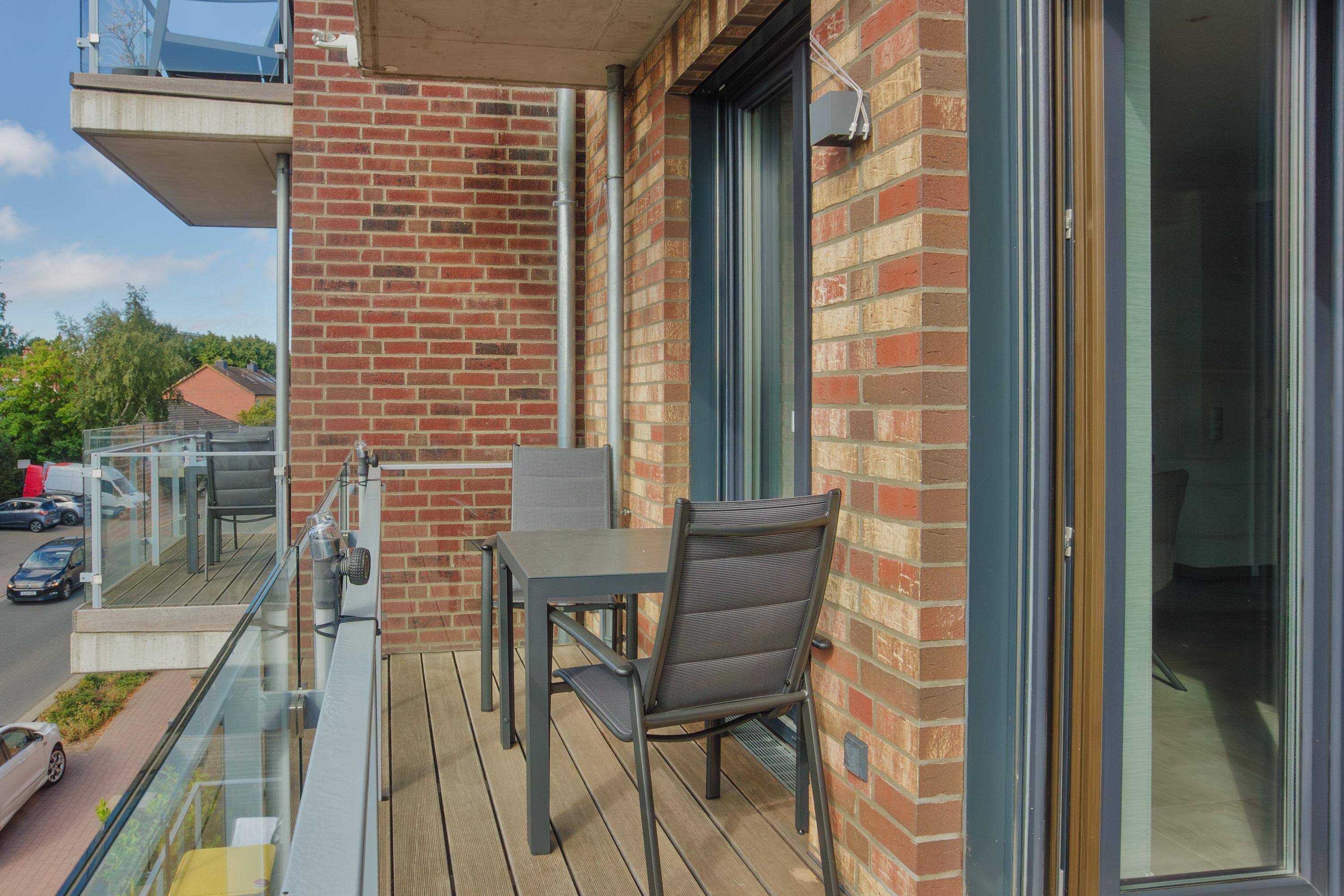 Die beiden sonnigen Balkone (Südseite) sind stufenfrei über Rampen zugänglich und laden zum Frühstück im Freien oder zum Ausklang eines Sommertages ein. Beleuchtung und elektrische Rollläden sorgen für zusätzlichen Komfort. In der Unterkunft hat jeder Raum mit Fenster zudem Insektenschutz.