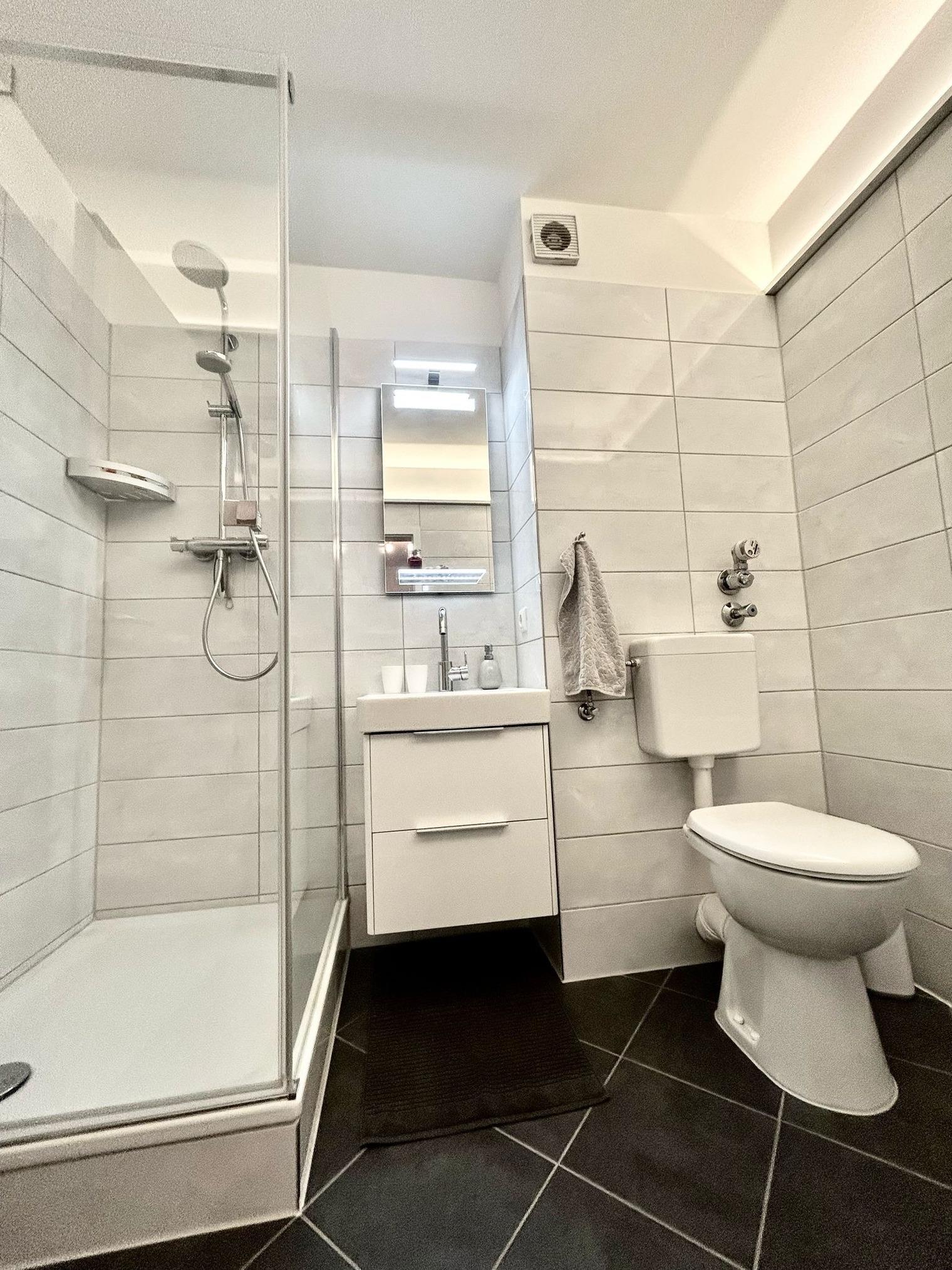 Das Badezimmer präsentiert sich funktional und gepflegt und ist mit einer Dusche, einem WC sowie einem Waschbecken ausgestattet.