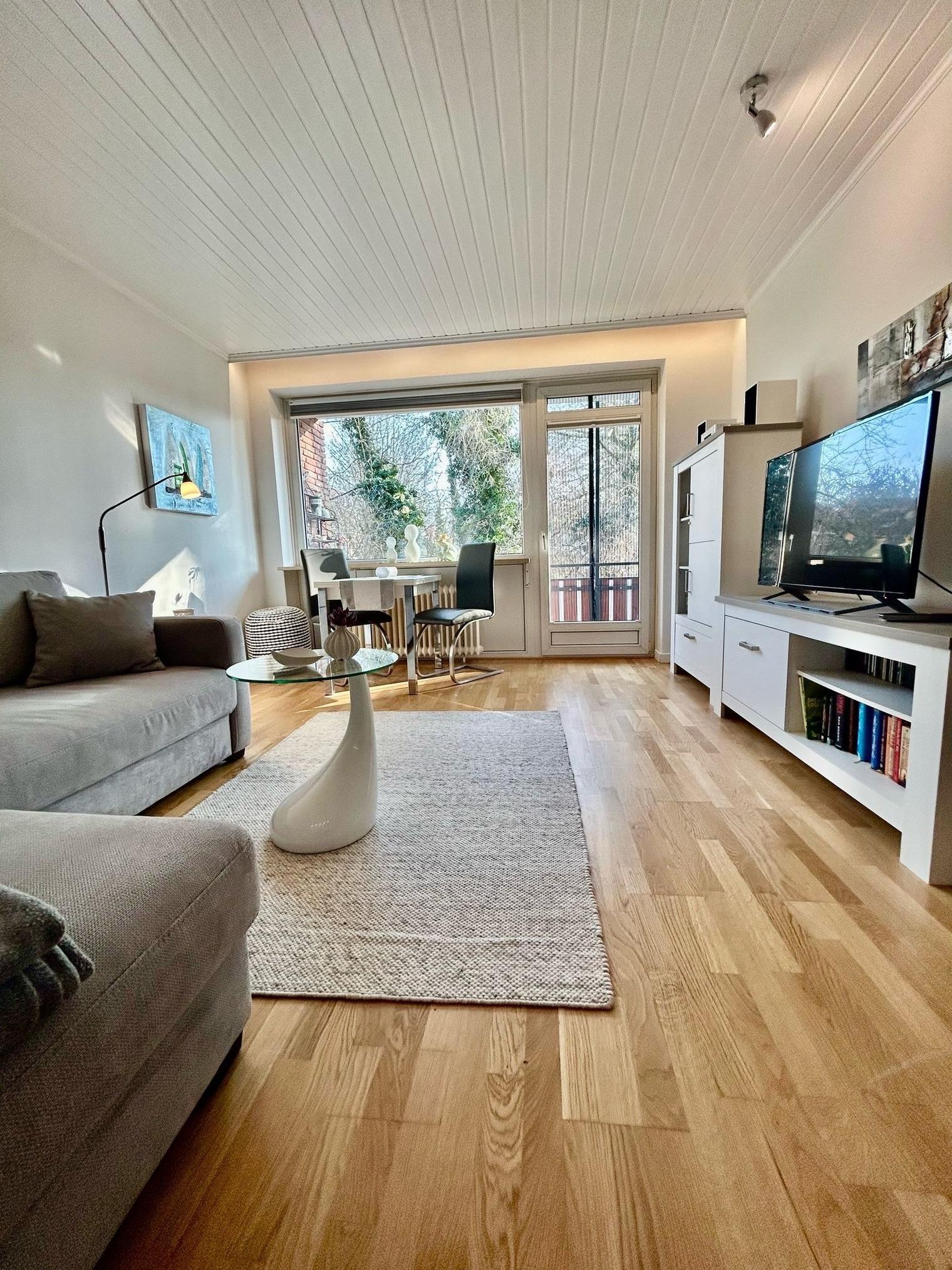 Herzstück der Wohnung ist der liebevoll gestaltete Wohnbereich mit gemütlicher Couch, TV und einem kleinen Essplatz. Hier können Sie entspannte Stunden verbringen oder den Urlaubstag in Ruhe ausklingen lassen. Vom Wohnbereich aus gelangen Sie auf den großzügigen Südbalkon, der zum ruhigen Hinterhof ausgerichtet ist und ideale Voraussetzungen für erholsame Momente an der frischen Luft bietet.