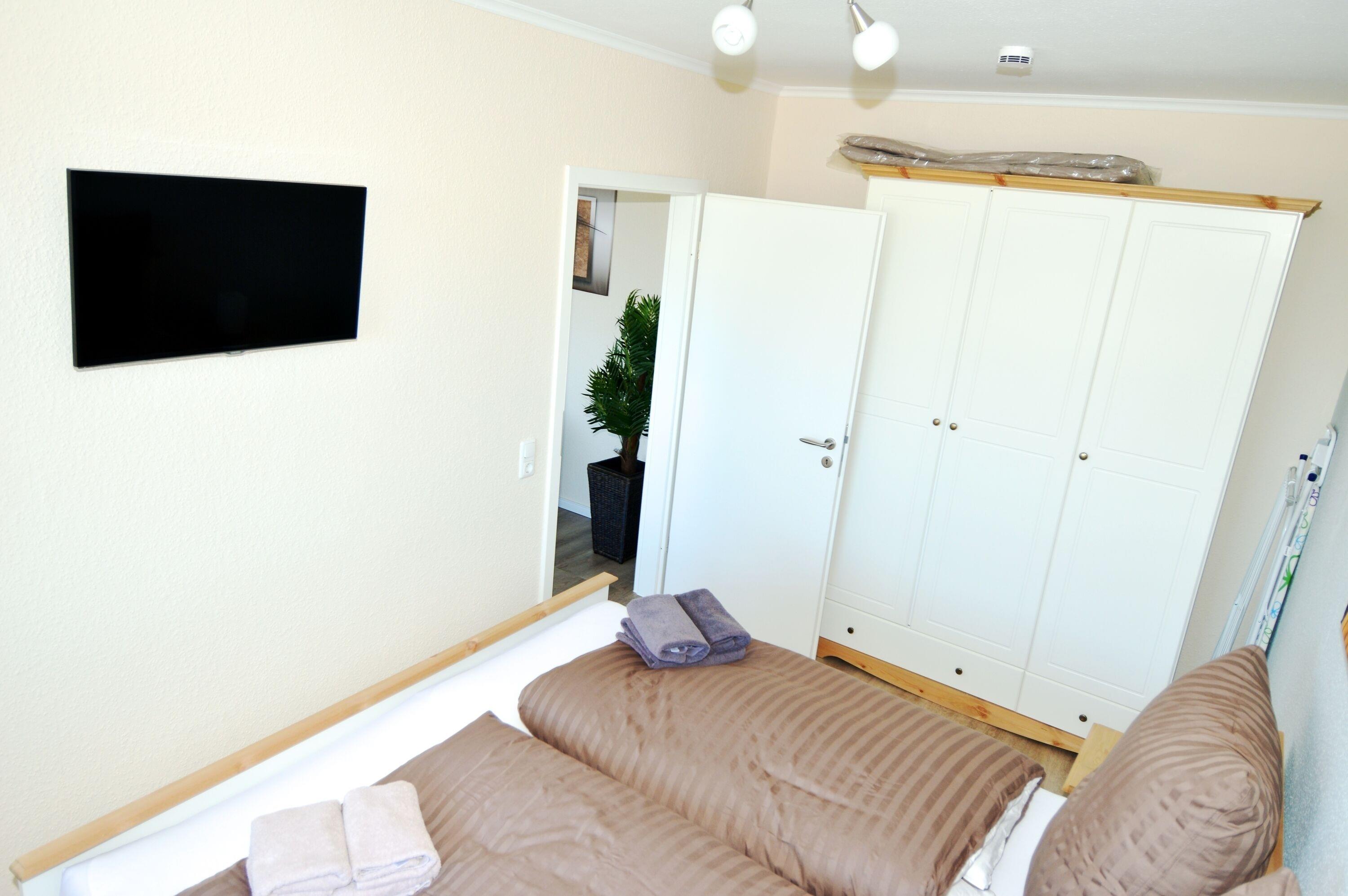 Das Schlafzimmer ist mit einem Doppelbett, einem großen Kleiderschrank und einem weiteren Fernseher ausgestattet. Verdunklungsmöglichkeiten sorgen für erholsame Nächte.