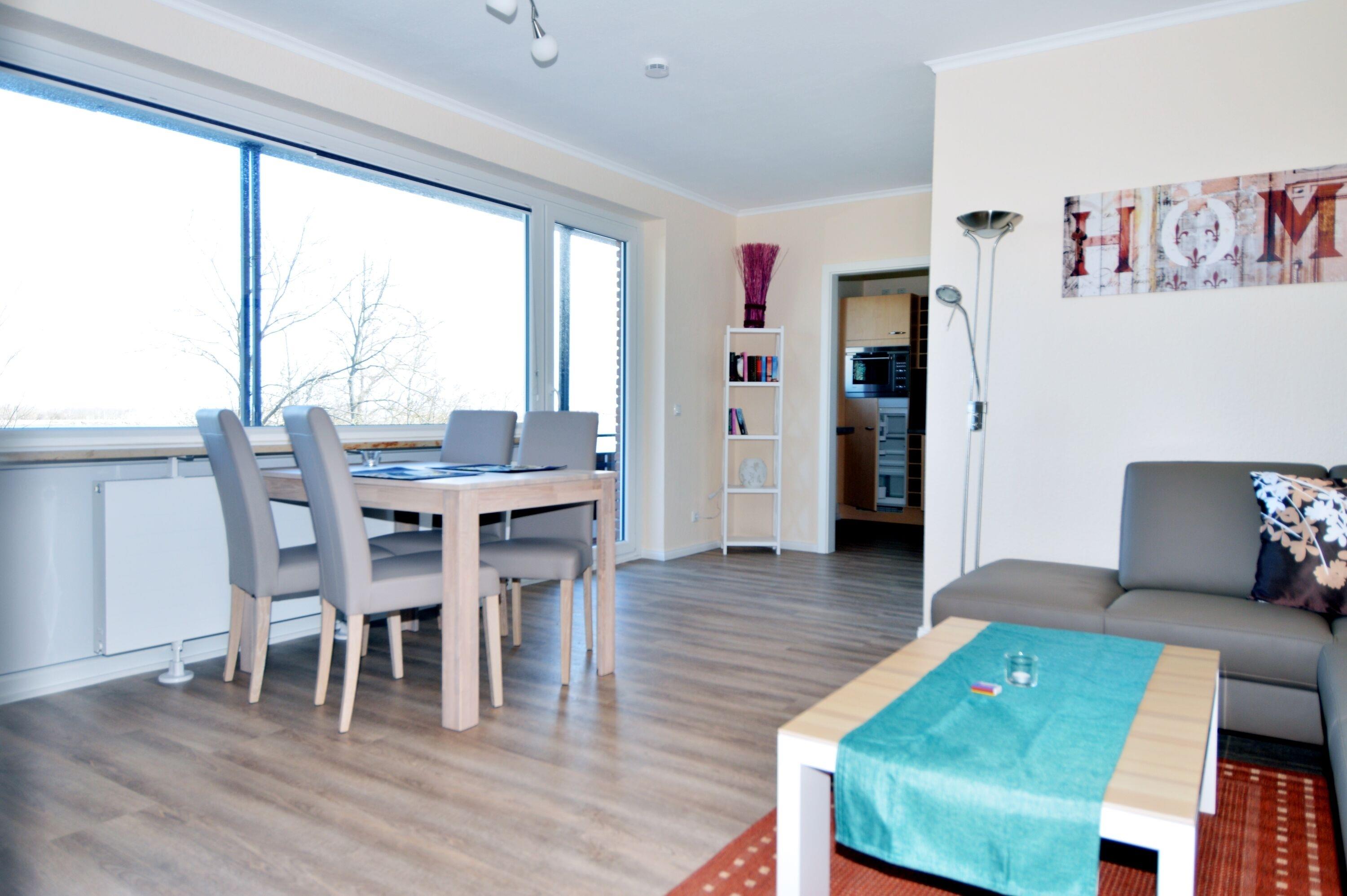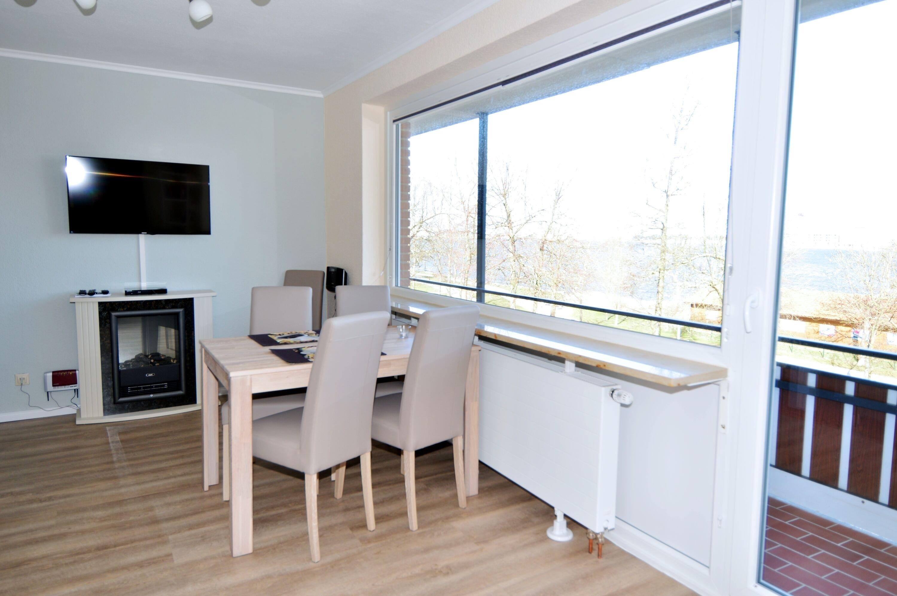 Herzstück der Unterkunft ist der helle und großzügige Wohn- und Essbereich mit großen Fensterflächen. Von hier genießen Sie einen schönen Blick auf den Binnensee sowie die davorliegenden Grünanlagen. Der Essbereich ist direkt am Fenster platziert und lädt zu gemeinsamen Mahlzeiten mit Ausblick ein. Eine gemütliche Couch, ein Fernseher sowie ein Elektrokamin sorgen ganzjährig für eine angenehme Wohnatmosphäre.