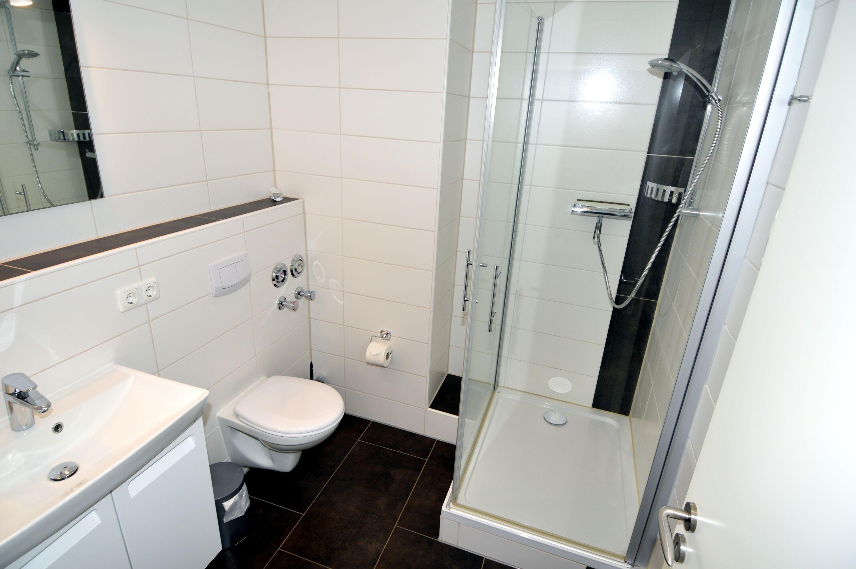Das Badezimmer verfügt über eine Dusche, Waschbecken und WC und rundet die Ausstattung der Wohnung ab.