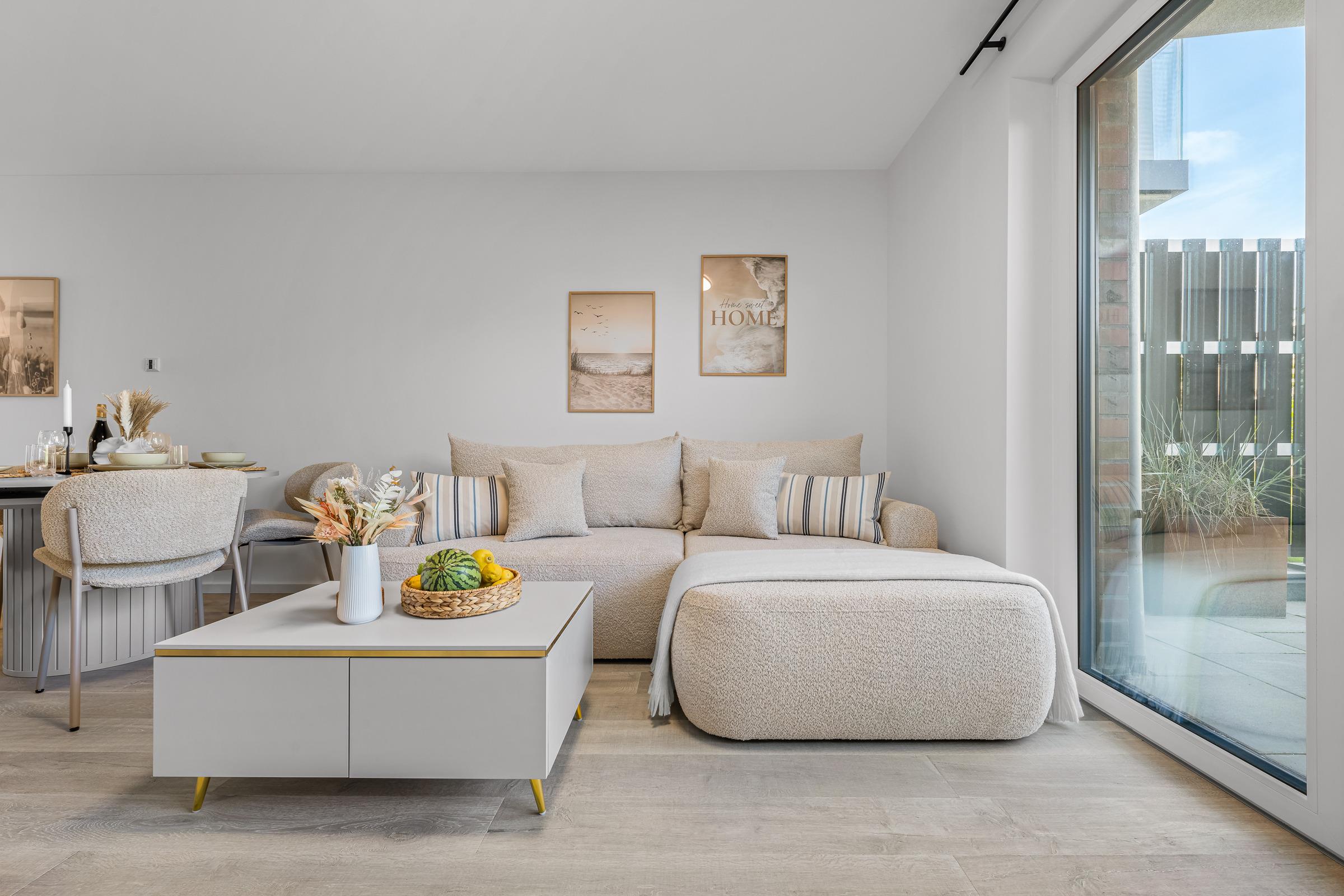 Herzstück ist der einladende Wohn- und Essbereich. Hier kann auf der gemütlichen Couch (mit Schlaffunktion 140x200) entspannt werden oder Sie genießen gesellige Stunden am Esstisch. Naturtöne und mit viel Geschick ausgewählte Dekorationen sorgen für ein wunderbar wohnliches Gefühl. Streaming-TV und WLAN sind selbstverständlich. Durch die großen, charmanten Fenster haben Sie einen Blick in die offene Außenanlage vom Harbour Side Heiligenhafen.