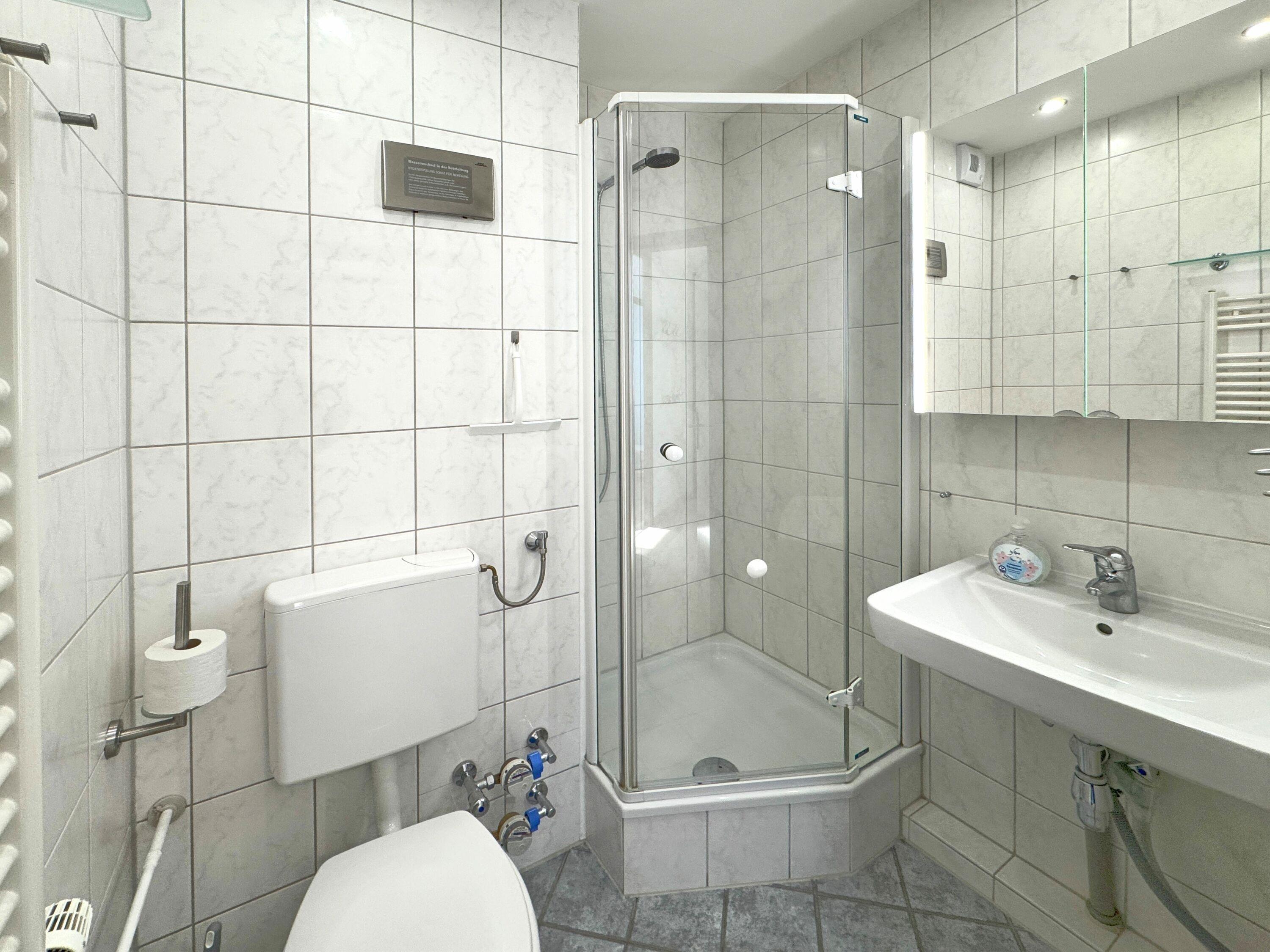 Das Badezimmer ist praktisch eingerichtet und verfügt über eine Dusche, ein Waschbecken, ein WC, einen Handtuchwärmer sowie einen Kosmetikspiegel – perfekt, um sich nach einem Strandtag zu erfrischen.