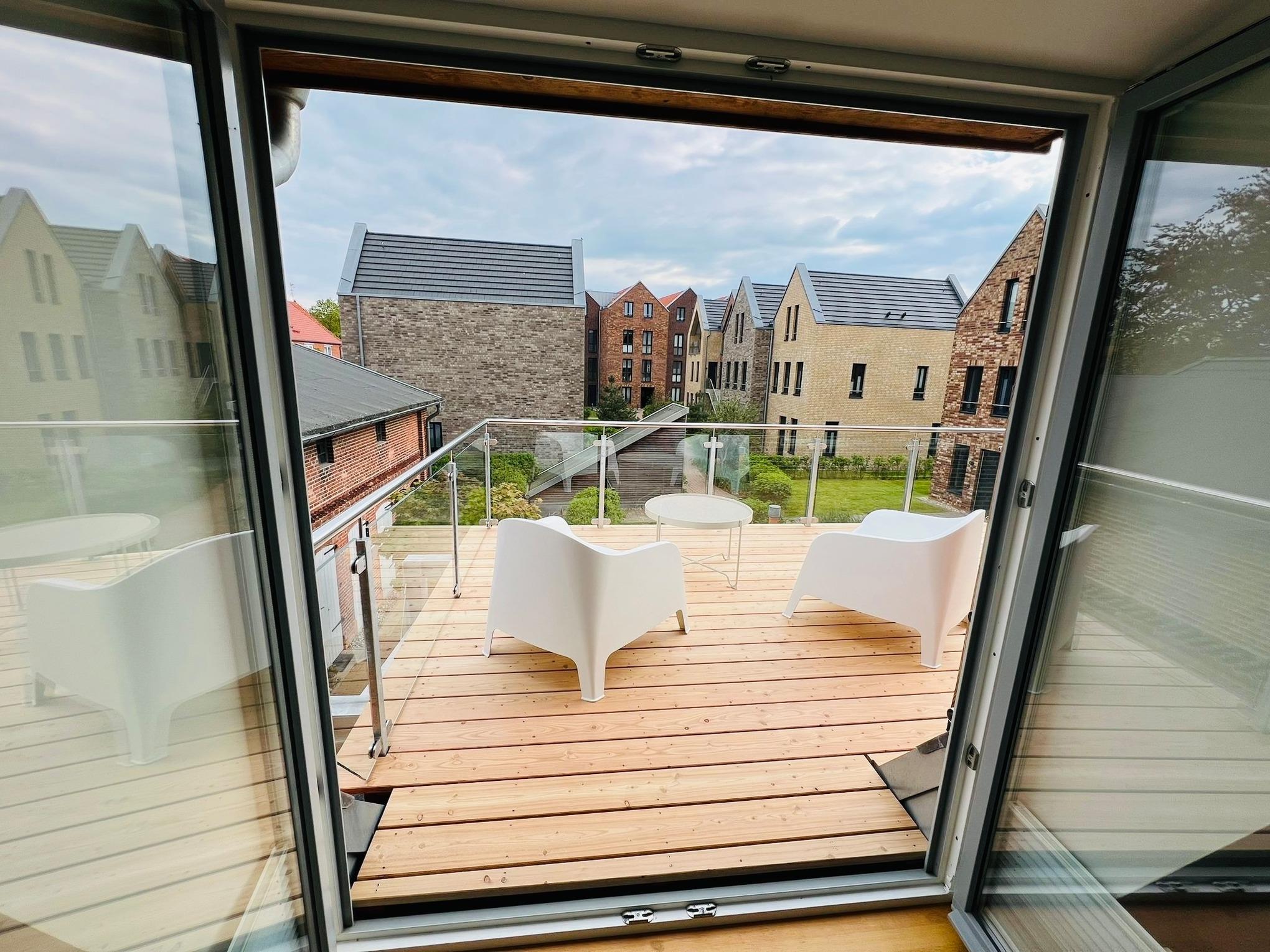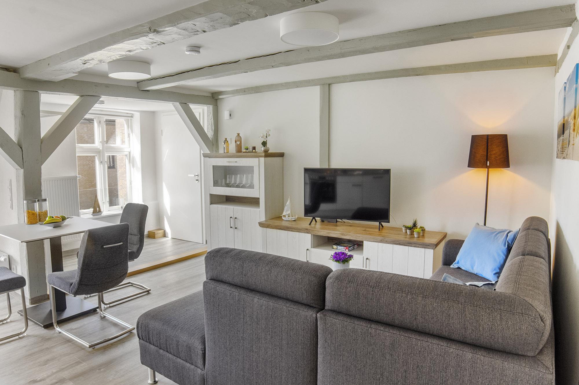 Der geschmackvolle Wohnbereich ist offen und mit gemütlicher Couch, Smart-TV und WLAN zur Unterhaltung ausgestattet. So kann man auch im Urlaub seine Lieblingsserien oder Filme per Stream schauen. Die Fenster in Südlage bringen viel natürliches Licht und bieten von der Couch einen direkten Blick in das Fischerdorf Heiligenhafen. Der im Mai 2024 neu errichtete Balkon in Süd-Ausrichtung mit herrlichem Blick bietet ganztägig einen sehr, sehr ruhigen Platz zum Entspannen.