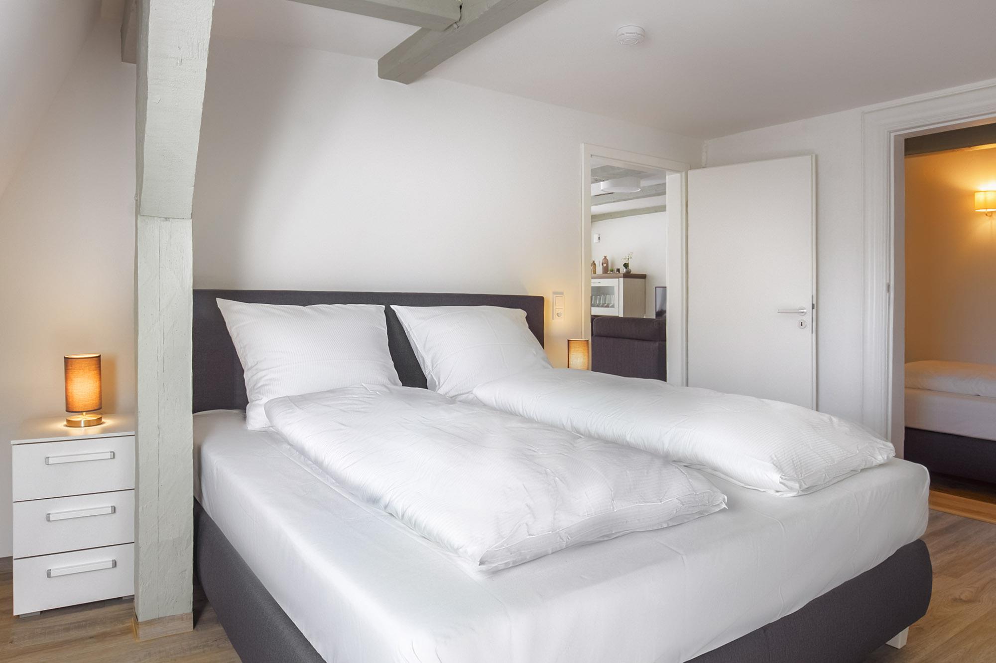 Die Ferienwohnung ist besonders für Familien oder Paare geeignet, da sie über zwei separate Schlafzimmer verfügt. Das Elternschlafzimmer ist mit einem Doppel-Boxspringbett und einem gemütlichen Ohrensessel eingerichtet, der zum Lesen einlädt. Das zweite Schlafzimmer verfügt über zwei Einzelbetten, die Rückzugsmöglichkeiten und Erholung bieten. (Zugang zum zweiten Schlafzimmer nur durch das erste Schlafzimmer möglich) Für Verdunkelung und nächtliche Ruhe sorgen blickdichte Plissees. Von den Schlafzimmern erreichen Sie bequem das großzügige Tageslicht-Bad mit ebenerdiger Dusche, Handtuchwärmer, Waschbecken und WC. Die offene und voll ausgestattete Küche mit direktem Zugang zum großen Balkon ist mit Spülmaschine, Mikrowelle und Backofen ausgestattet und garantiert während Ihres Aufenthaltes alle Annehmlichkeiten. Kaffeeliebhaber finden neben einer klassischen Filterkaffeemaschine auch eine Nespresso Maschine mit Milchaufschäumer.