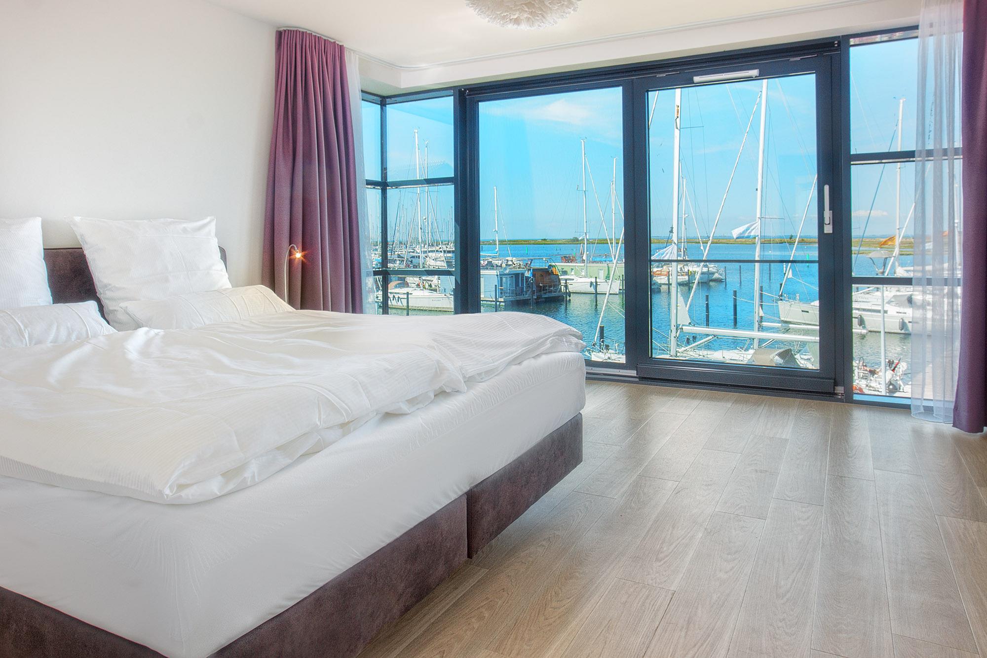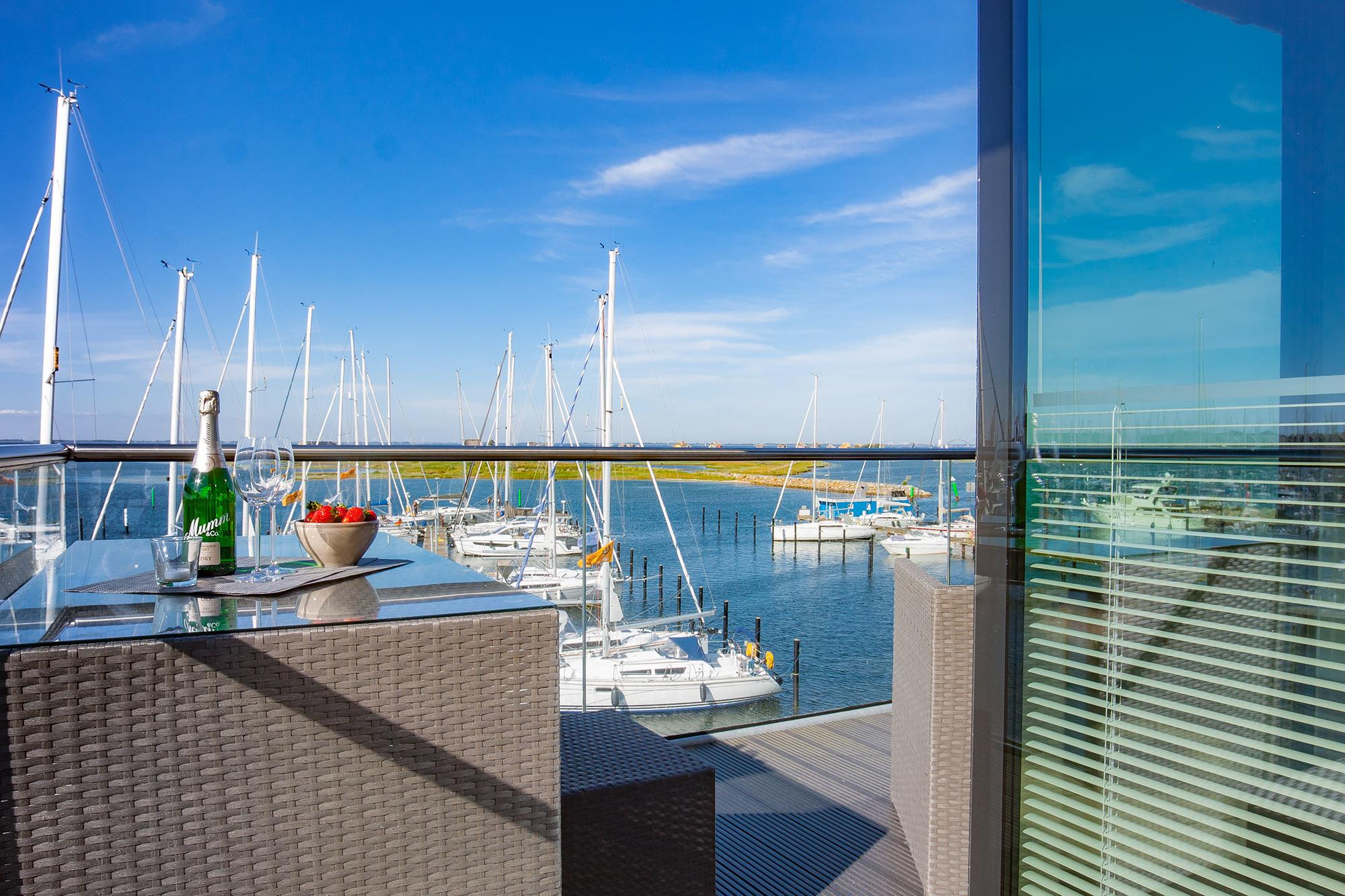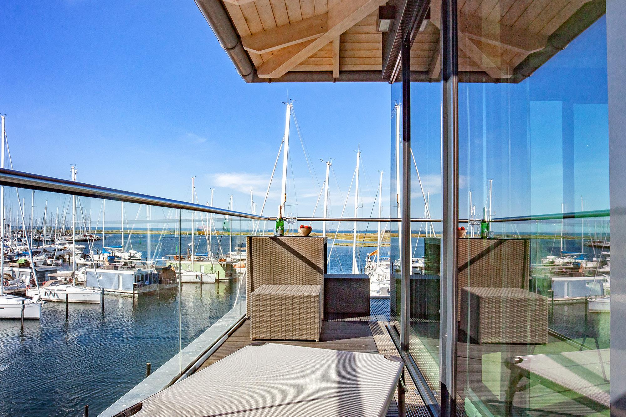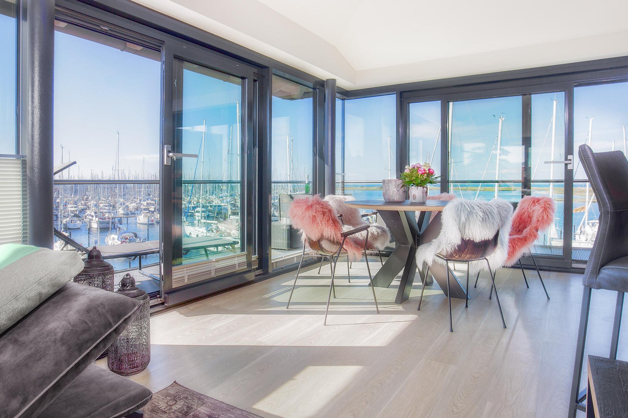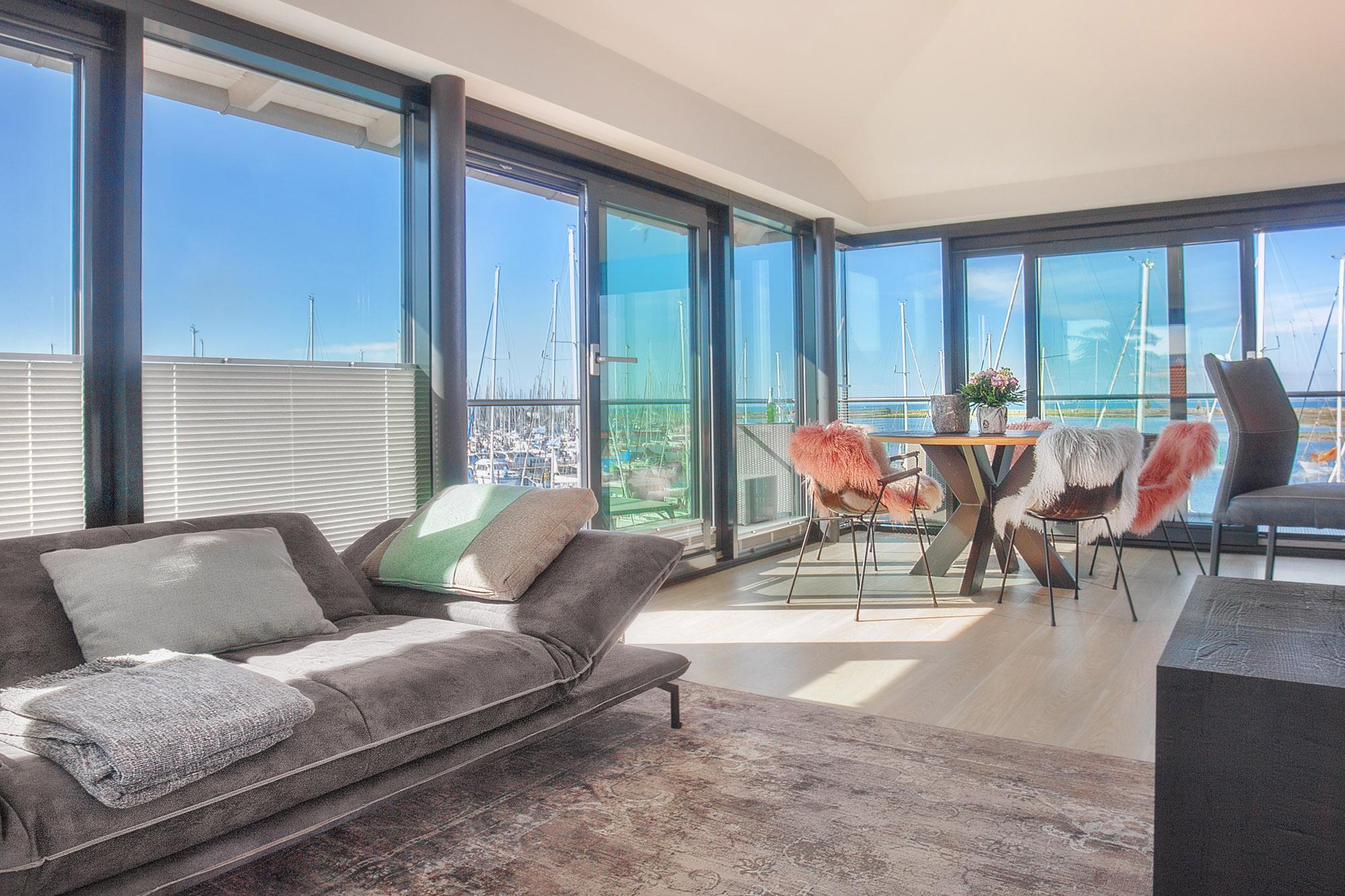 Verbunden über eine elegante innenliegende Treppe, verteilen sich die Wohnräume auf das erste Obergeschoss und das Dachgeschoss. Der offene Wohnbereich besticht mit einer hochwertigen Ausstattung, stilvollen Möbeln und einem einzigartigen Panoramablick über den Jachthafen und das weite Meer. Hier erleben Sie das maritime Flair hautnah und können den vorbeiziehenden Booten vom gemütlichen Sofa aus zuschauen.