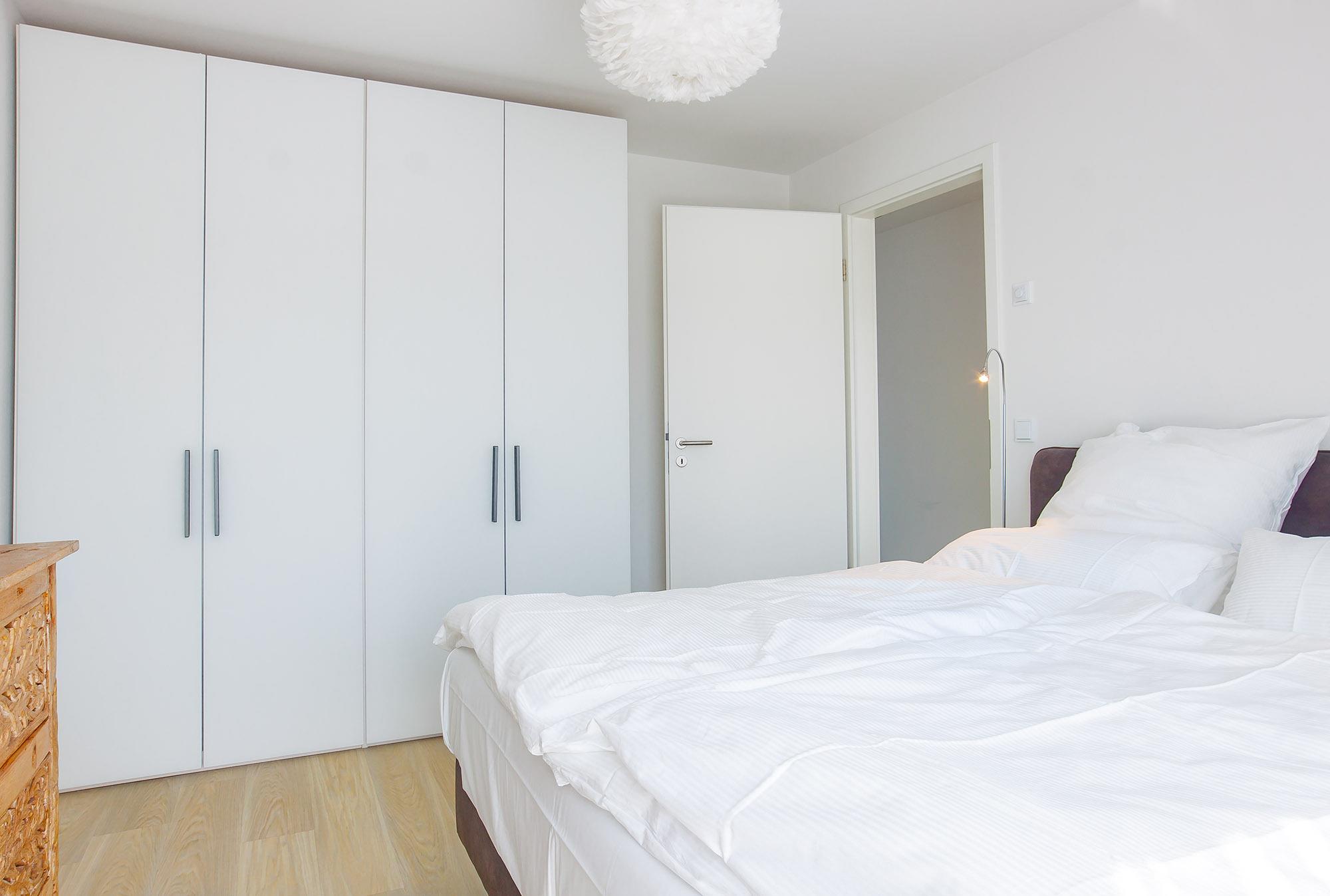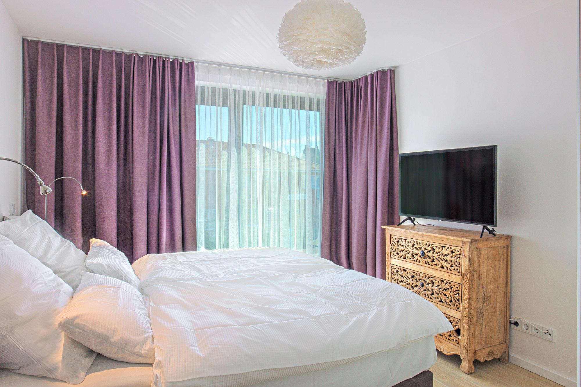 Die Wohnung bietet Platz für bis zu fünf Personen und eignet sich ideal für Familien oder Paare. Zwei großzügige Schlafzimmer sind mit luxuriösen Doppelboxspringbetten ausgestattet (180x220 cm und 180x200 cm) und verfügen jeweils über einen eigenen TV, wobei eines der Geräte als Smart-TV dient. Für eine weitere Person bietet die wandelbare Schlafcouch im Wohnbereich zusätzlichen Platz. Die Kombination aus edlen Materialien, durchdachtem Design und sanften Farben sorgt für eine behagliche Atmosphäre und höchsten Wohnkomfort.