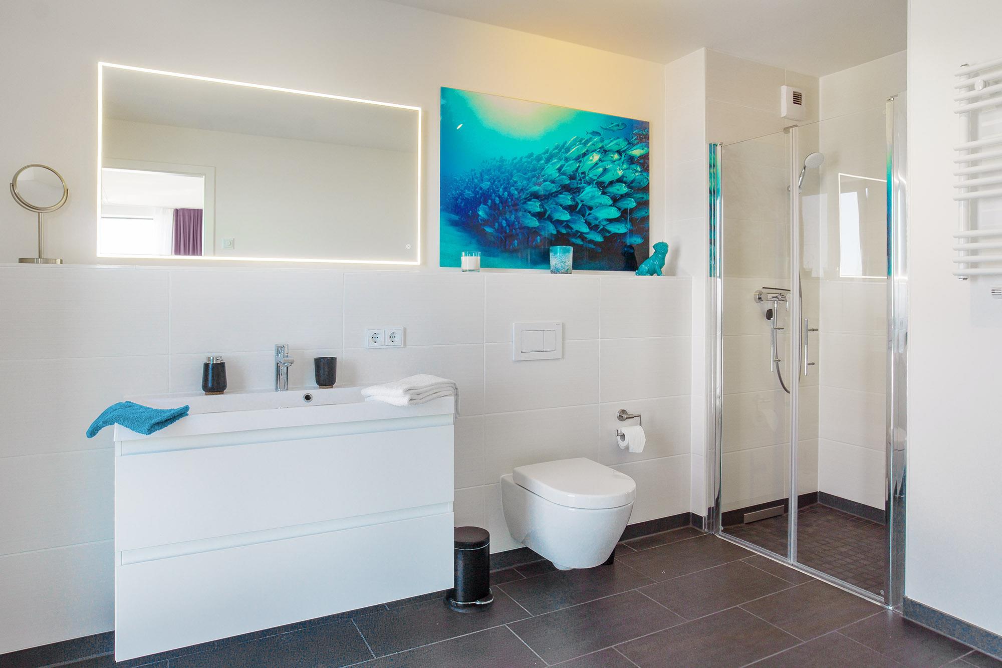 Zwei moderne Badezimmer mit ebenerdiger Dusche bieten nicht nur Annehmlichkeiten, sondern auch die nötige Privatsphäre. Ein besonderes Highlight ist das en-suite Badezimmer im großen Schlafzimmer, das zusätzlich mit einer Waschmaschine ausgestattet ist. Hier starten Sie entspannt in den Tag oder genießen nach einem langen Spaziergang am Strand eine wohltuende Dusche.