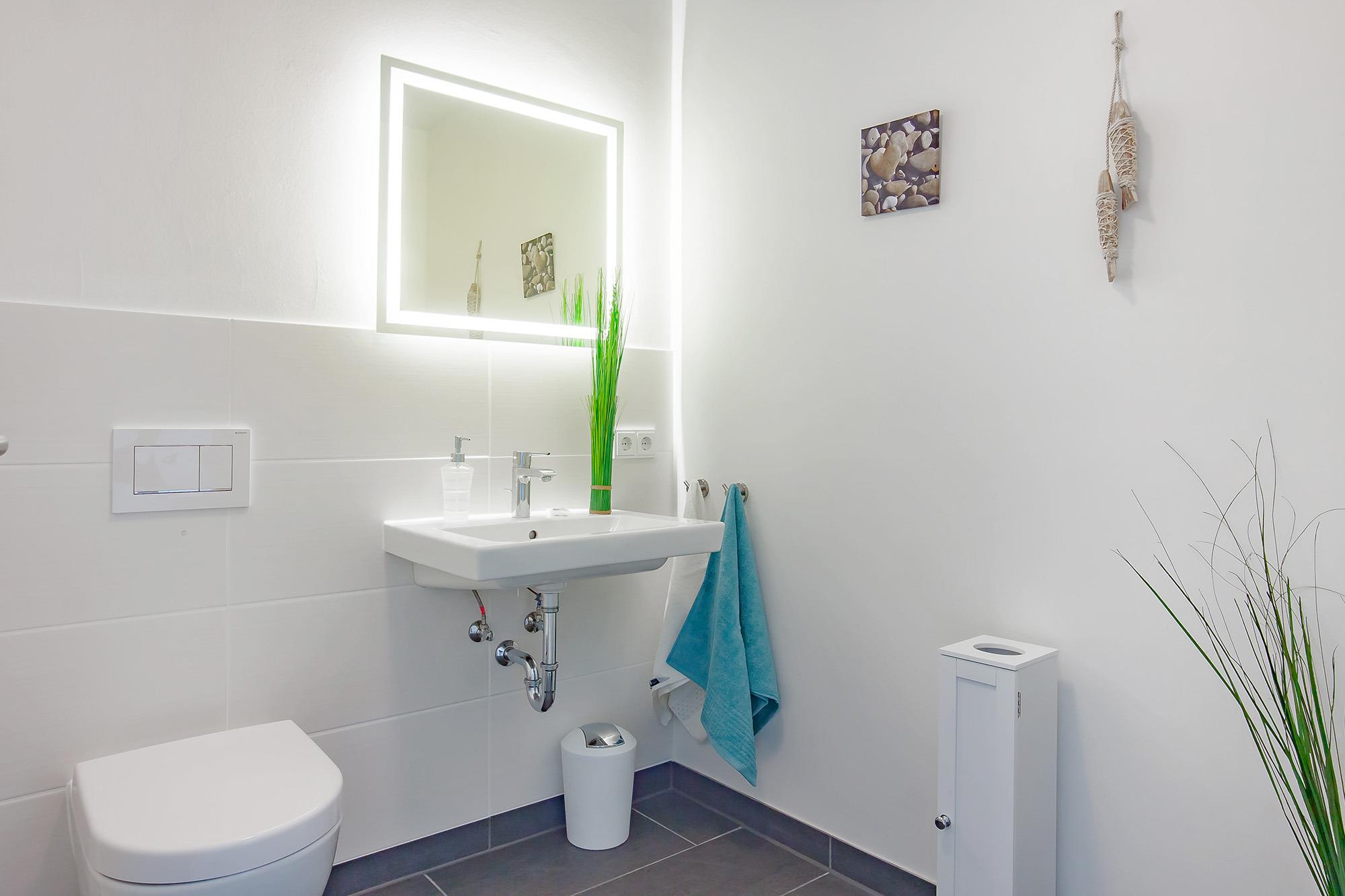 Das moderne Badezimmer überzeugt mit einer ebenerdigen Dusche, einem Handtuchwärmer und direktem Zugang zur Südterrasse, wo Sie sich nach einem erfrischenden Bad sonnen oder einfach die Seele baumeln lassen können. Ein separates Gäste-WC sorgt für zusätzlichen Komfort. Zudem steht Ihnen eine Waschmaschine zur Verfügung, sodass auch längere Aufenthalte problemlos möglich sind.