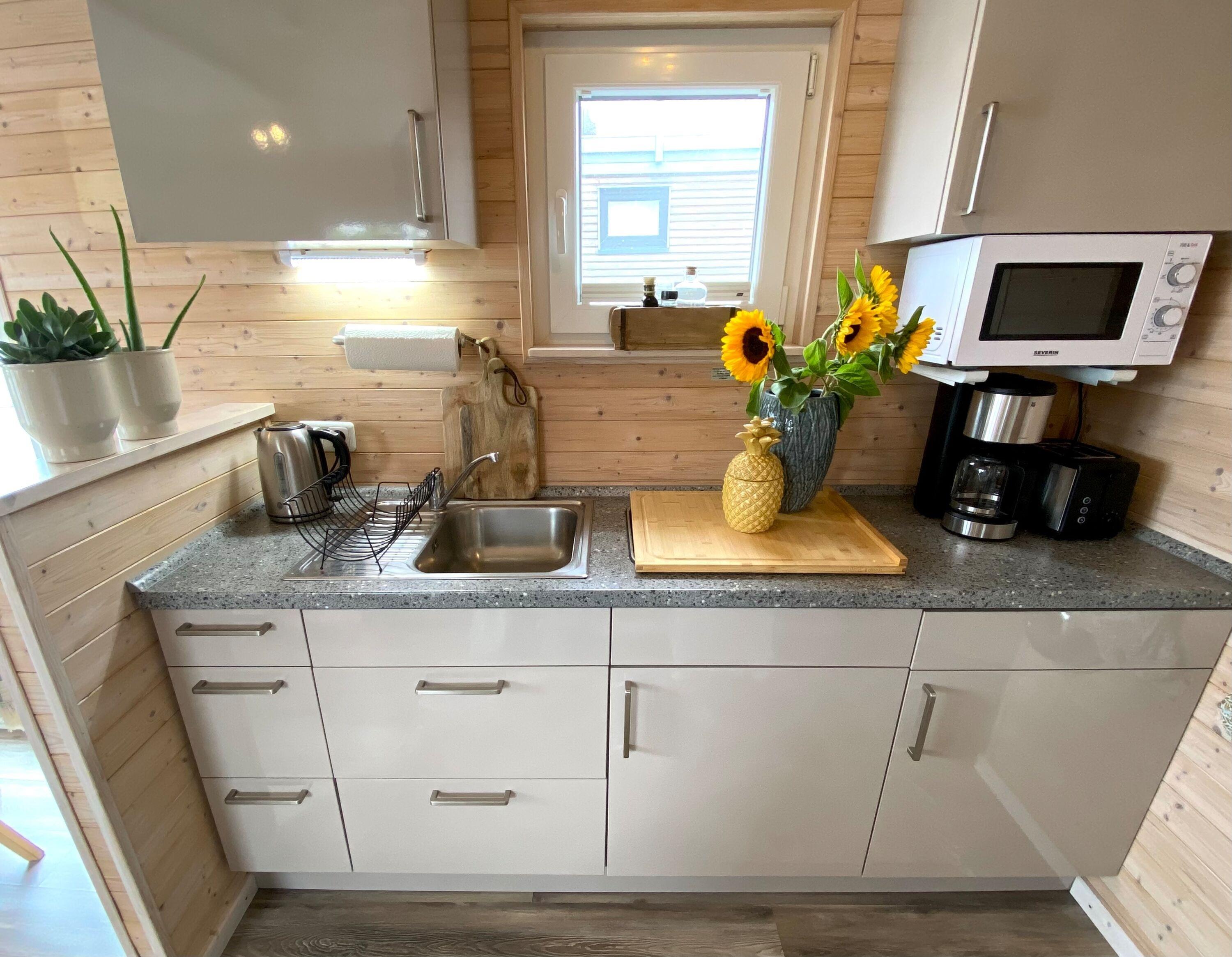 Die vielen Pflanzen und die Holzwände machen die Yara nicht nur wunderschön wohnlich, sondern schaffen auch ein besonders angenehmes Raumklima. Als kleines Highlight findet ihr auf der riesigen Dachterrasse noch einen Strandkorb und eine Sitzgruppe zum Relaxen, wenn dort die Sonne am Abend über der Ostsee untergeht.