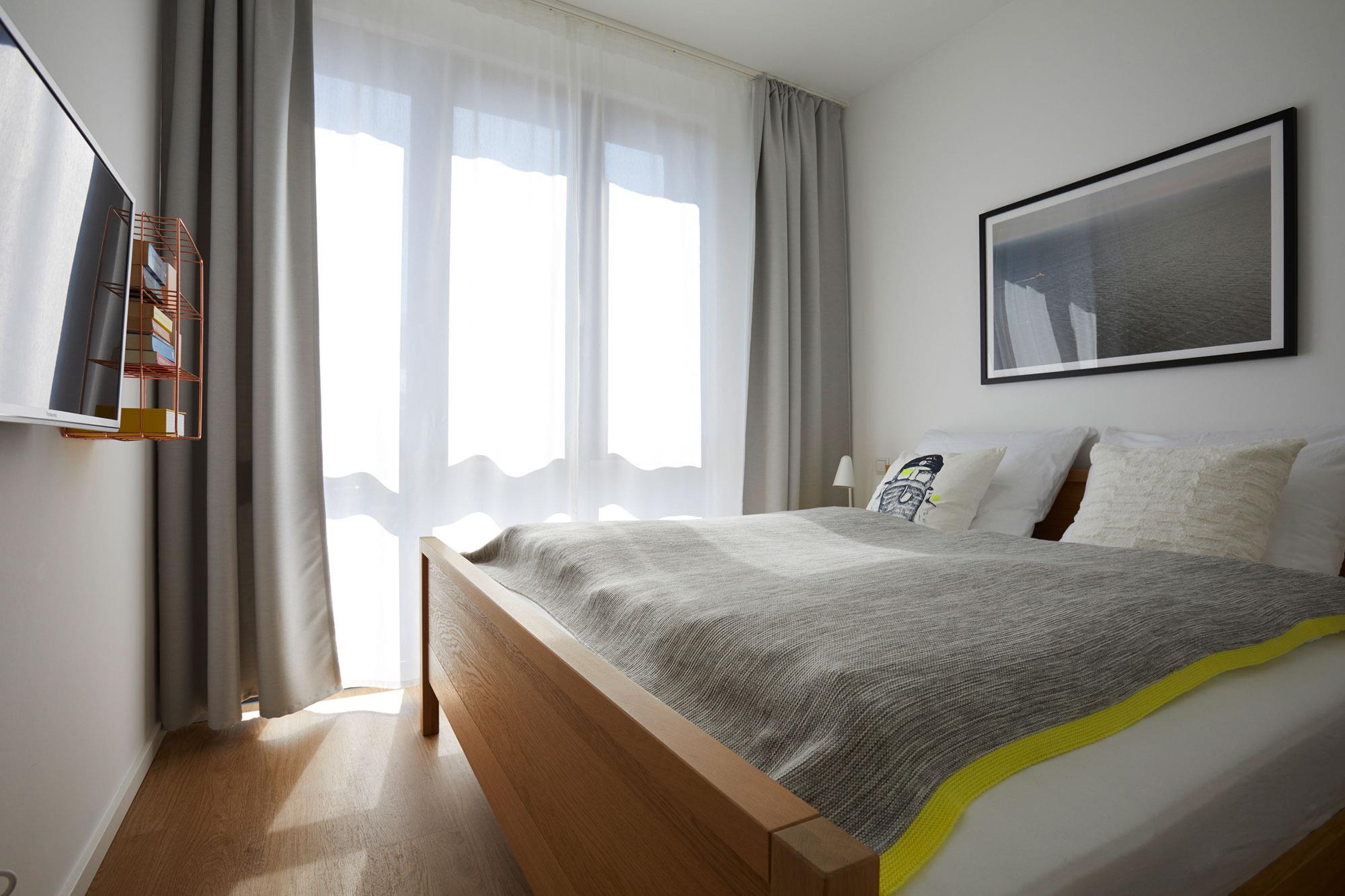 Die Heiligenhafenbude verfügt über ein separates Schlafzimmer mit Doppelbett und eigenem TV. Für zusätzlichen Schlafkomfort sorgt die Schlafcouch im Wohnbereich. Damit ist die Wohnung ideal für kleine Familien oder Paare. Für höchsten Komfort sind elektrische Außenrollos vorhanden, die für angenehme Dunkelheit und ungestörte Nächte sorgen. Allergikerfreundliche Bettwäsche, Handtücher sowie ein Babyreisebett können bei Bedarf gegen Gebühr geliehen werden. Ein Hochstuhl steht kostenlos zur Verfügung.