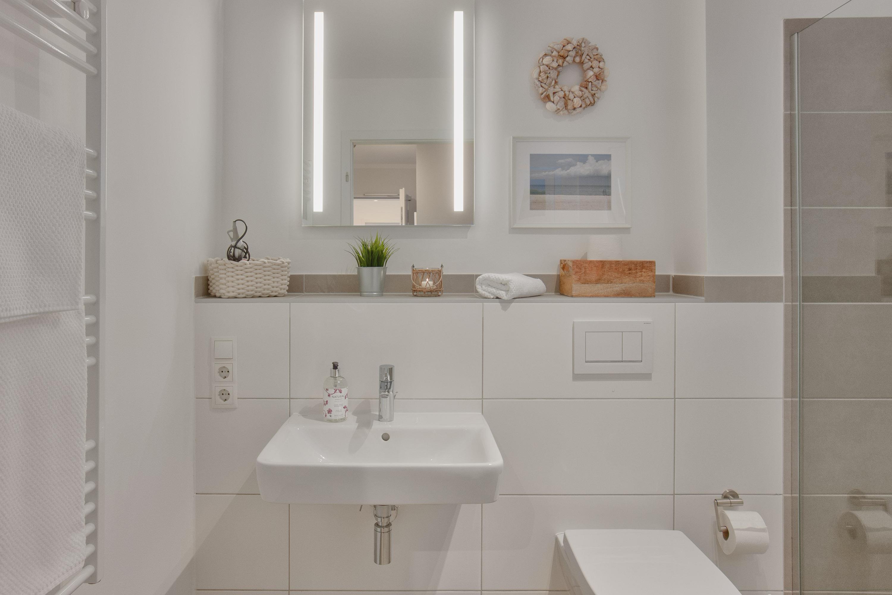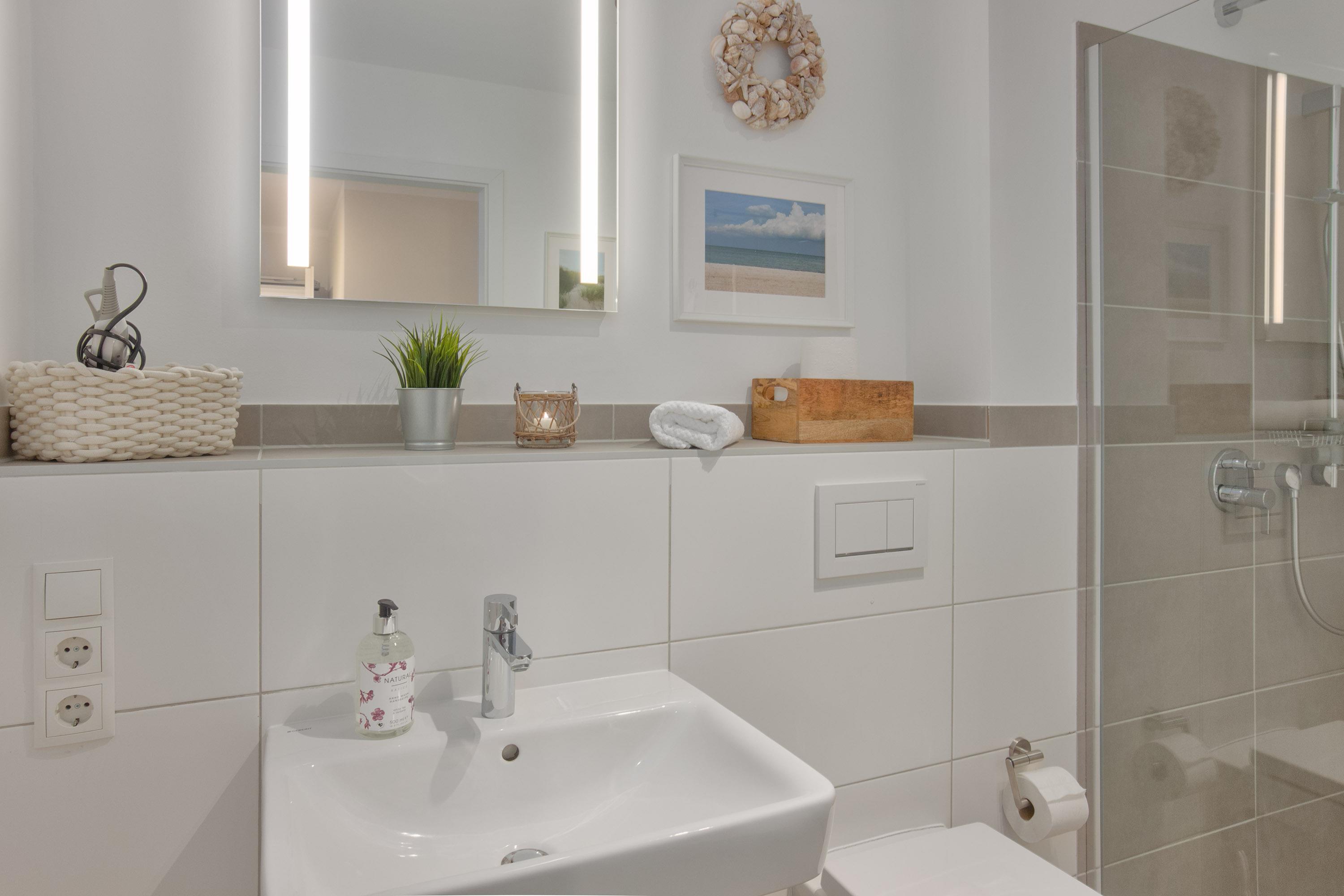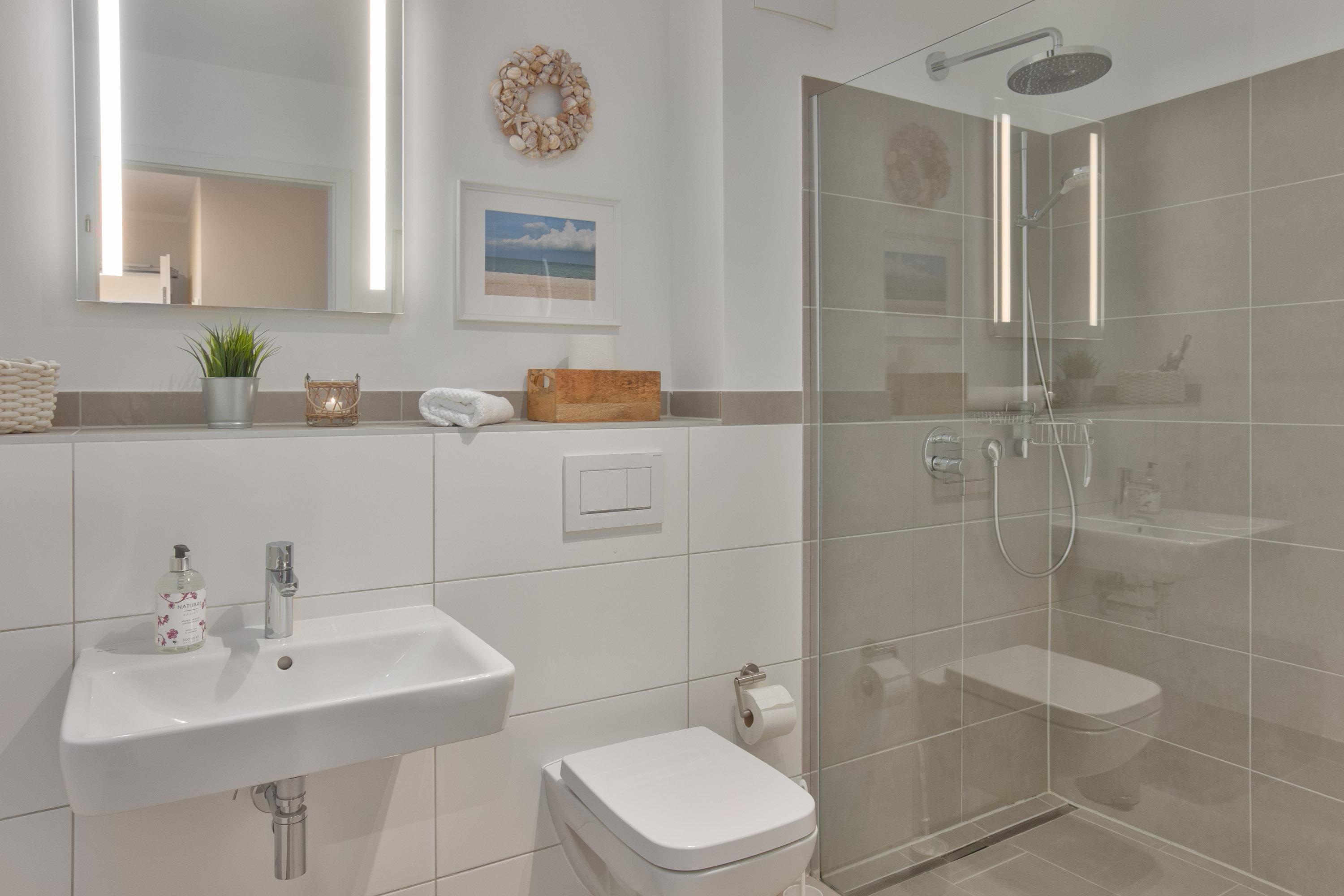 Das gut geschnittene, moderne Duschbad direkt neben den Schlafzimmern sorgt für weitere Bequemlichkeit. Die ebenerdige Dusche, WC, Waschbecken, Spiegel und Handtuchwärmer runden den Raum ab. Im kleinen Abstellraum ist zudem eine Waschmaschine verfügbar.
