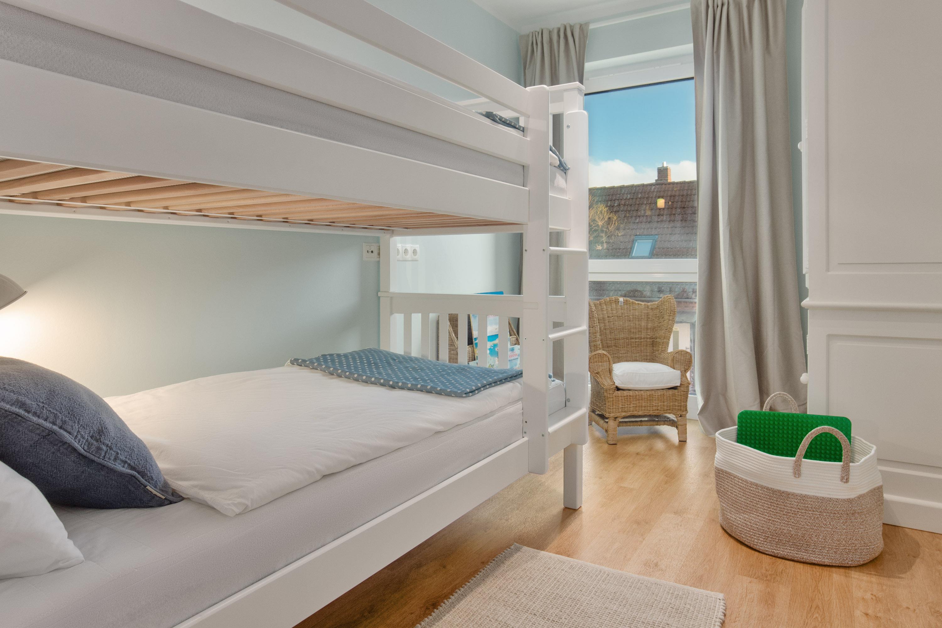 Ebenso komfortabel geht es im ersten Schlafzimmer der Wohnung weiter. Hier wartet ein einladendes Doppelboxspringbett (180x200) und TV. Das zweite Schlafzimmer hat ein Etagenbett (90x200, maximal 120kg je Liegefläche, optimal für Kinder).