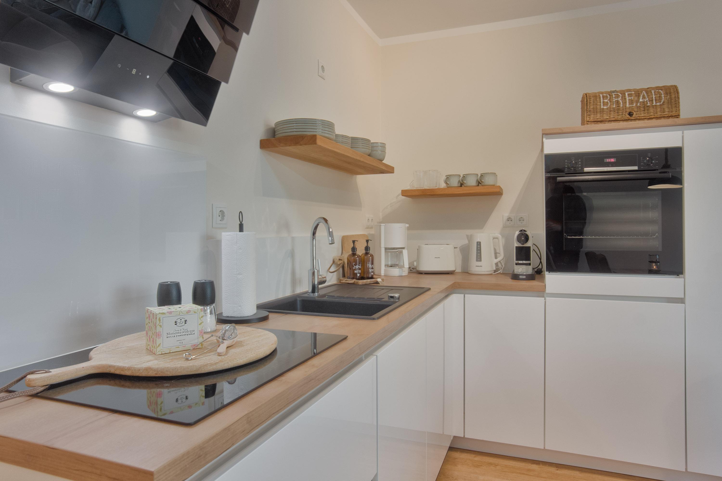 Auch die Küchenzeile wurde in den Wohnbereich integriert. Modern und durchdacht gestaltet, bietet Ihnen die Einbauküche alle Annehmlichkeiten für eine sorgenfreie Selbstversorgung.