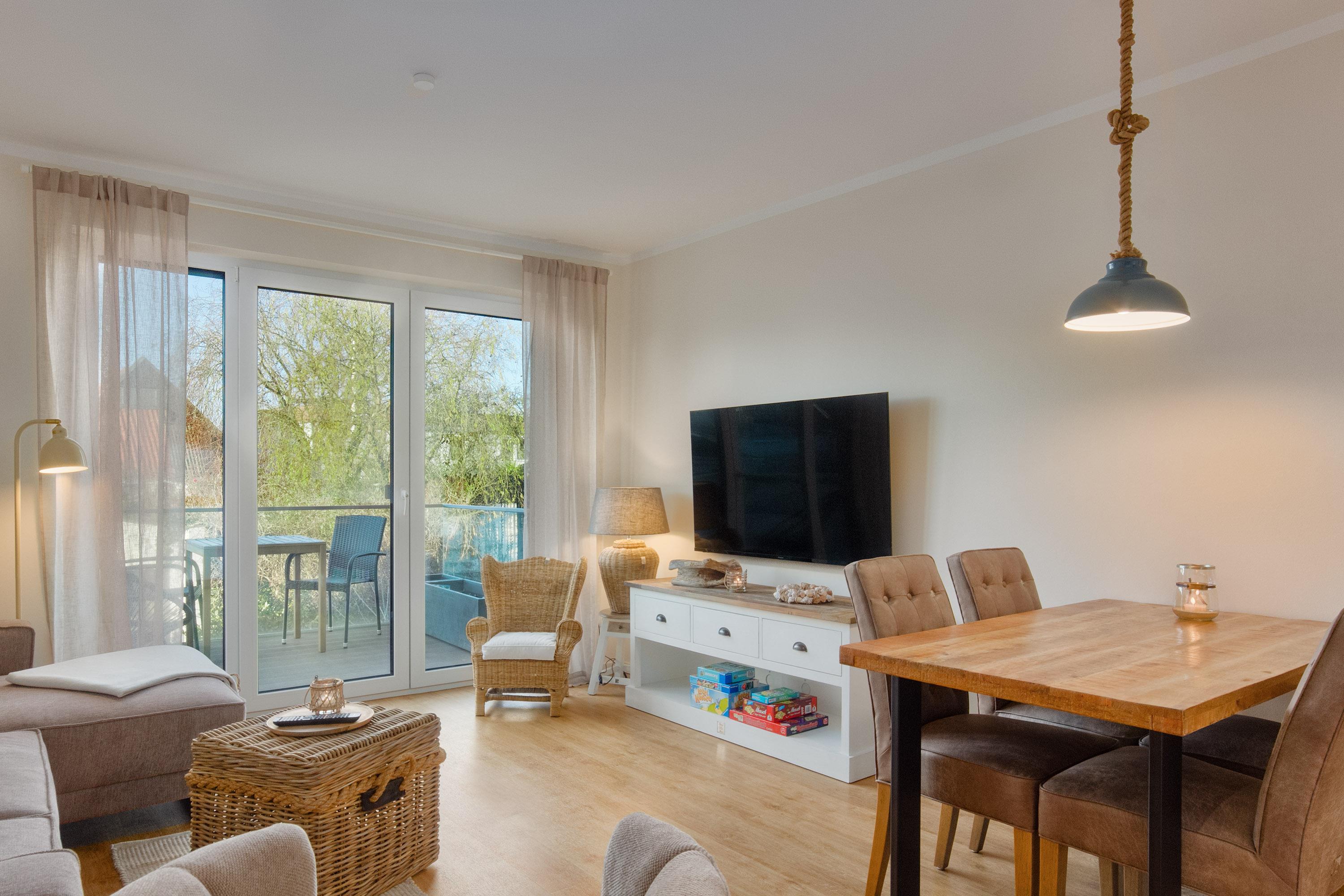 Herzstück ist der einladende Wohn- und Essbereich. Hier kann auf der gemütlichen Couch entspannt werden oder Sie genießen gesellige Stunden am Esstisch. Naturtöne und mit viel Geschick ausgewählte Dekorationen sorgen für ein wunderbar wohnliches Gefühl. TV und WLAN sind selbstverständlich. Durch die großen, charmanten Fenster haben Sie einen Blick in die Außenanlage vom Harbour Side Heiligenhafen.