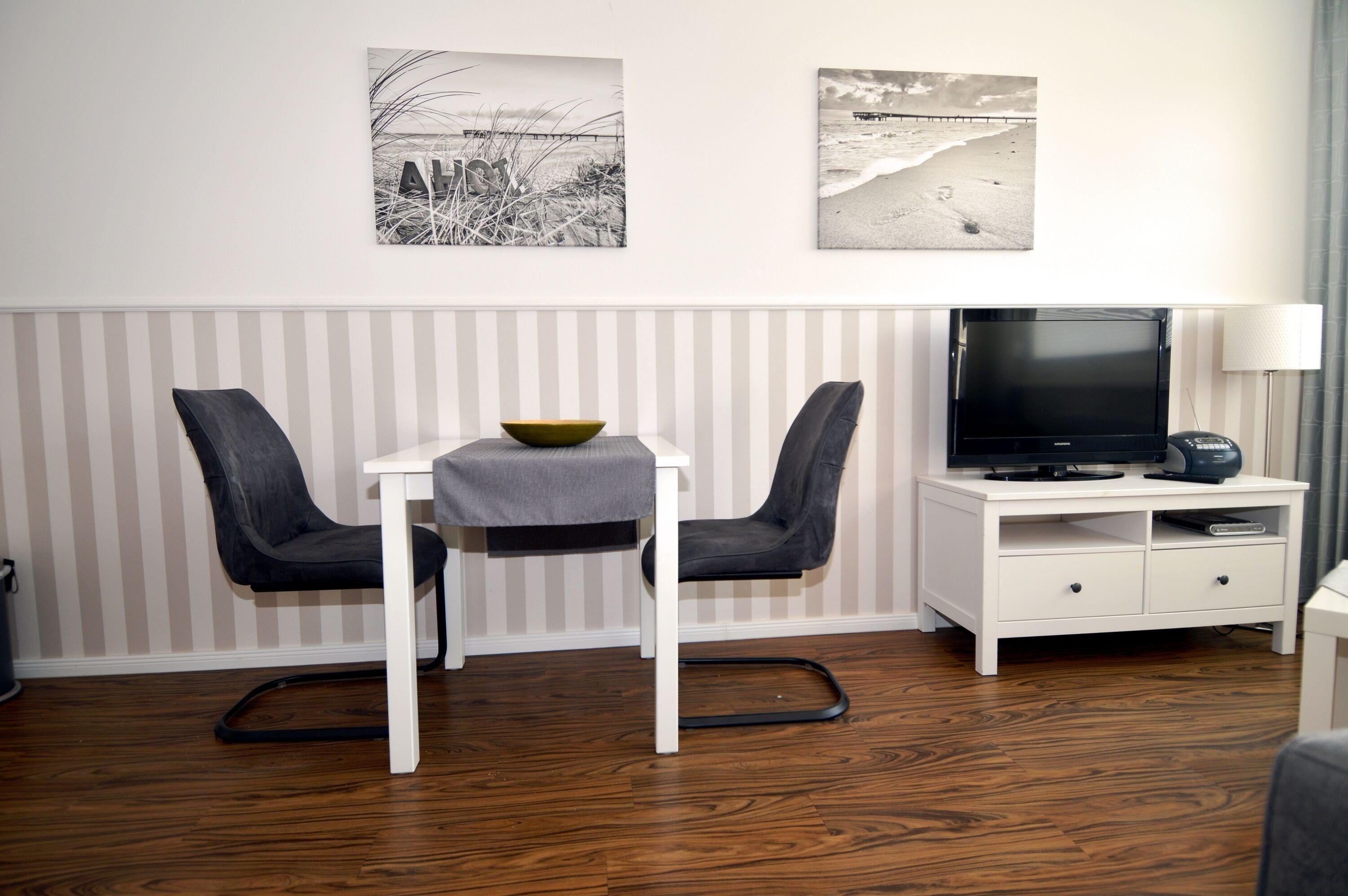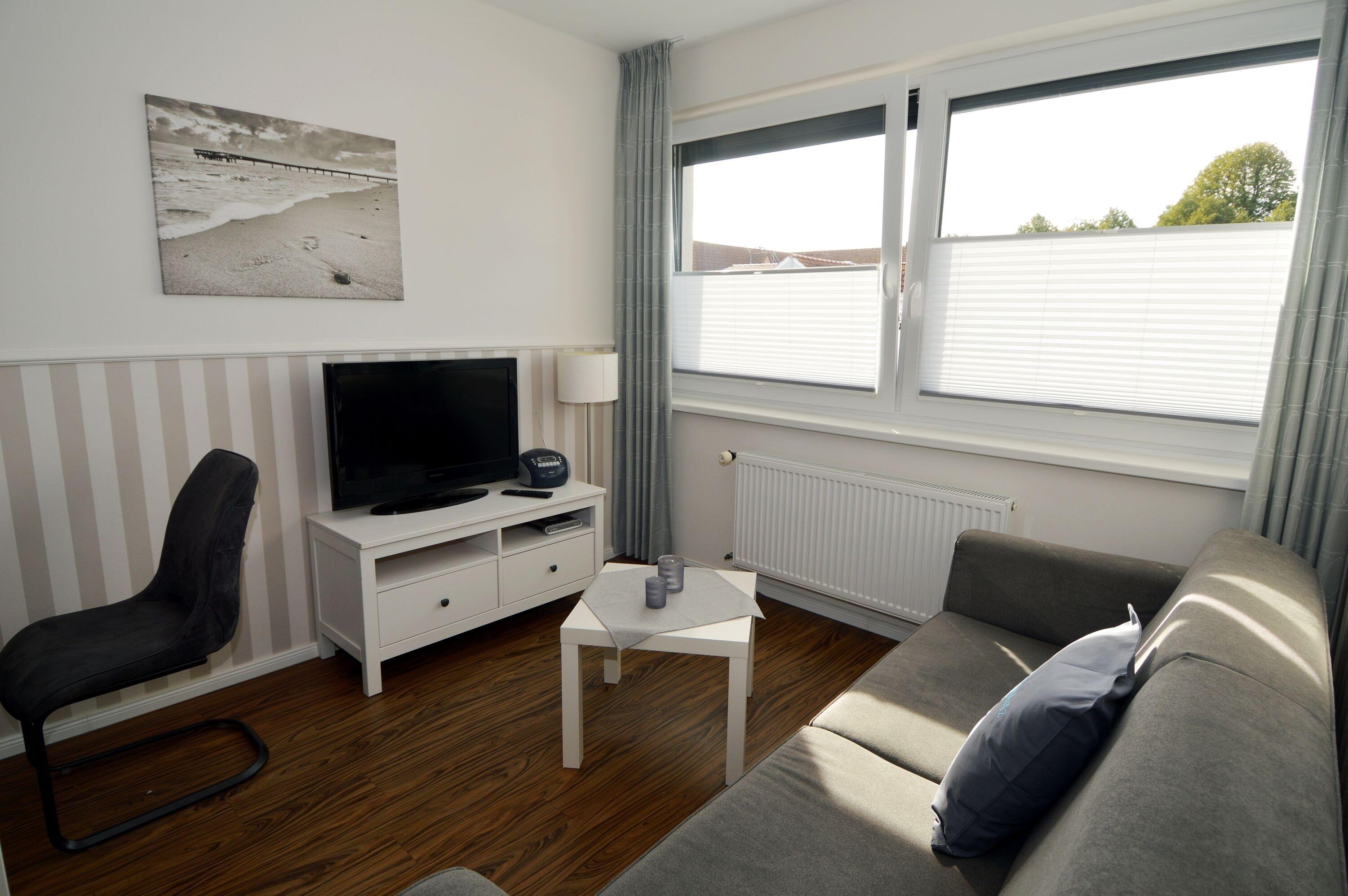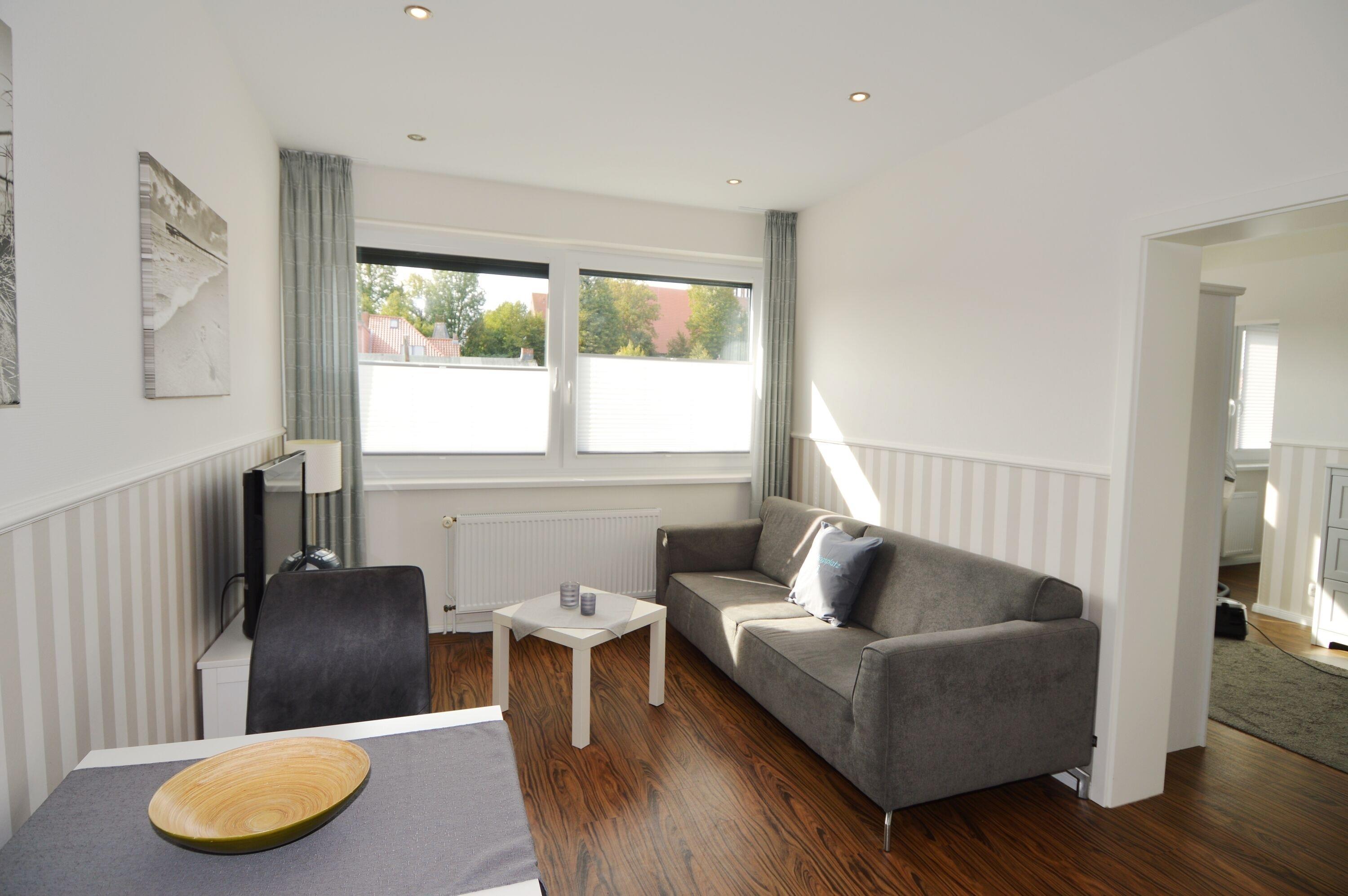 Der Wohnbereich ist freundlich gestaltet und bietet ausreichend Platz für entspannte Stunden nach einem erlebnisreichen Urlaubstag. Von hier aus genießen Sie den Blick nach Süden über die Altstadt von Heiligenhafen bis hin zur Stadtkirche, was der Wohnung eine besondere Atmosphäre verleiht – besonders in den Abendstunden.