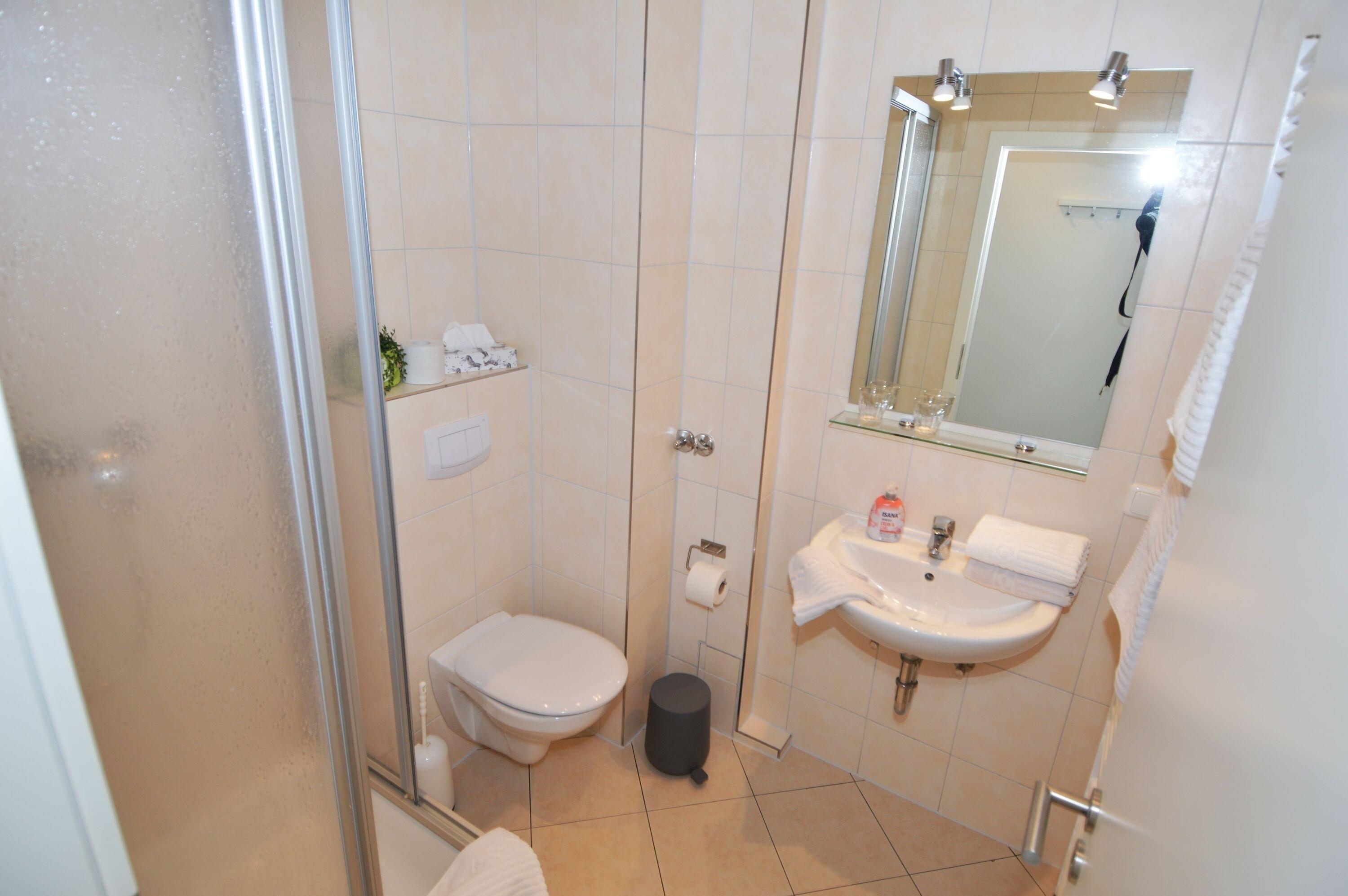 Das Badezimmer präsentiert sich gepflegt und zweckmäßig und ist mit Dusche, Waschbecken und WC ausgestattet.