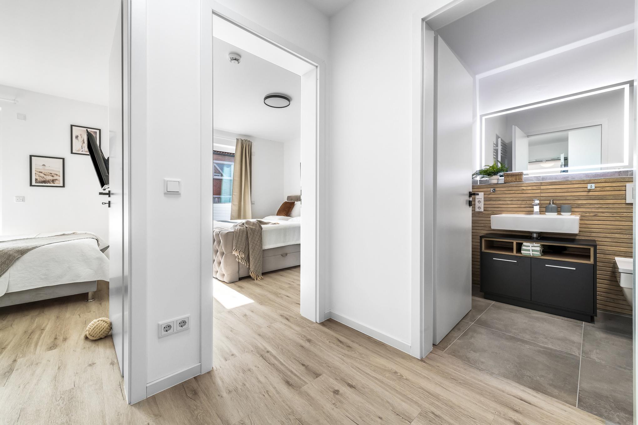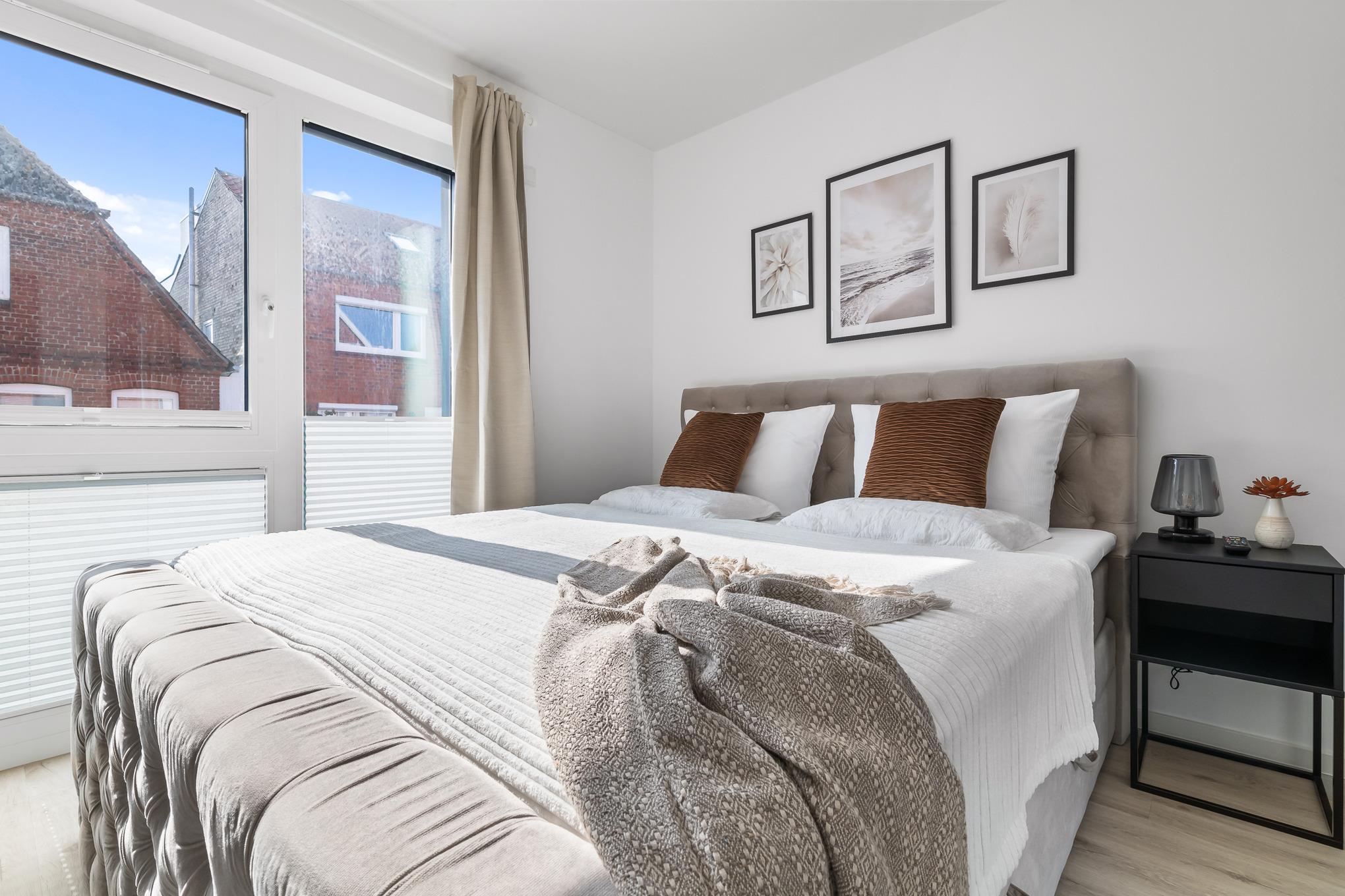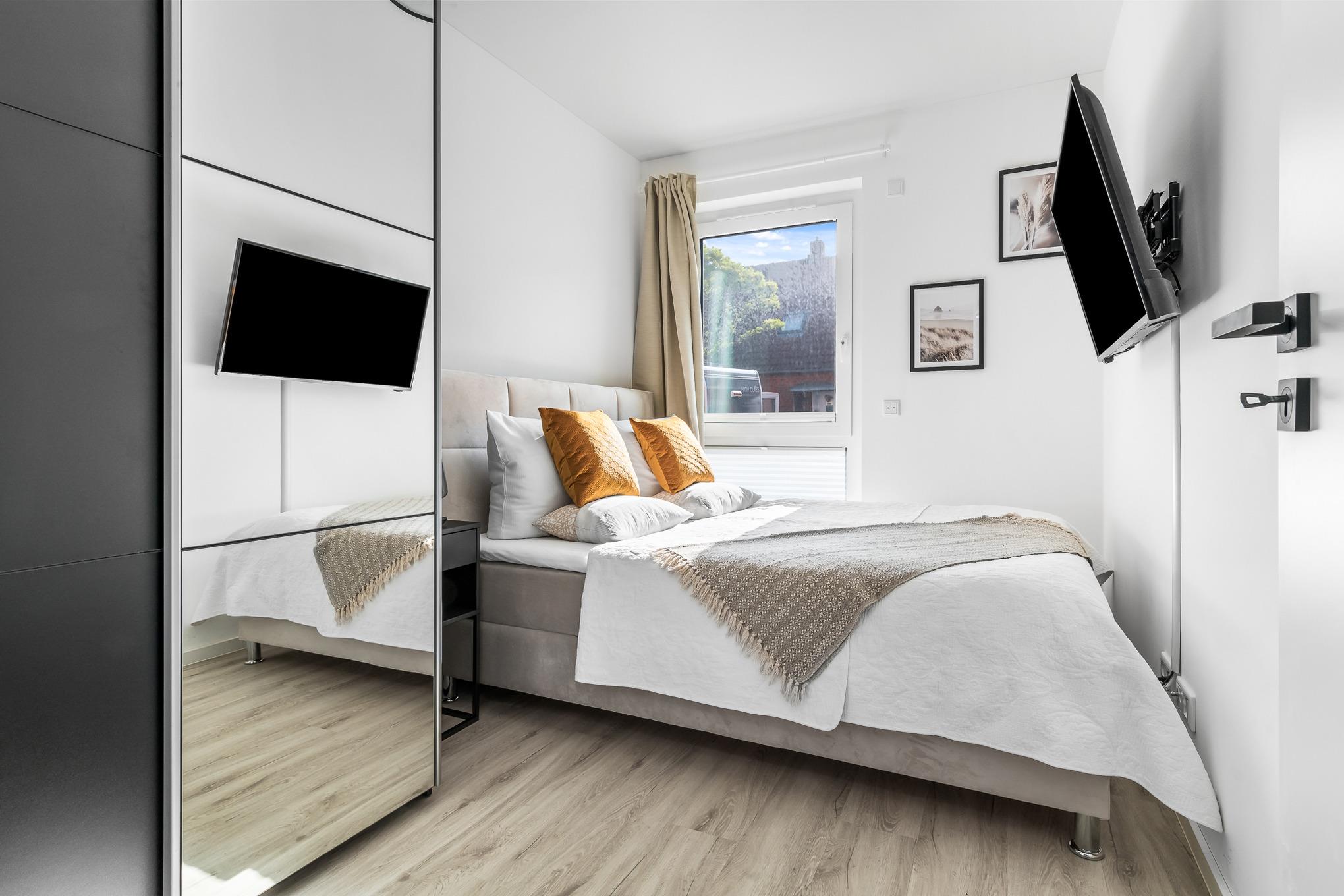 Ebenso komfortabel geht es in den zwei Schlafzimmern der Wohnung weiter. Hier warten einladende Doppelboxspringbetten (180x200 + 160x200), große Kleiderschränke und jeweils zusätzlich ein TV. Für Verdunklung sorgen Plissees und Vorhänge.