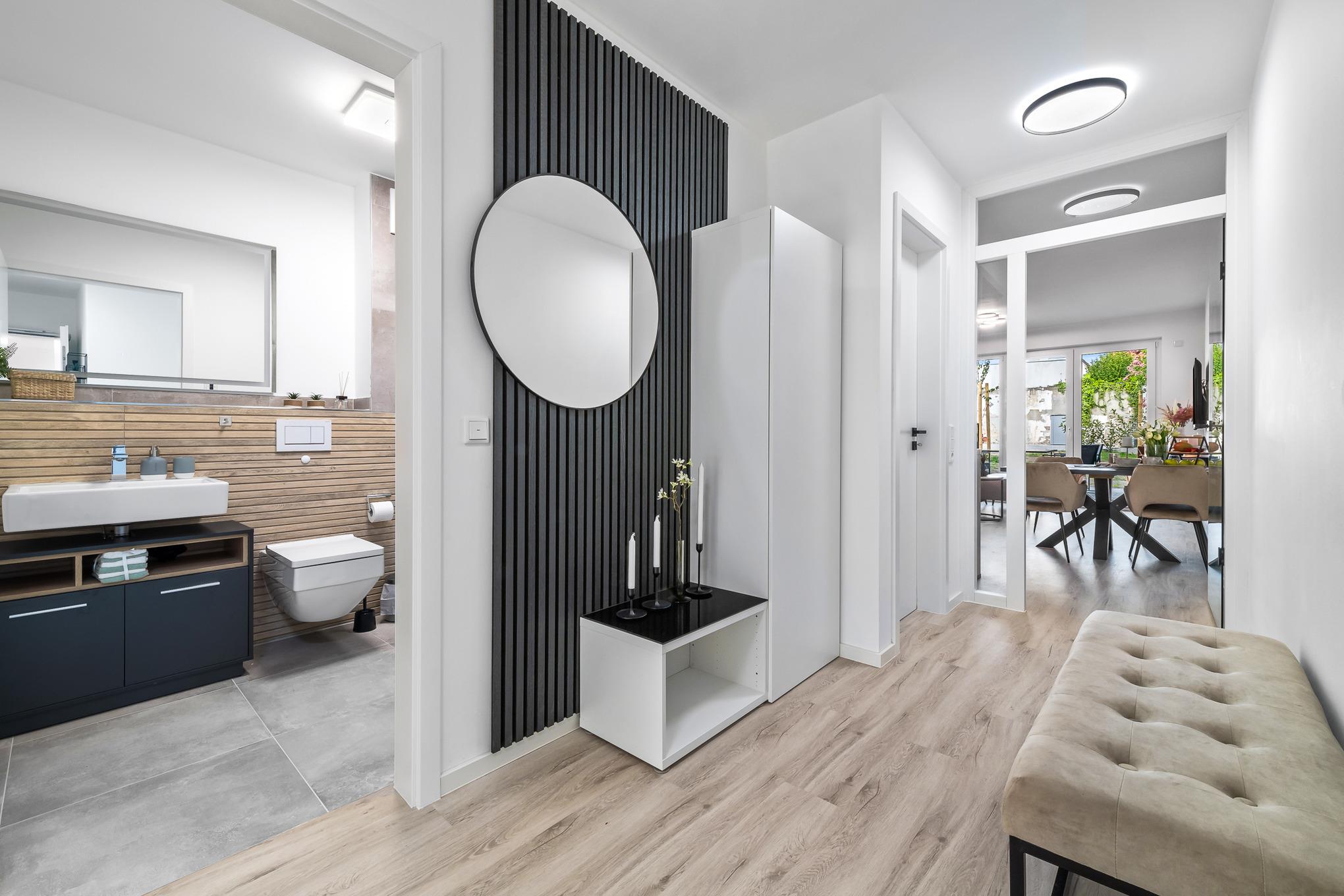 Das gut geschnittene, moderne Duschbad direkt neben dem Schlafzimmer sorgt für weitere Bequemlichkeit. Die ebenerdige Dusche, WC, Waschbecken, Spiegel und ein Handtuchwärmer runden den Raum ab.
