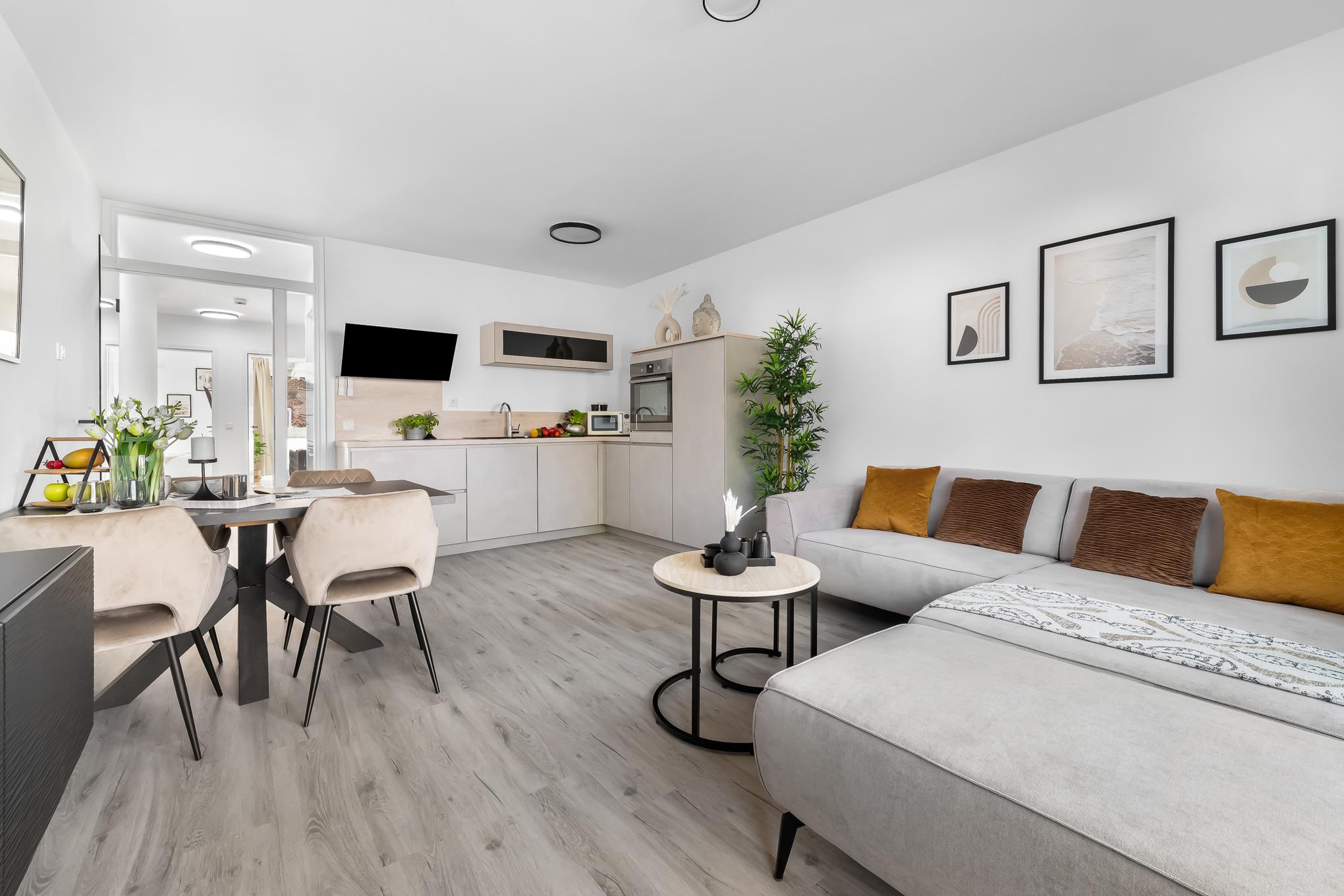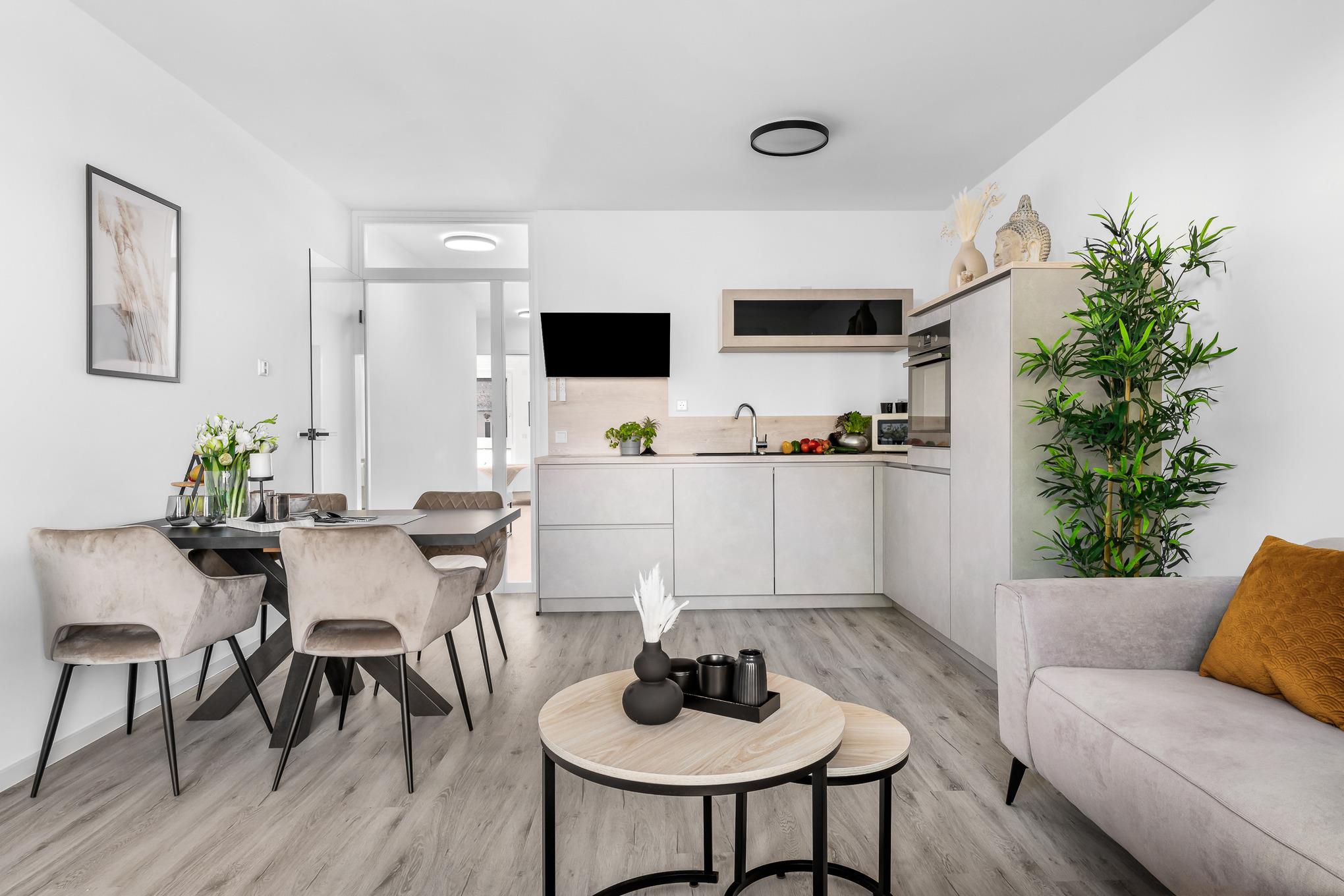 Auch die Küchenzeile wurde in den Wohnbereich integriert. Modern und durchdacht gestaltet, bietet Ihnen die Einbauküche alle Annehmlichkeiten für eine sorgenfreie Selbstversorgung. Als Kaffeemaschine steht Ihnen eine Kapselmaschine zur Verfügung.