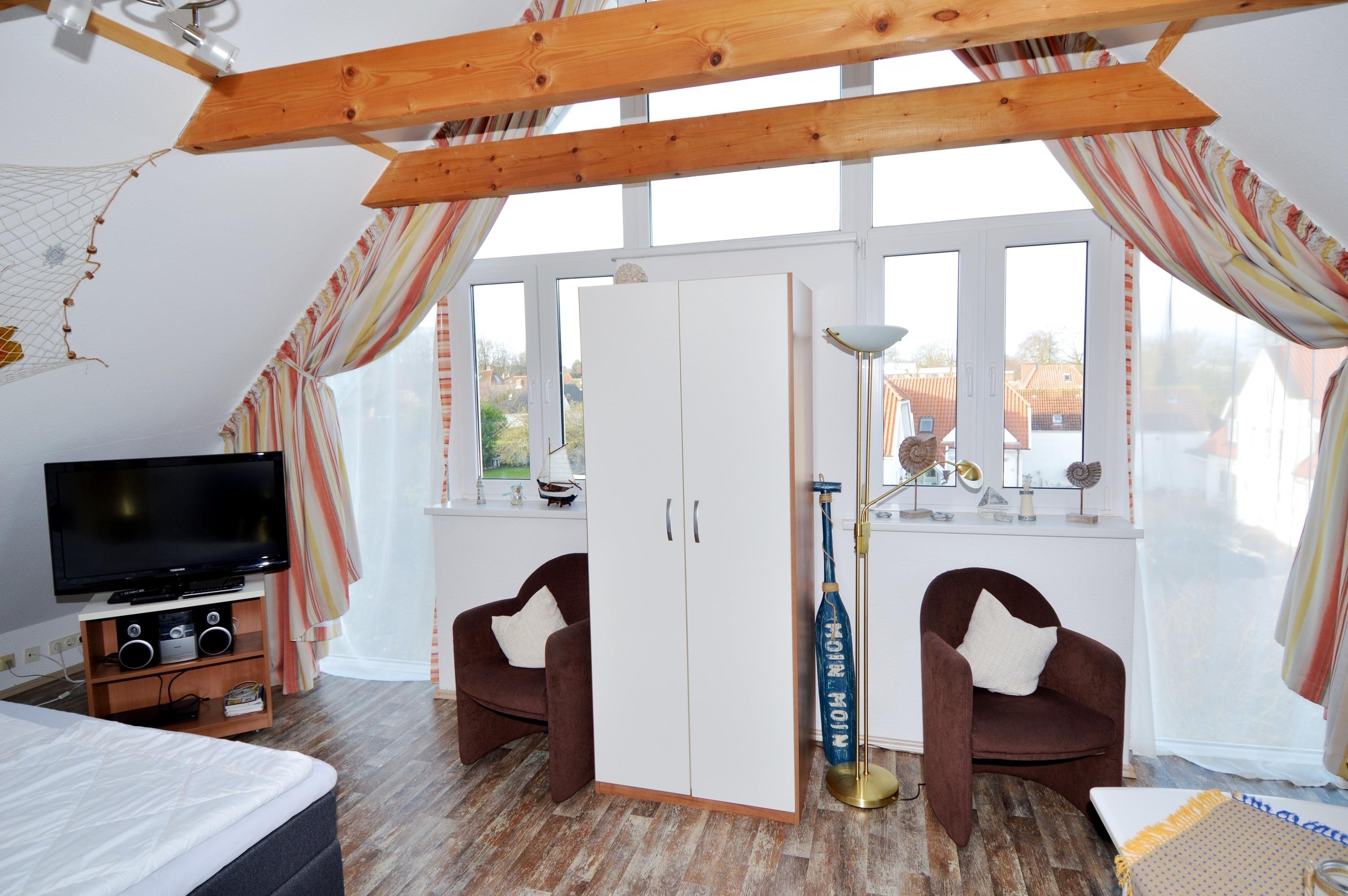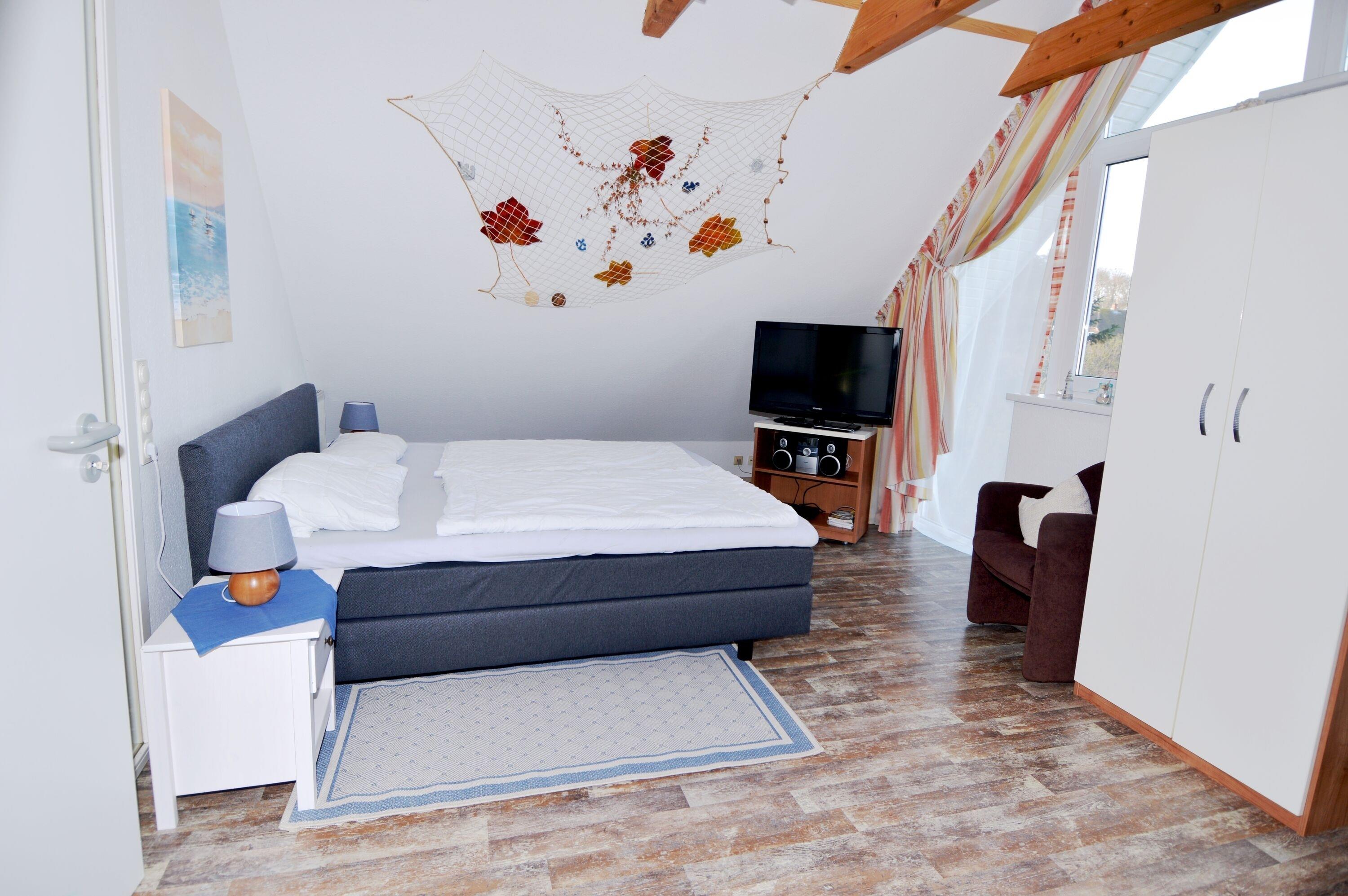 Der offen gestaltete Wohn- und Schlafbereich bildet das Herzstück der Wohnung. Er ist mit einer gemütlichen Couch, einem komfortablen Doppel-Boxspringbett (180 x 200 cm) sowie einem Kleiderschrank ausgestattet. Vorhänge zur Verdunklung sorgen für erholsame Nächte und eine angenehme Atmosphäre. Ein Fernseher, WLAN / WiFi sowie ein Radio stehen für Unterhaltung und Komfort zur Verfügung. Durch die Lage in der zweiten Etage genießen Sie zudem einen schönen Blick in Richtung Binnensee, der dem Raum eine besondere Urlaubsstimmung verleiht.