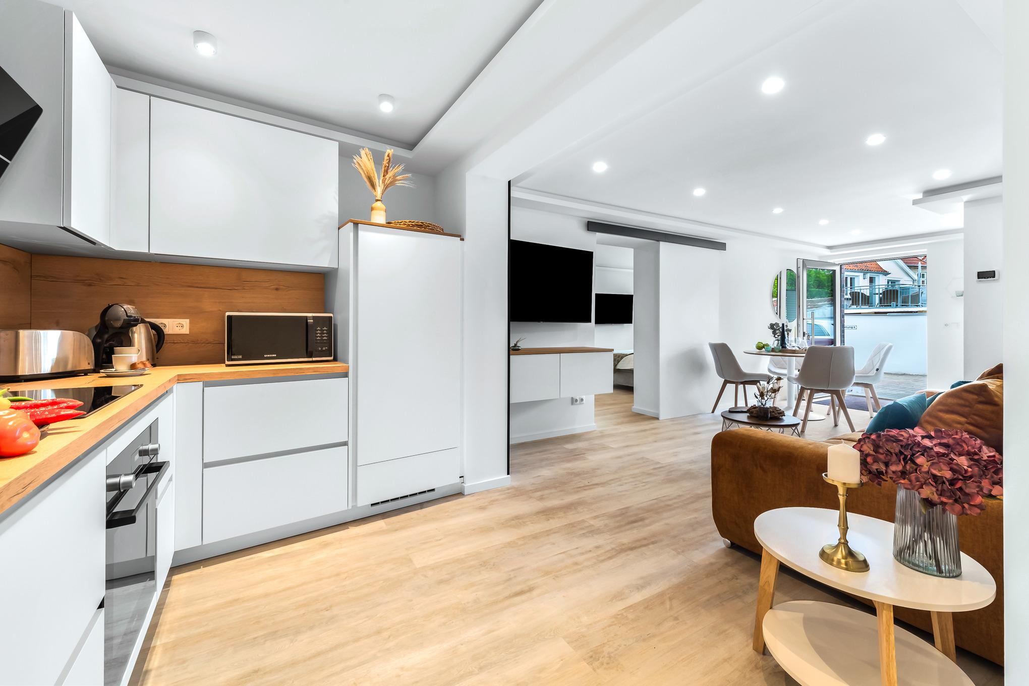 Die offene Küche ist in den Wohnbereich integriert und bietet alle Annehmlichkeiten für eine sorgenfreie Selbstversorgung. Eine Nespresso-Kapselmaschine steht ebenfalls zur Verfügung. Im Schlafzimmer erwartet die Gäste ein bequemes Doppelbett (180x200) und ein zusätzlicher Fernseher. Der große Kleiderschrank bietet ausreichend Platz für Kleidung. Im zweiten Schlafzimmer befindet sich ein Etagenbett (geeignet für Kinder), das auch ausziehbar ist. Hier können bis zu 3 Kinder schlafen. Elektrische Außenjalousien sorgen für Verdunklung und Sichtschutz.