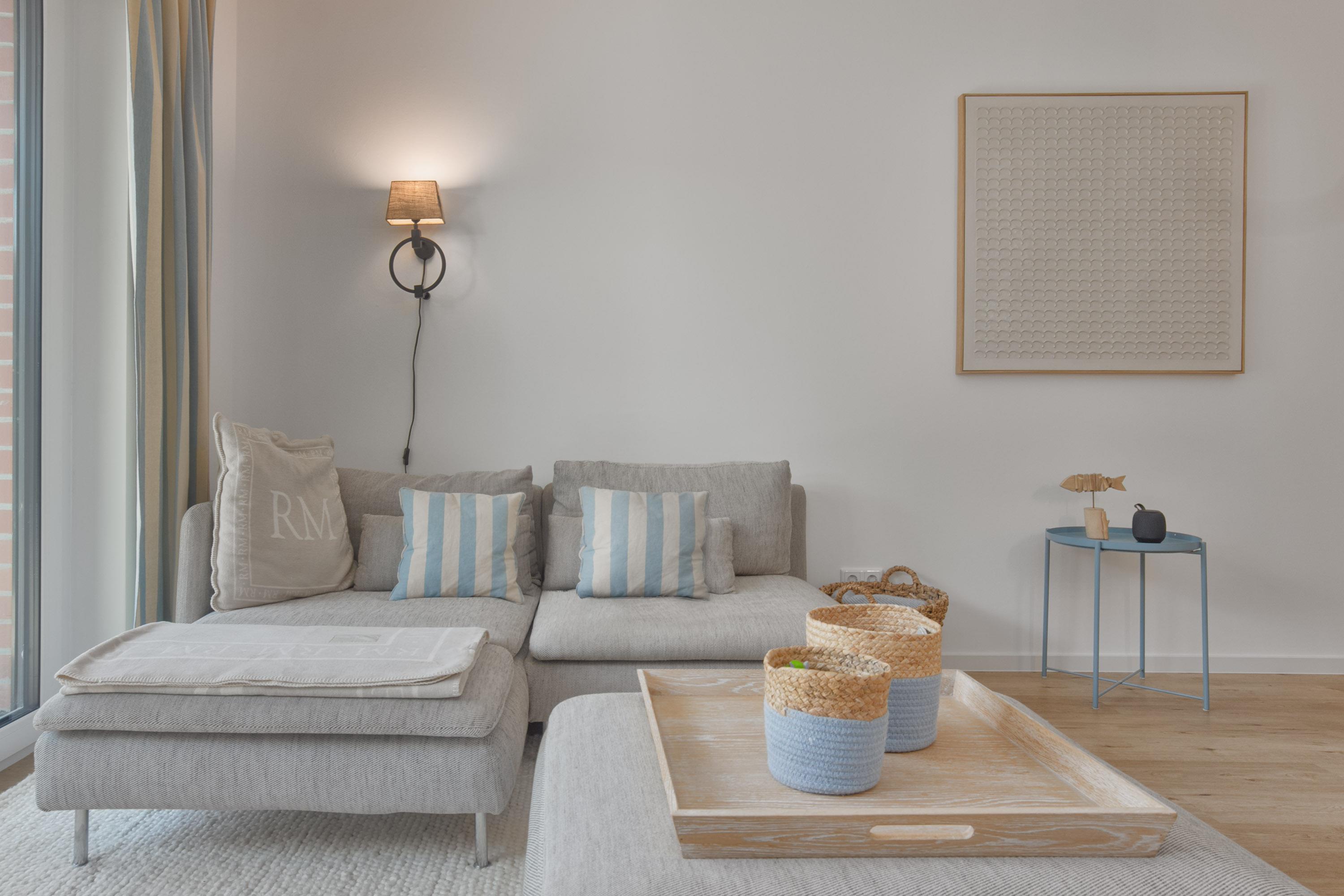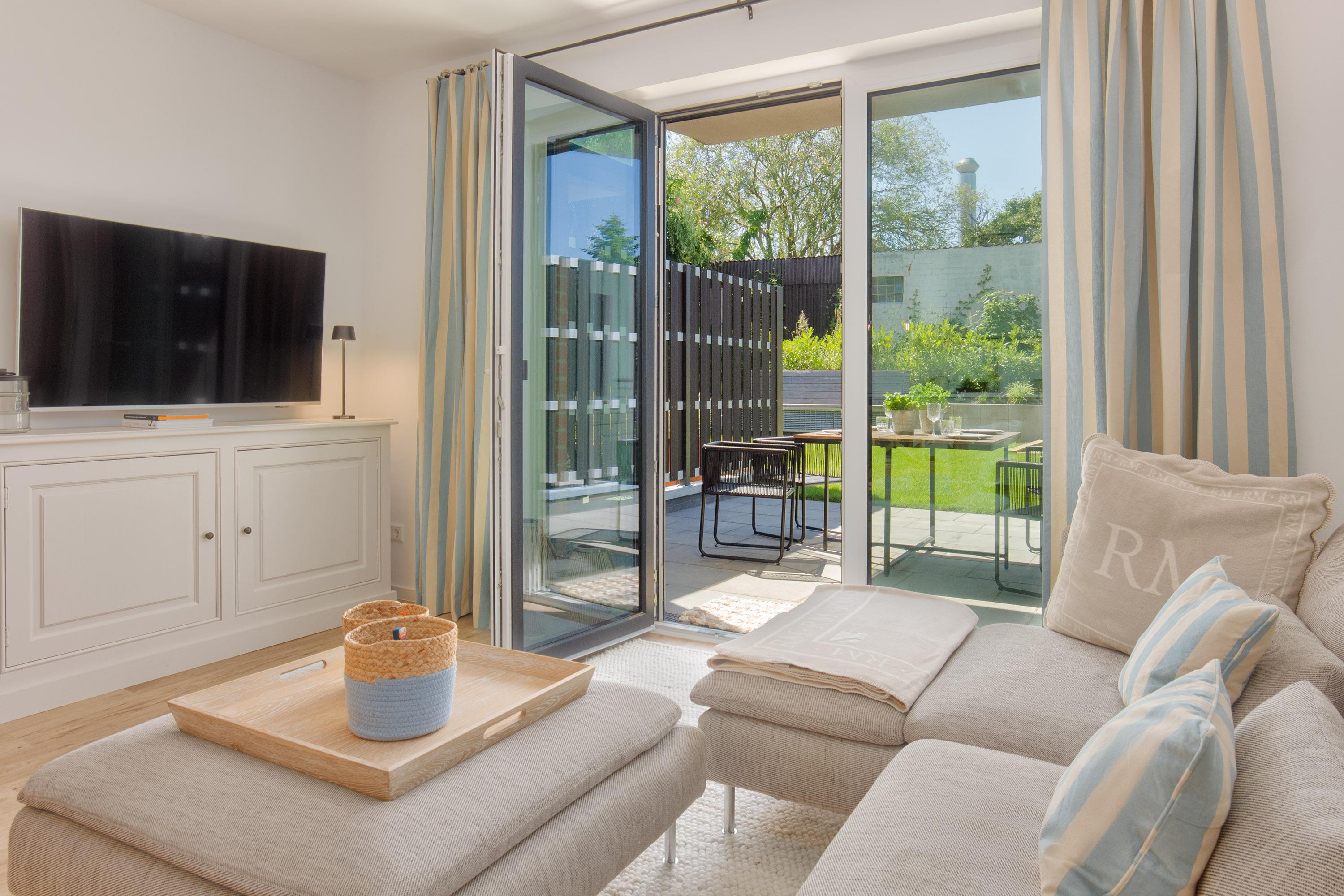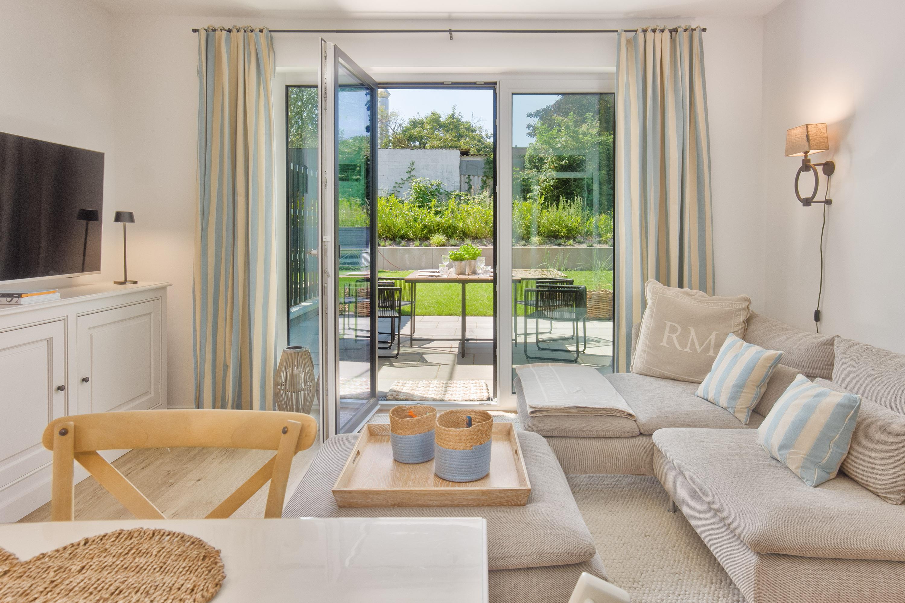 Herzstück ist der große und einladende Wohn- und Essbereich. Hier kann auf der gemütlichen Couch entspannt werden oder Sie genießen gesellige Stunden am direkt angeschlossenen Essbereich. Naturtöne und ausgewählte Dekorationen sorgen für ein wunderbar wohnliches Gefühl. Mit dem WLAN / WiFi können Sie auch im Urlaub bequem online bleiben oder ihre Lieblingsserien oder Filme per Stream schauen. Die Fenster bringen jede Menge natürliches Licht in die Unterkunft und bieten direkt von der Couch den Blick auf die Terrasse. Elektrische Soft-Screen-Jalousien sorgen hierbei für Verdunklung oder Sichtschutz.