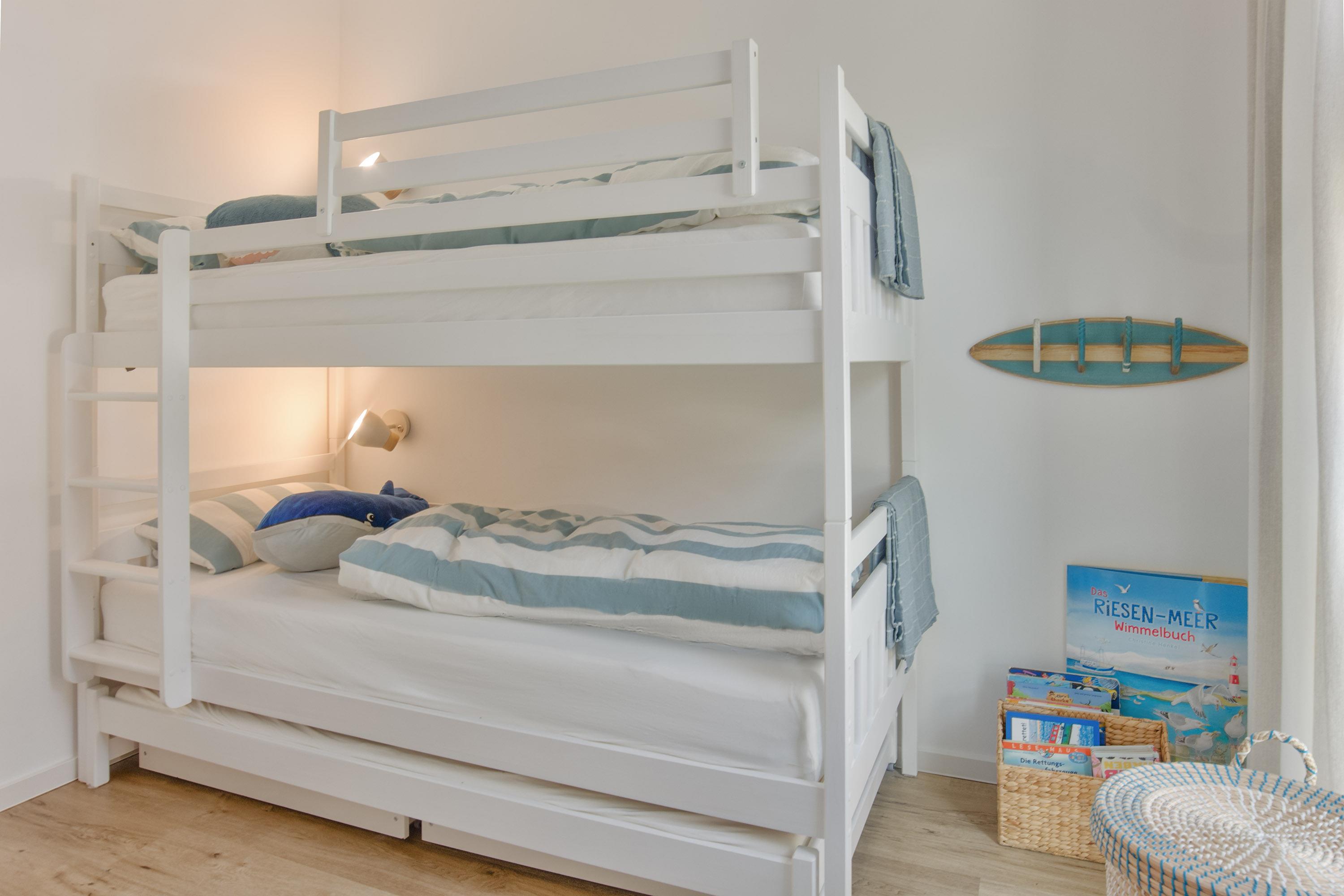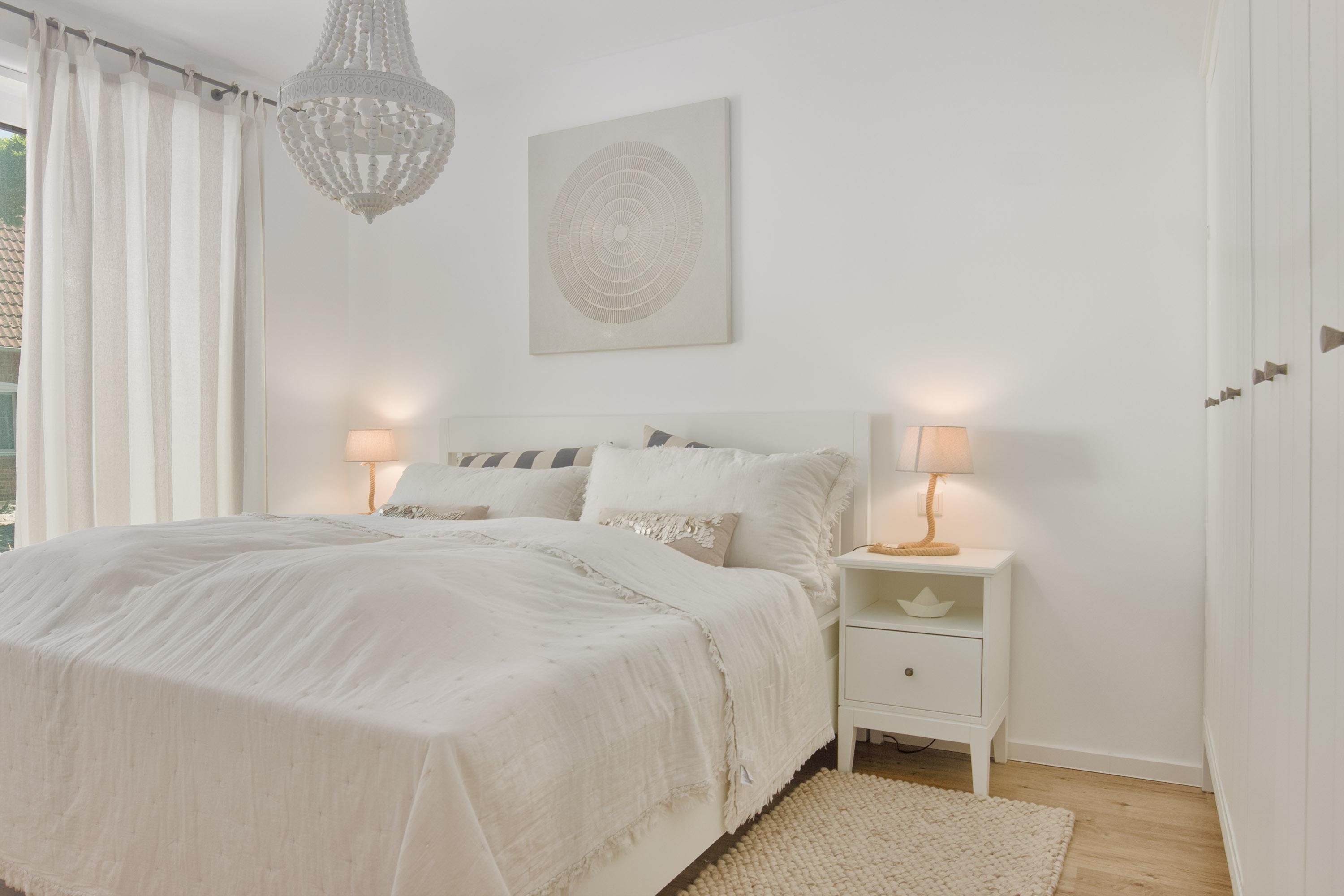 Zwei Schlafzimmer stehen zur Verfügung. Das 1.Schlafzimmer mit Doppelbett (180x200) und TV und das 2.Schlafzimmer mit Etagenbett (für Kinder!, 90x200). Große Kleiderschränke bieten dabei ausreichenden Stauraum. Allergiker geeignete Bettwäsche, Handtuchsets, Babyreisebett (ohne Bettzeug) können bei Bedarf gegen Gebühr geliehen werden. Ein Hochstuhl gehört zur Ausstattung. Für Verdunklung und nächtliche Ruhe sorgen Rollos und Vorhänge.