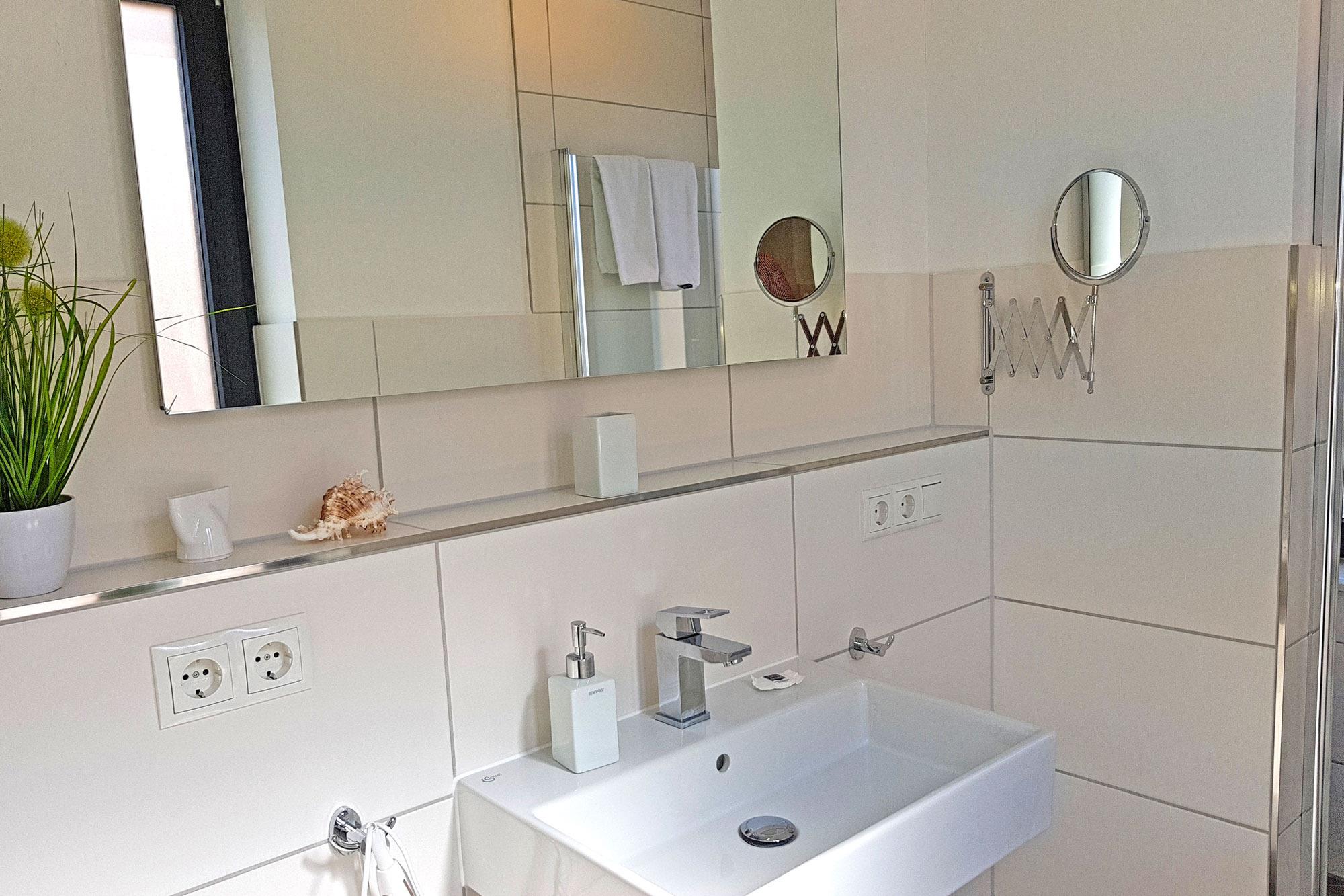 Die drei Bäder des Hauses – eines auf jeder Etage – sind komfortabel ausgestattet. Zwei davon verfügen über eine Dusche, während das Highlight des großen Badezimmers die integrierte Sauna ist – perfekt, um nach einem erlebnisreichen Tag an der Ostsee zu entspannen. Handtuchwärmer und WC sind selbstverständlich vorhanden. Ein zusätzliches Gäste-WC im Erdgeschoss bietet weiteren Komfort.