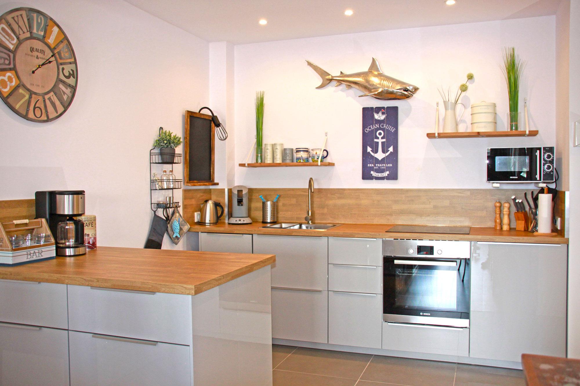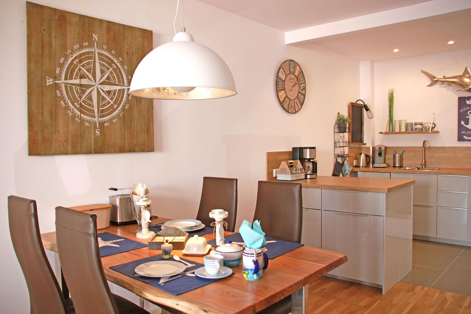 Die offene, voll ausgestattete Küche mit Spülmaschine, Induktionsherd und Kaffeemaschine lässt keine Wünsche offen. Direkt angrenzend bietet der Essbereich Platz für bis zu vier Personen. Damit können Sie auch im Urlaub stilvoll speisen und genießen.