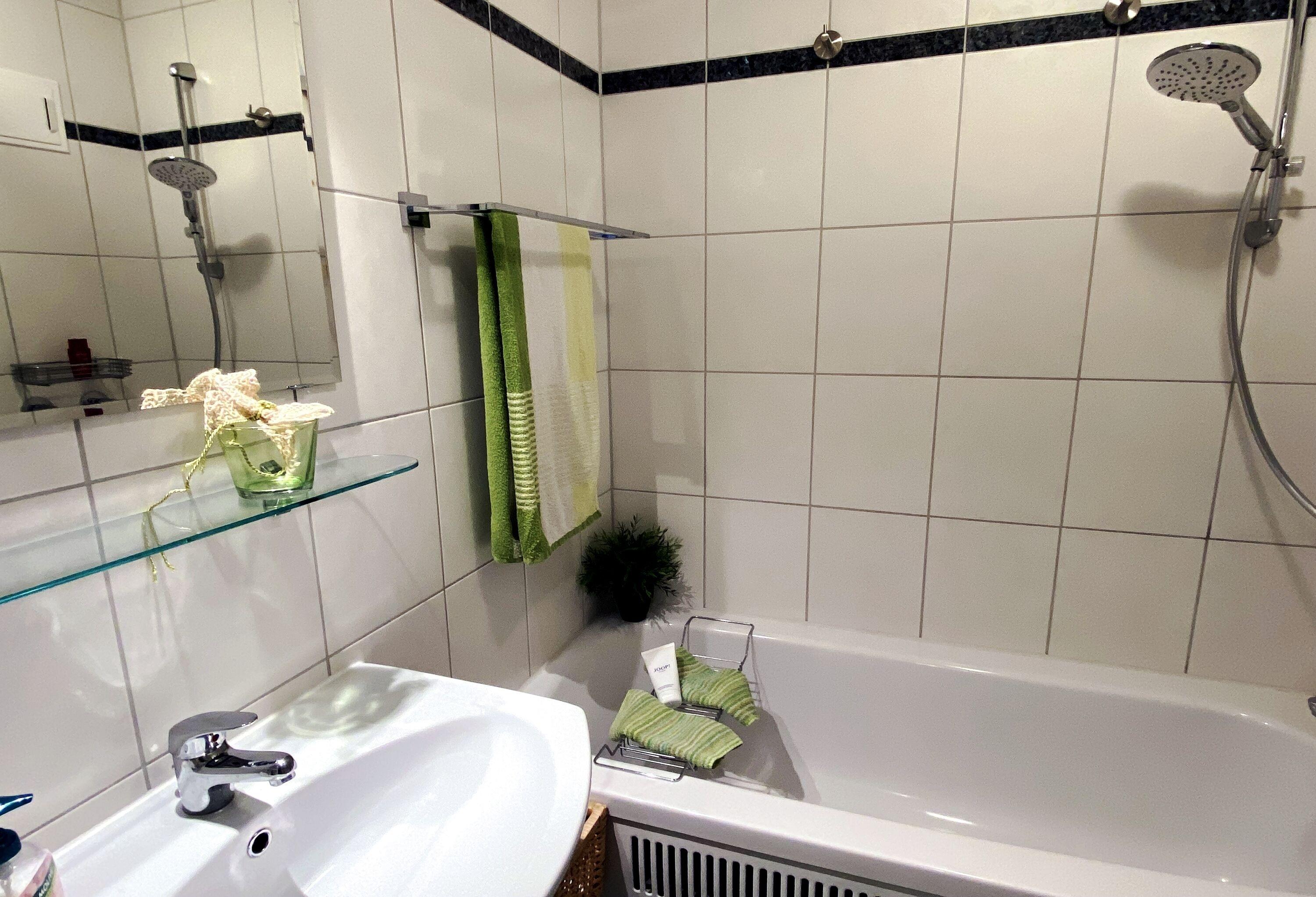 Das Badezimmer ist gepflegt und funktional ausgestattet und verfügt über eine Badewanne, einen Haartrockner sowie zahlreiche Ablagemöglichkeiten, die für zusätzlichen Komfort sorgen.