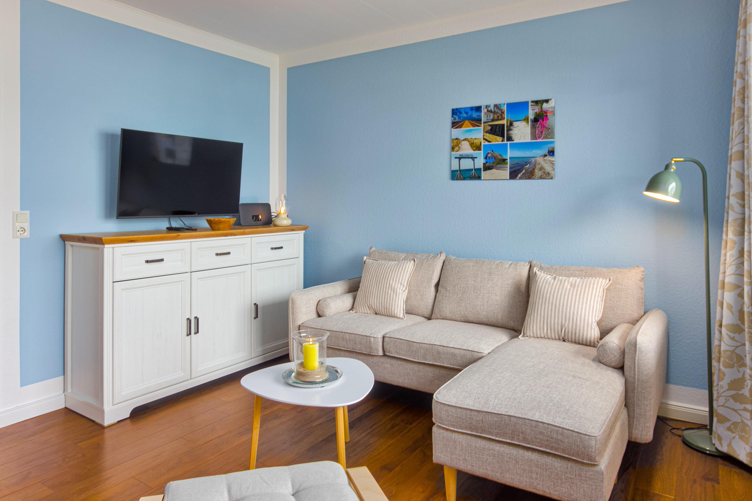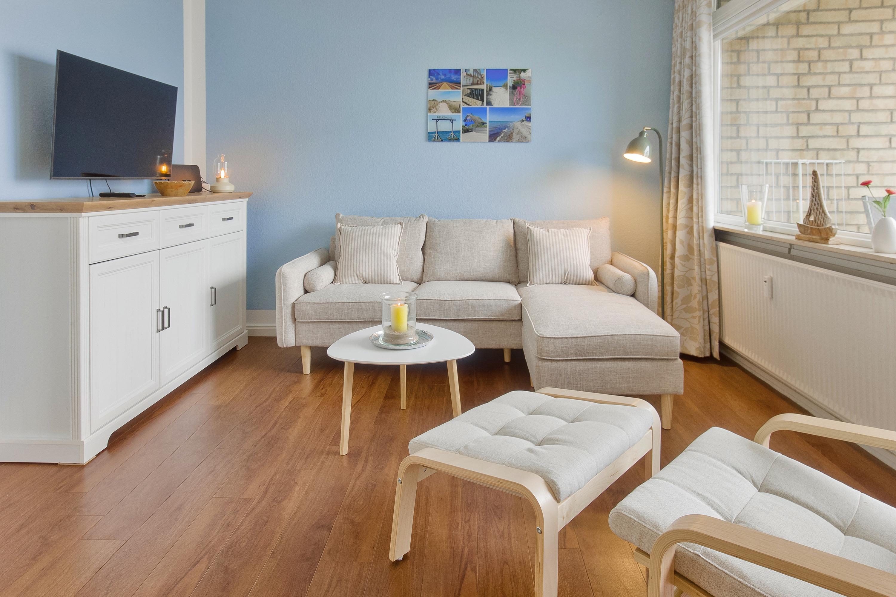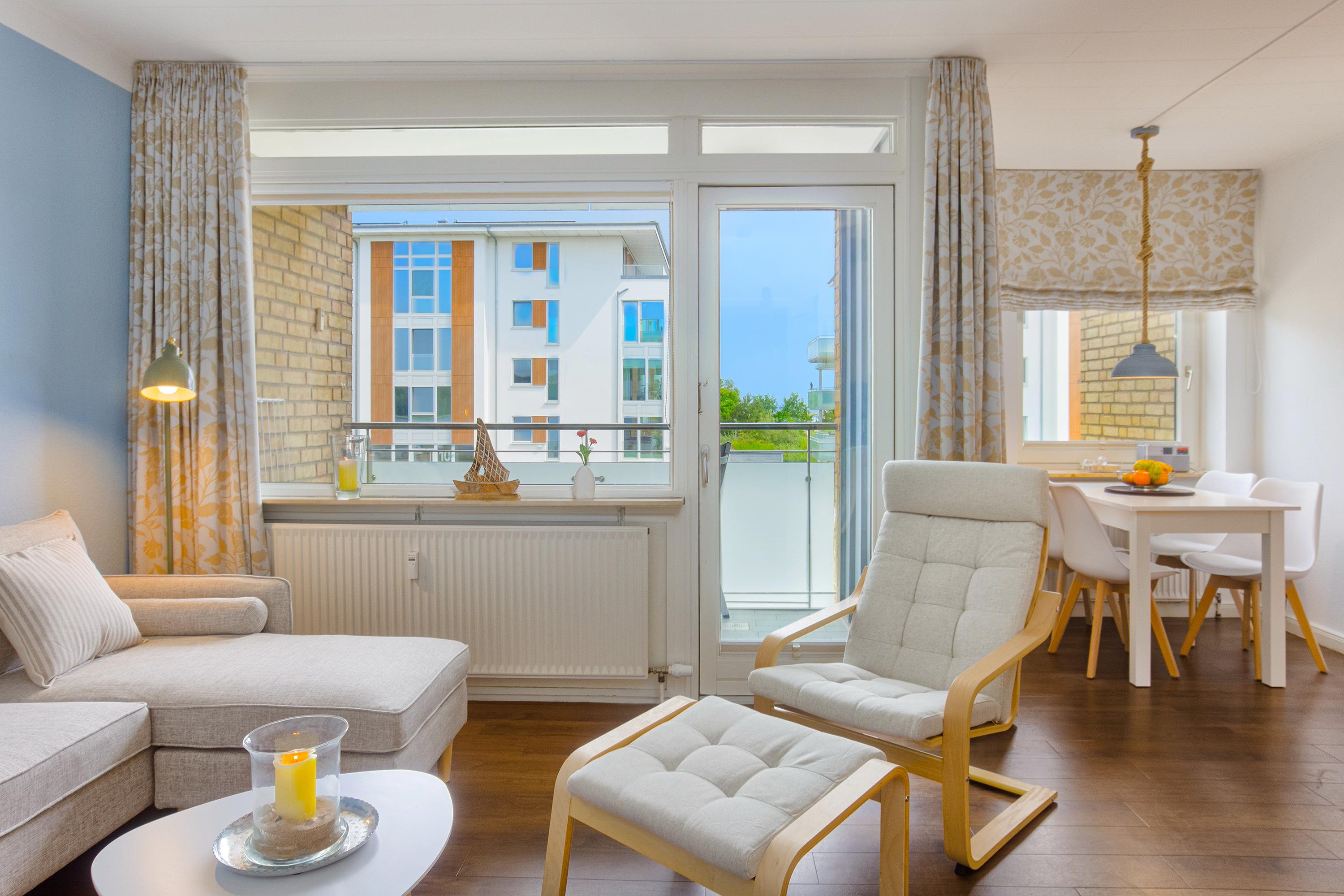 Der Wohnbereich ist das Herzstück der Wohnung. Hier können Sie auf der gemütlichen Couch entspannen oder gemeinsam am Esstisch sitzen. Die Einrichtung in Naturtönen und ausgewählte Dekorationen schaffen eine behagliche Atmosphäre. Zur Ausstattung gehören ein Smart-TV und WLAN. Durch die charmanten Fenster hat man einen direkten Blick auf die Ostsee.