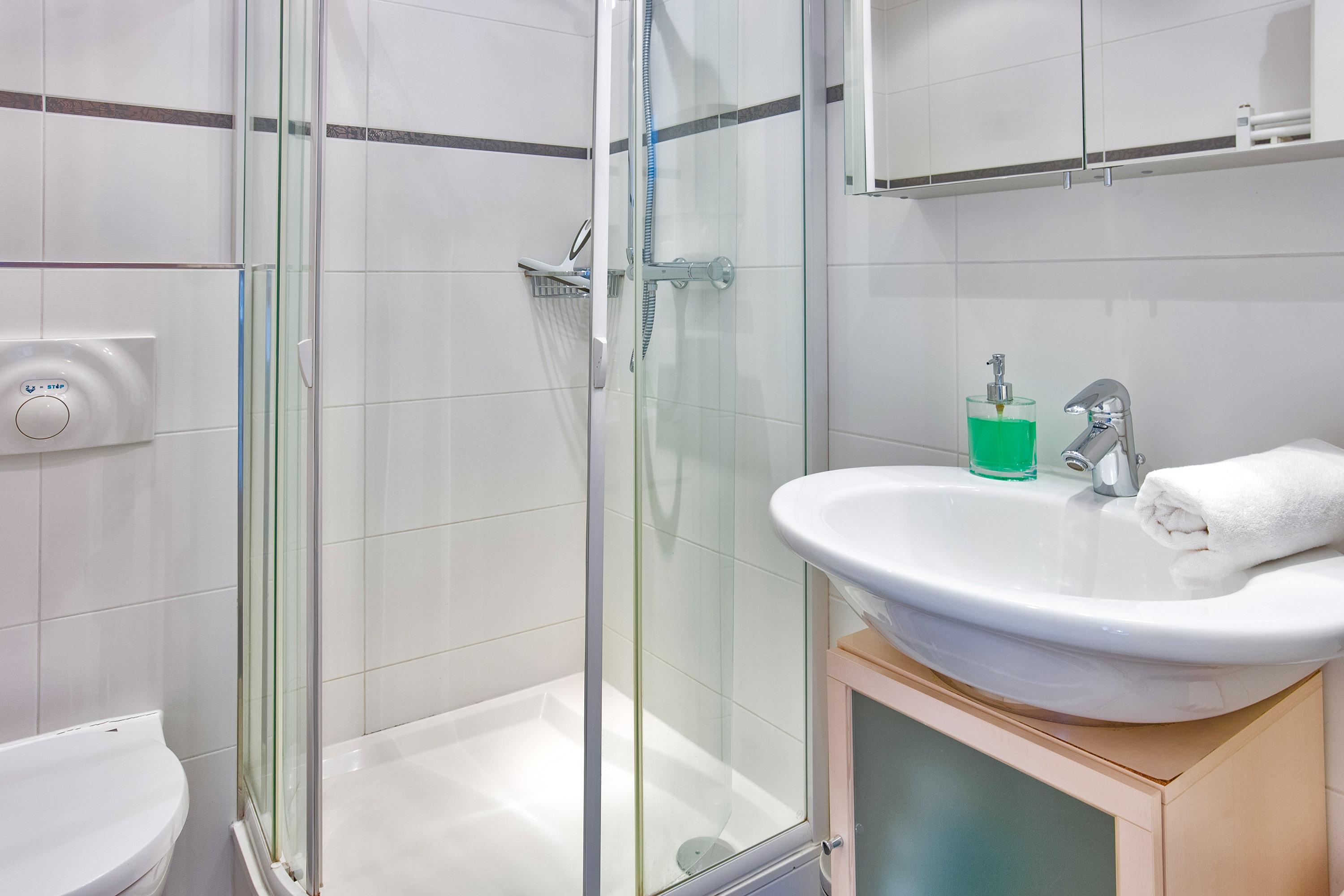 Das moderne Duschbad neben dem Wohnbereich bietet zusätzlichen Komfort. Es ist ausgestattet mit Dusche, WC, Waschbecken, Spiegel und Handtuchwärmer. Im Erdgeschoss des Hauses steht ein Gemeinschaftsraum mit Waschmaschine und Trockner (jeweils gegen Gebühr), sowie Bügelbrett und Bügeleisen zur Verfügung.