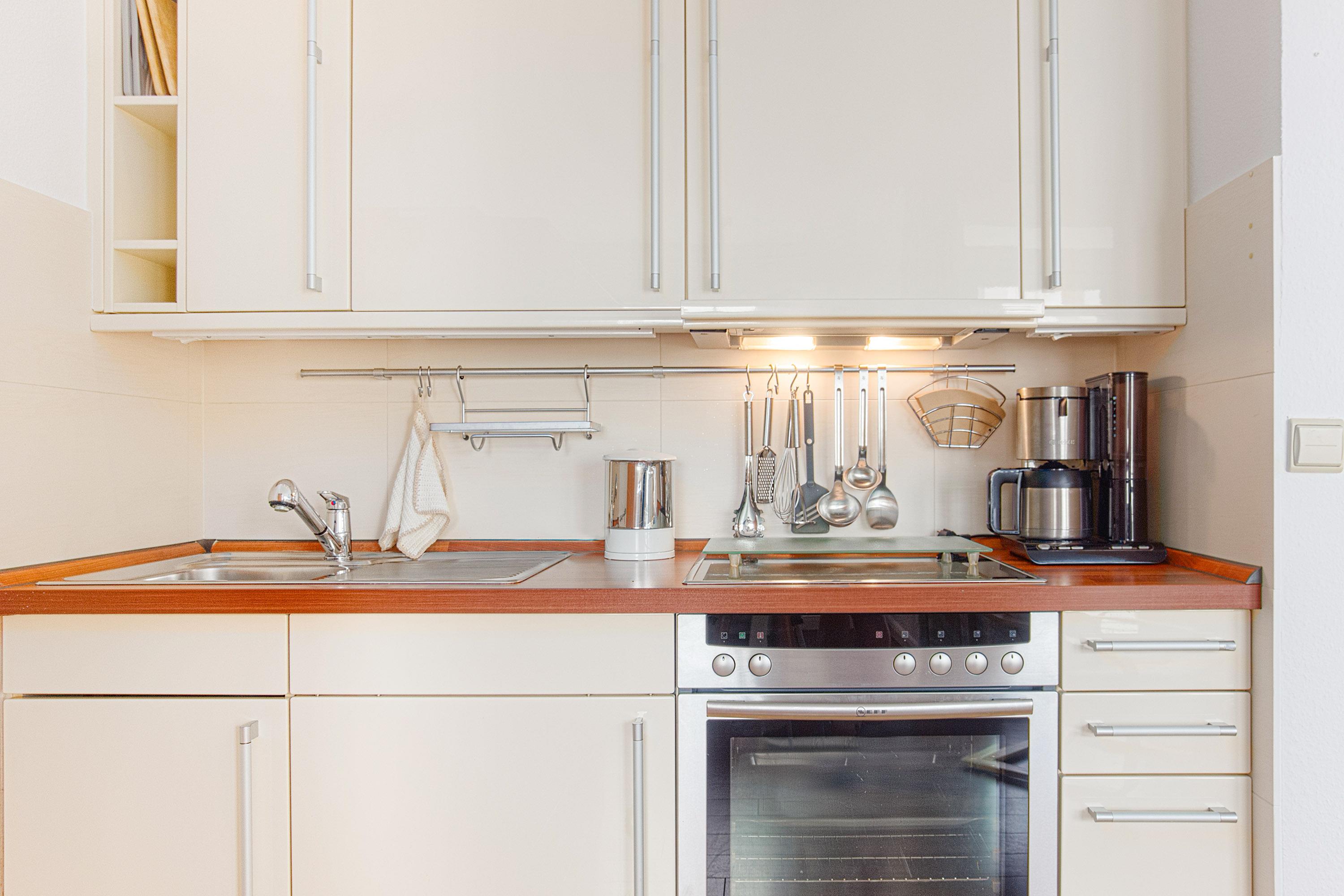 Die moderne Küchenzeile ist in den Wohnbereich integriert und bietet alle Annehmlichkeiten für eine bequeme Selbstversorgung.