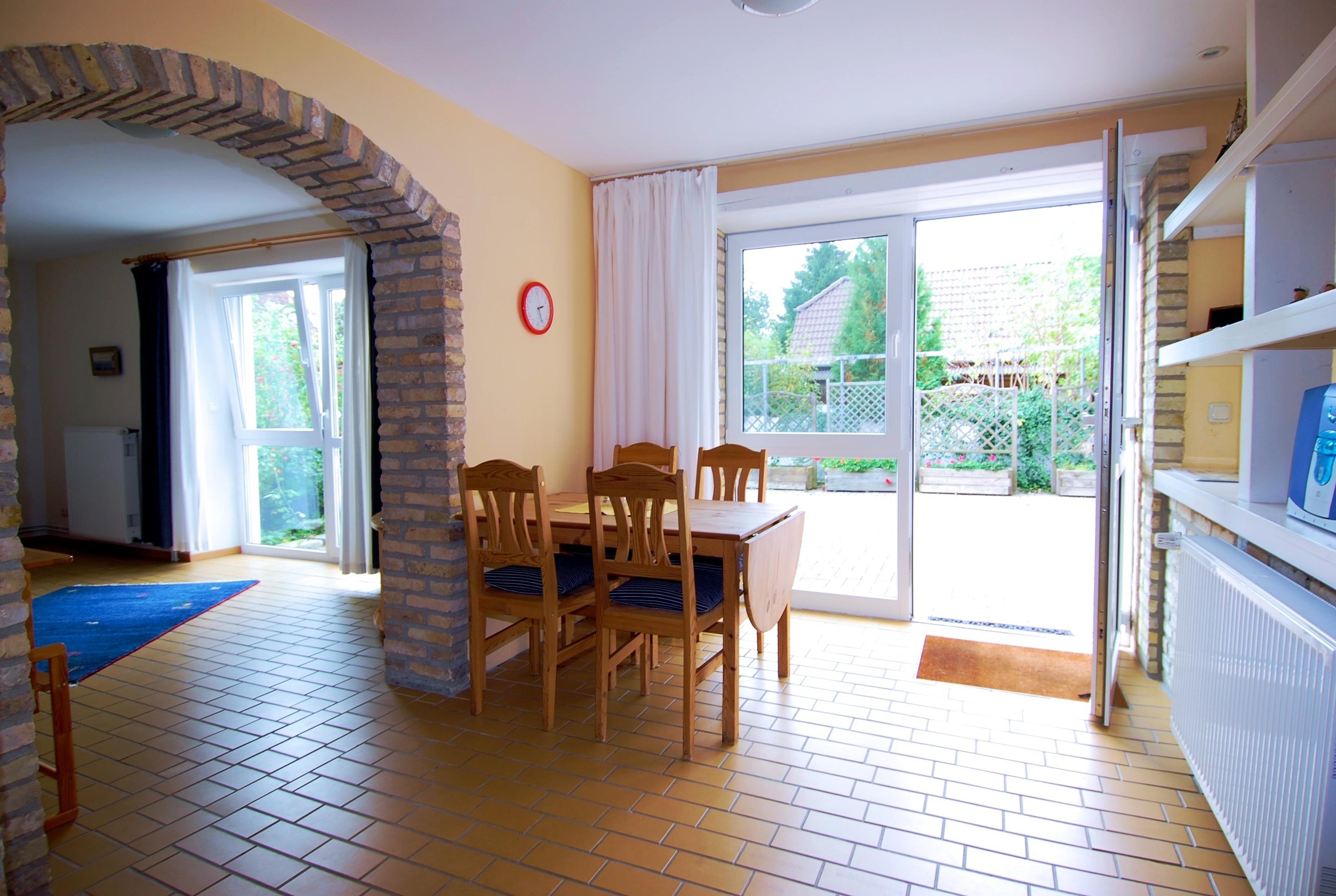 Vor der Wohnung befindet sich ein nach Westen ausgerichteter Terrassenbereich, der mit Gartenmöbeln ausgestattet ist. Dieser lädt dazu ein, sonnige Nachmittage oder laue Abende im Freien zu genießen. Der großzügige Gartenbereich des Hauses trägt zusätzlich zur entspannten Atmosphäre bei.