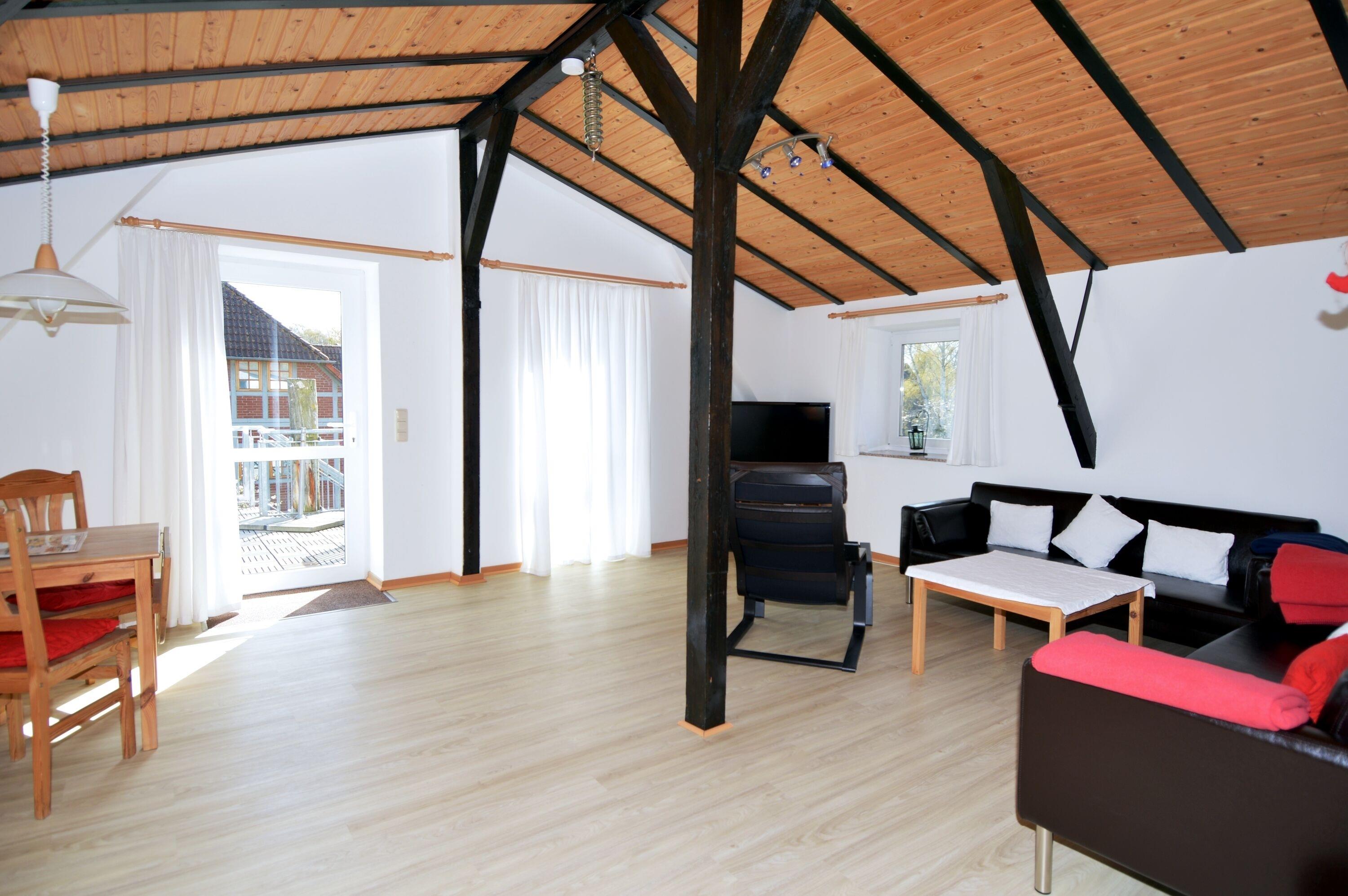Herzstück der Wohnung ist der helle Wohn- und Essbereich, der mit einer gemütlichen Couch, einem Sessel sowie einem Esstisch ausgestattet ist. Hier können Sie entspannen, gemeinsam essen oder gemütliche Abende verbringen. Ein Fernseher, WLAN / WiFi sowie ein Radio sorgen für Unterhaltung und Komfort während Ihres Aufenthaltes.